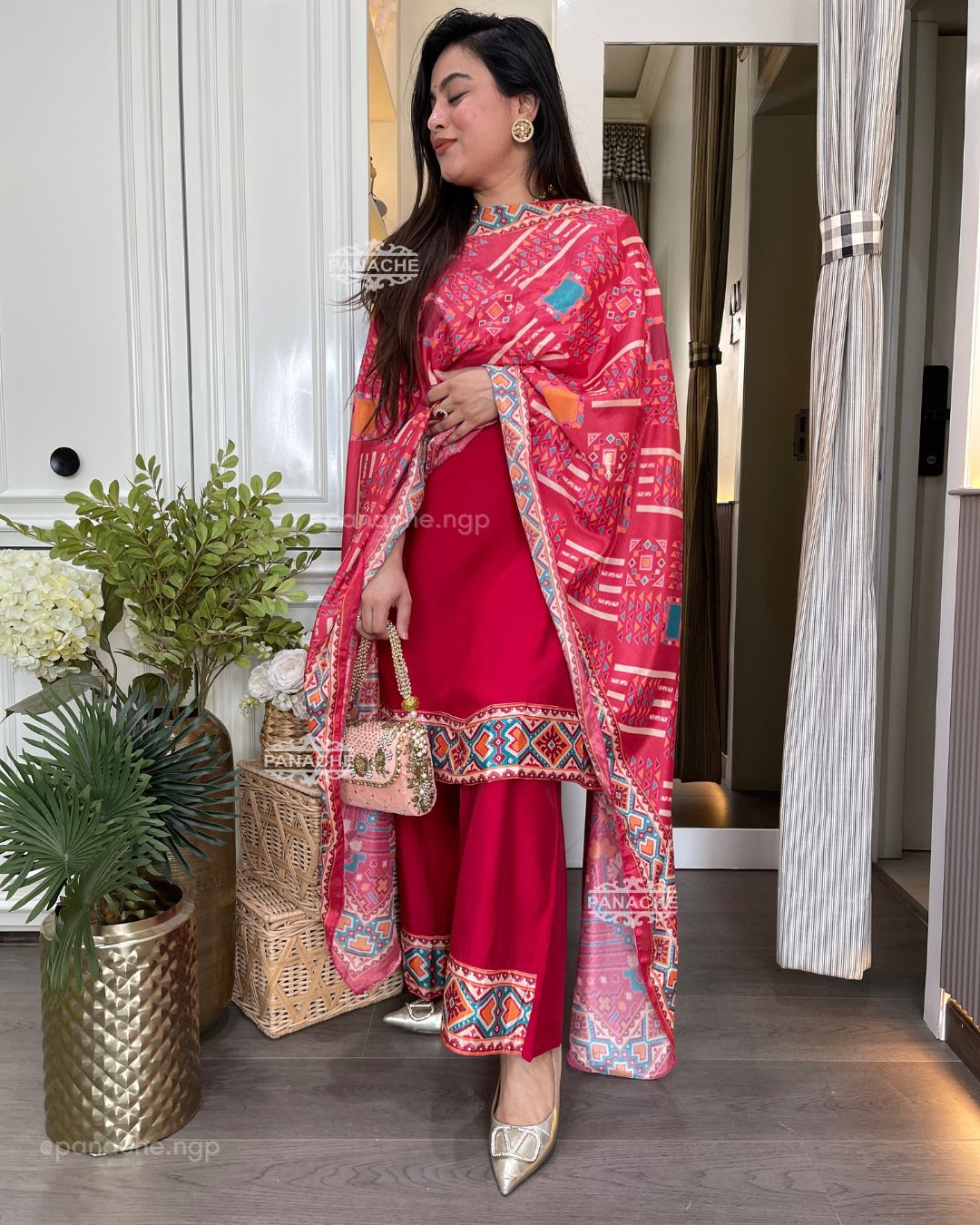 🟣 Kali kurta and plaso, with ikkat on neckline sleeves and Daman, ikkat dupatta in orgenza