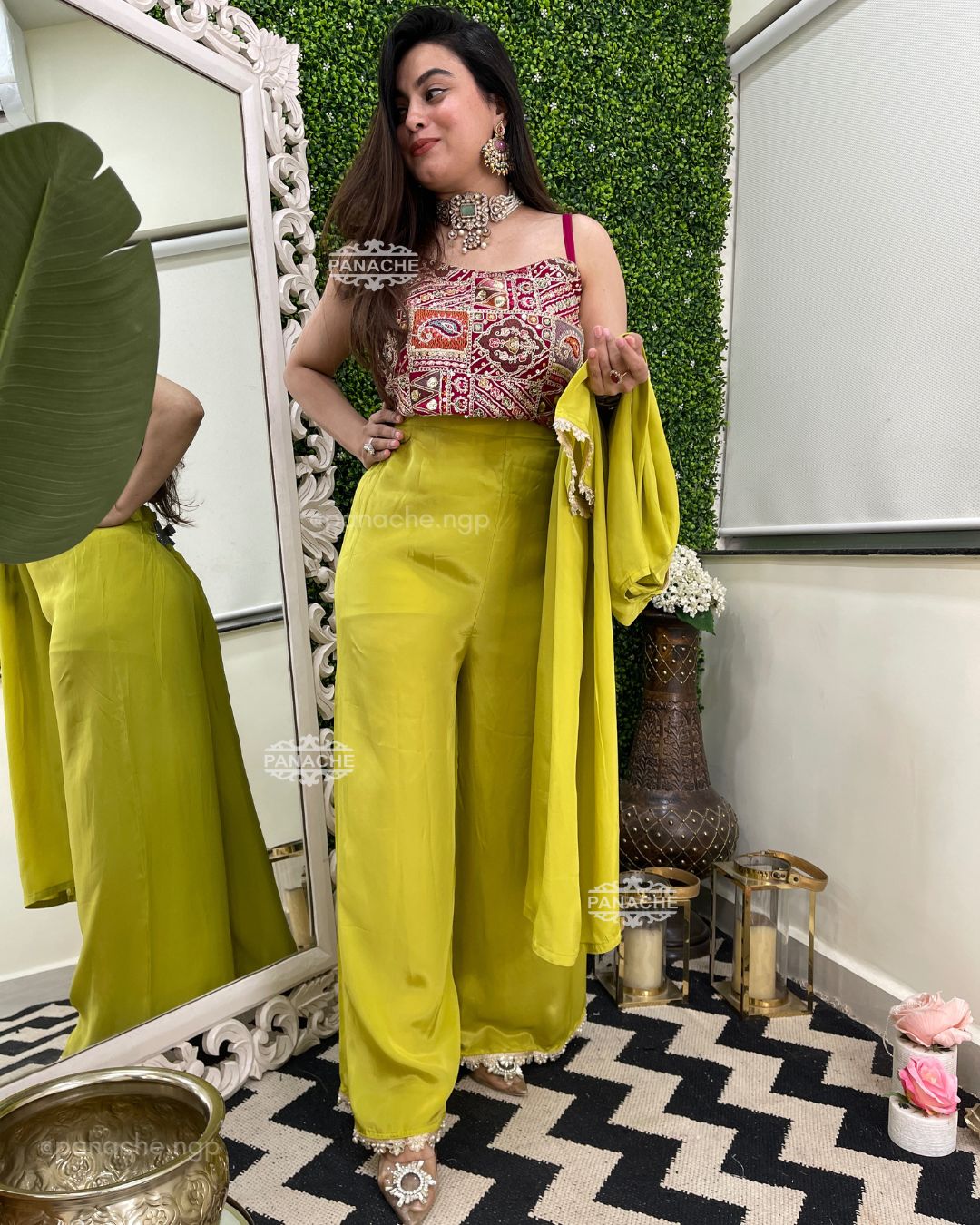 🟣 Crop top with jaal embroidery and chinnon top and plaso