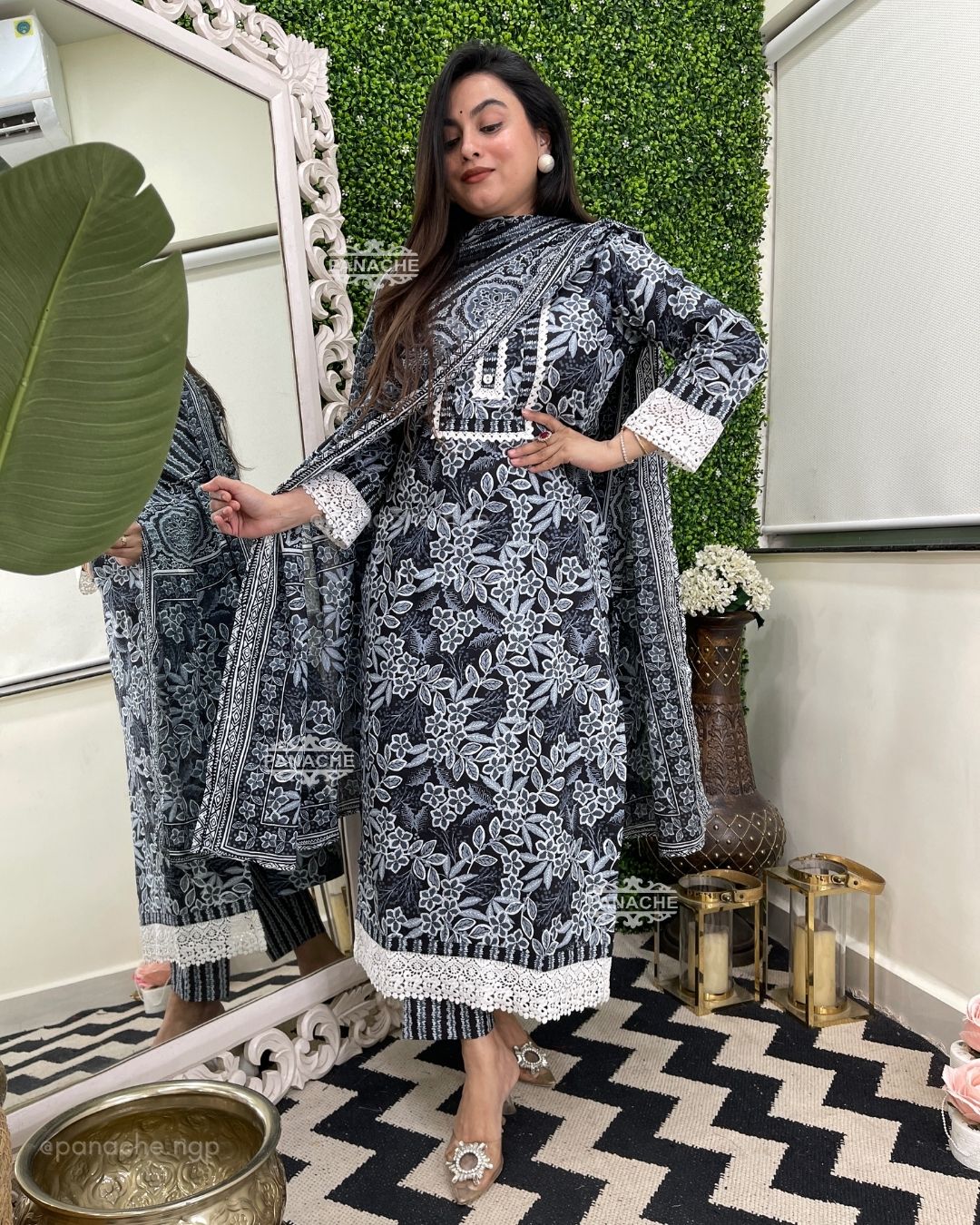 🟣 Detailed crosia neckline & sleeves with same Daman , print on print concept