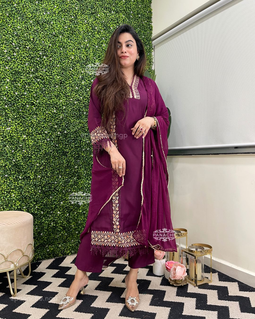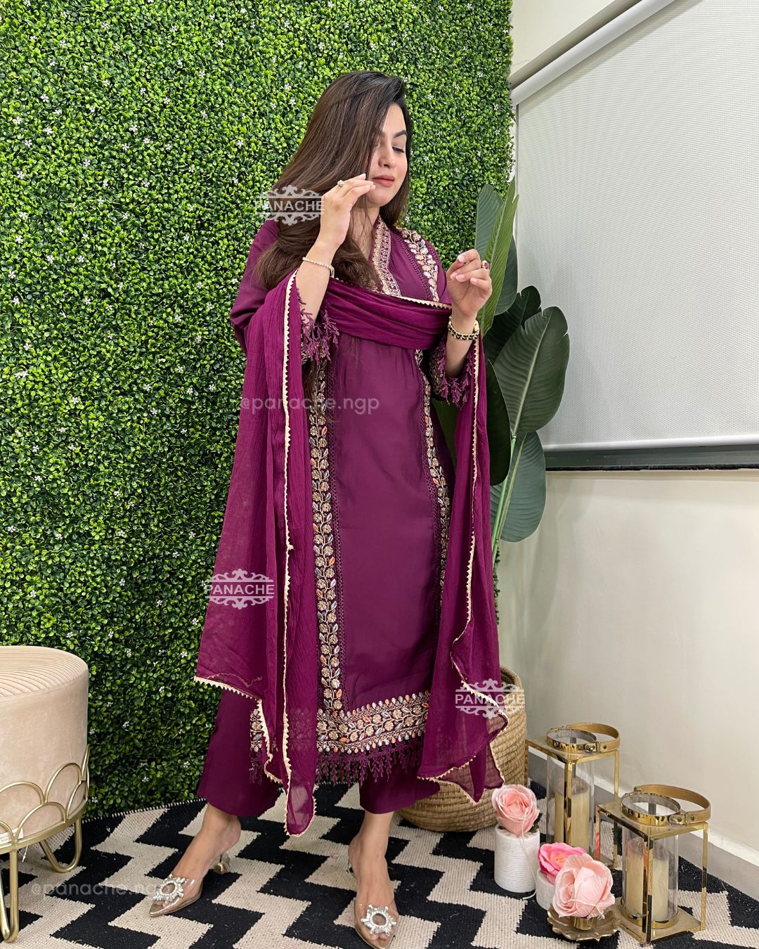 🟣 Multi Crosia details on kurta with laces and plain pants