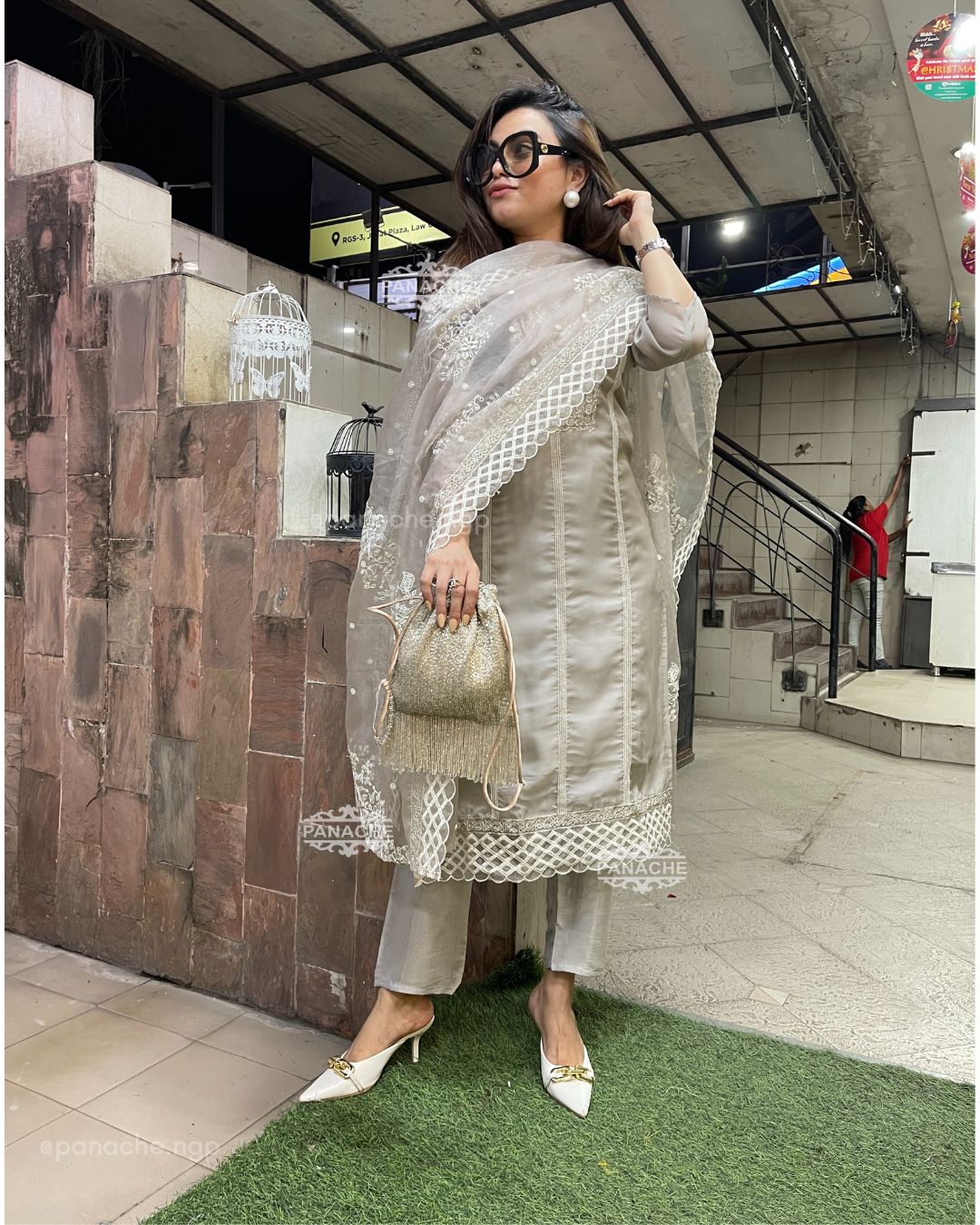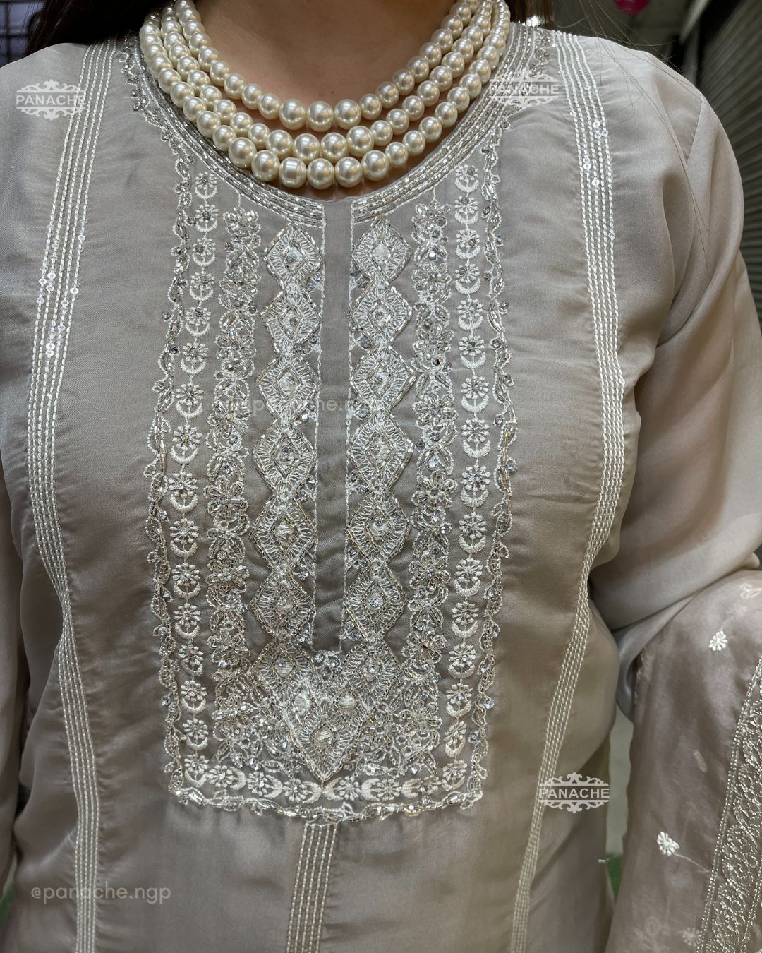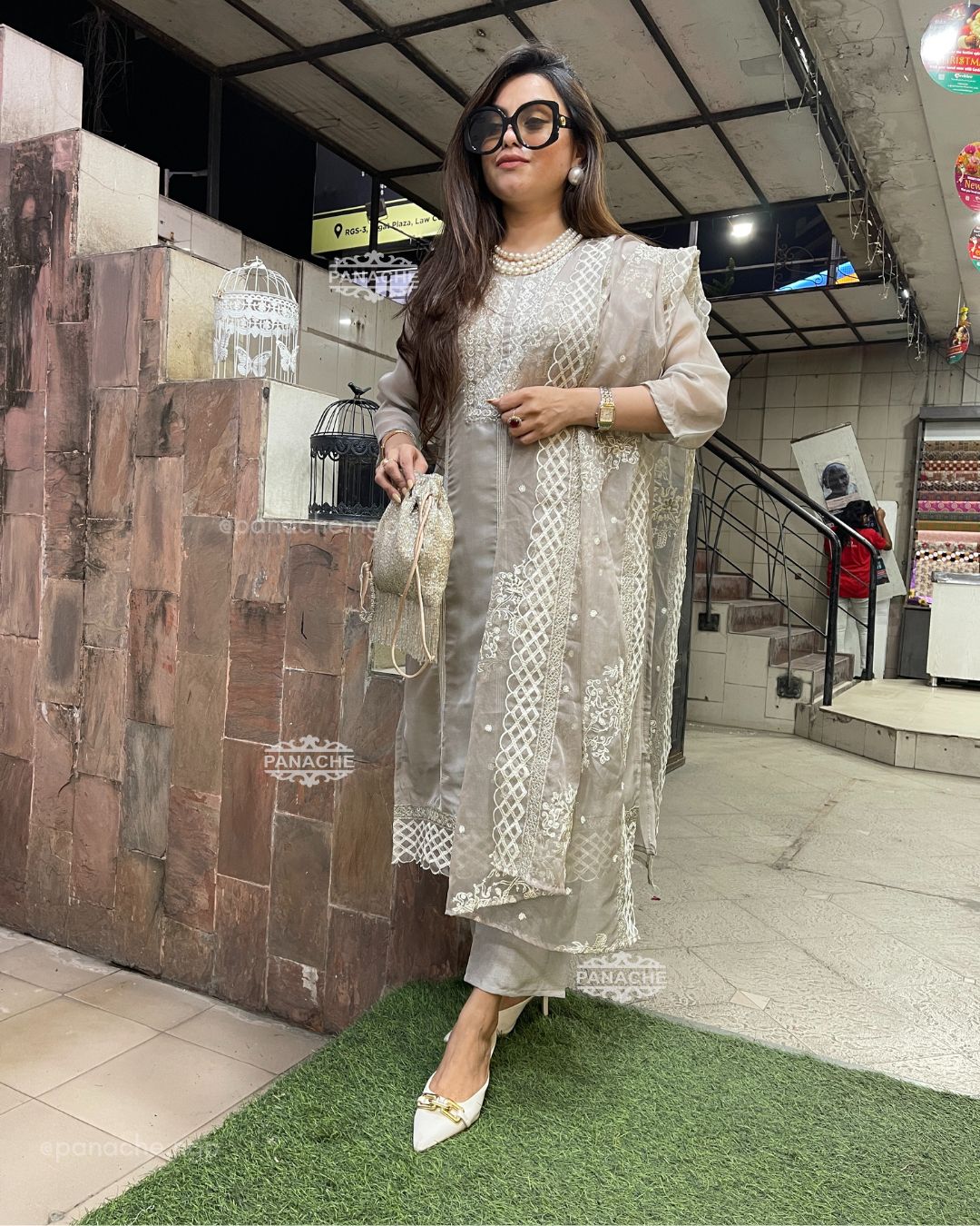 🟣 Today’s classy, elegant vibes is this Orgenza set with Lucknowi threadwork embroidery with Cut pipe highlights on neckline