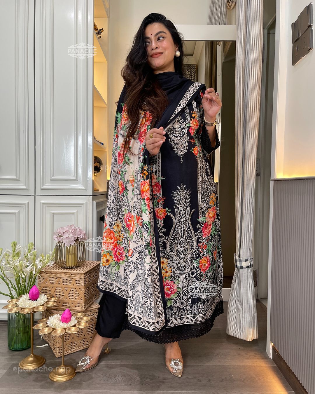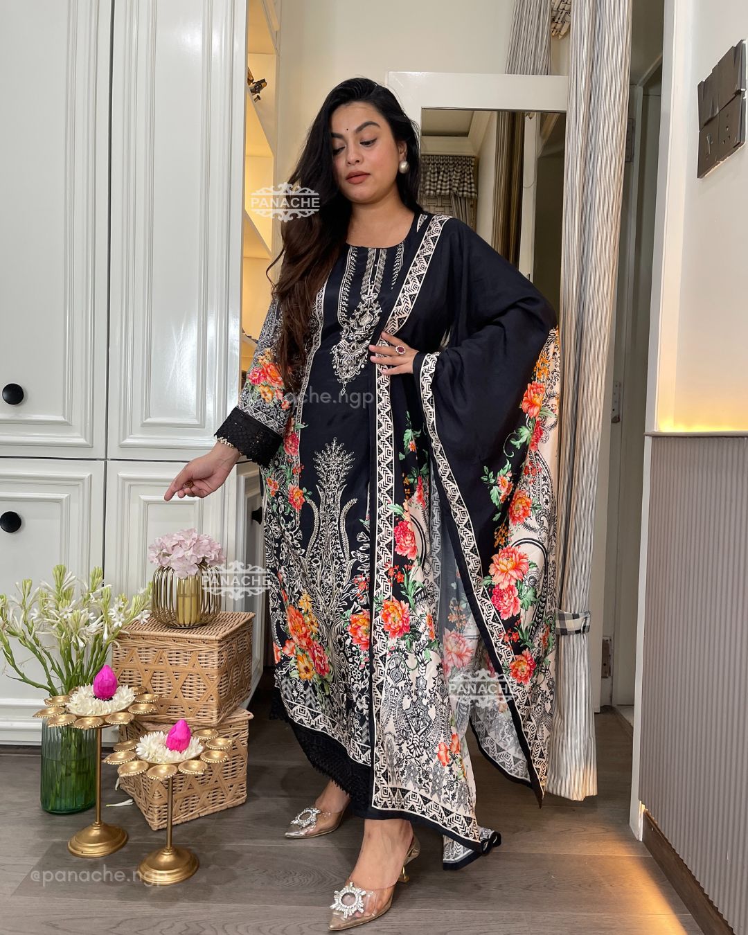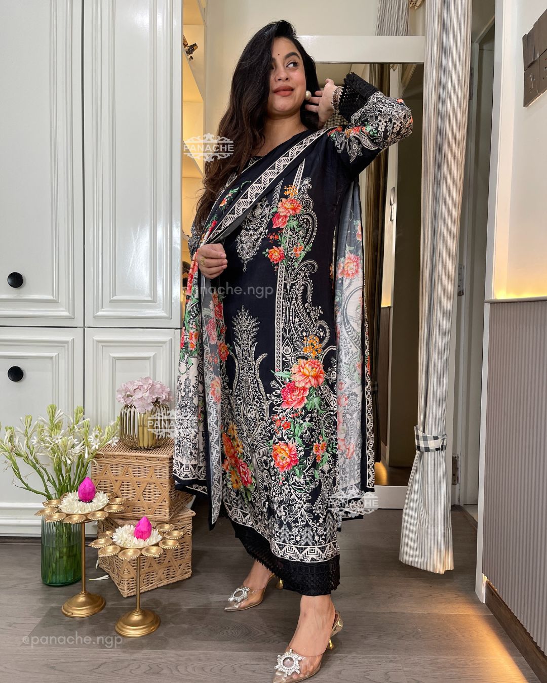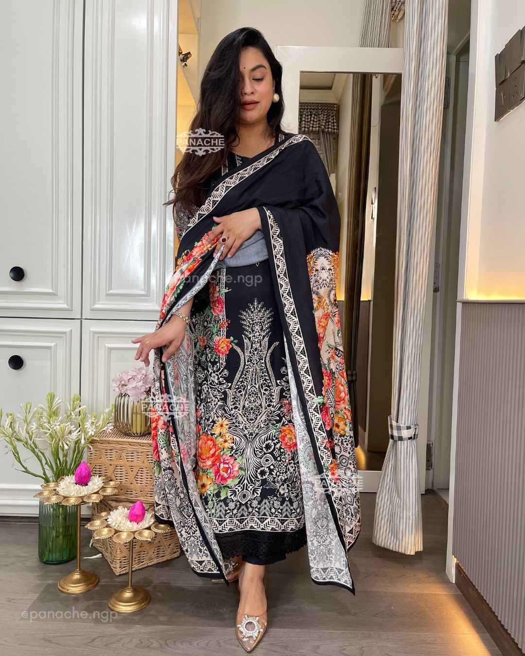 🟣 Front and back printed set with a placement print on kurta front back with plain pants and printed dupatta, crosia details in Daman of kurta and sleeves