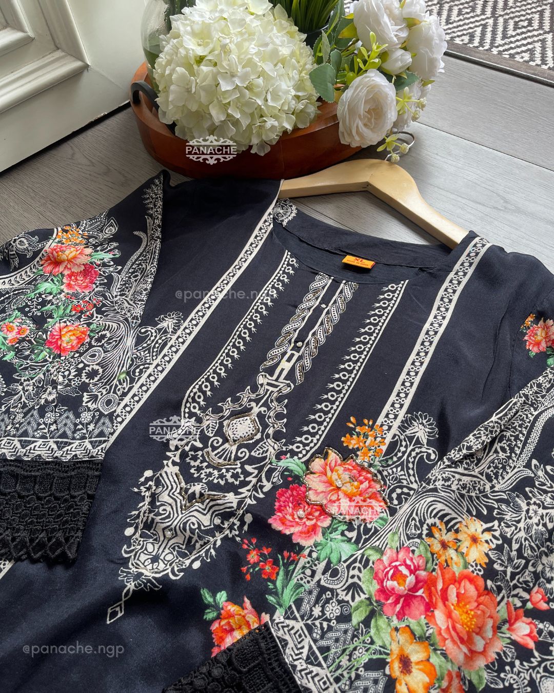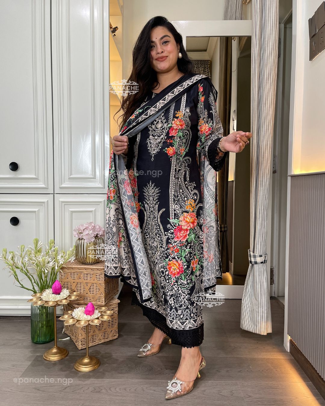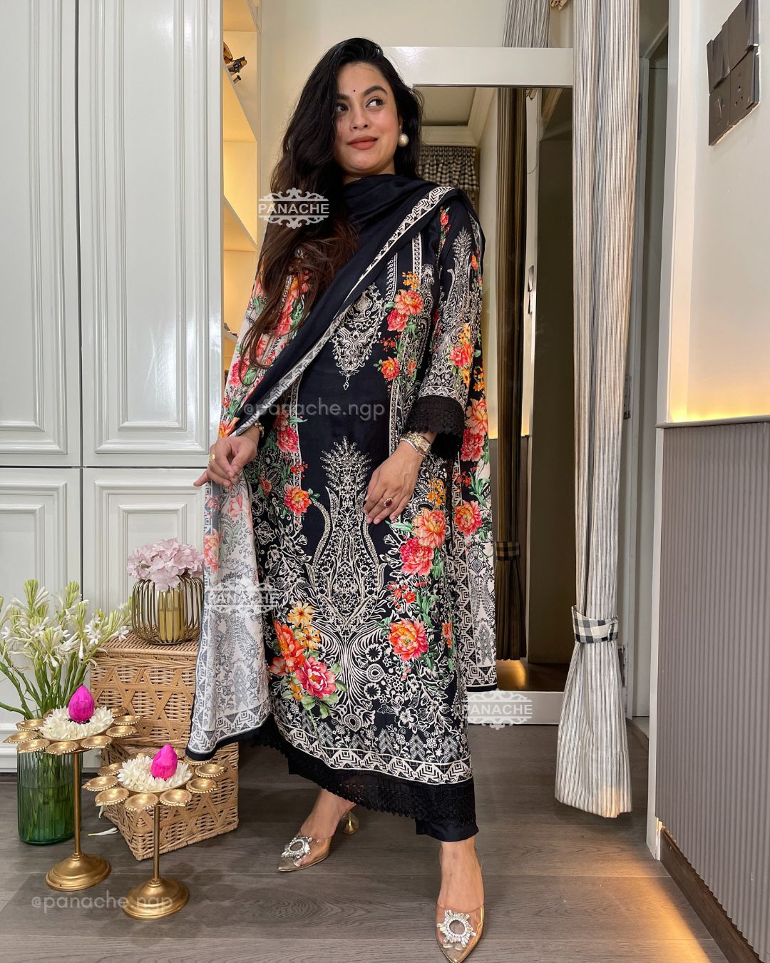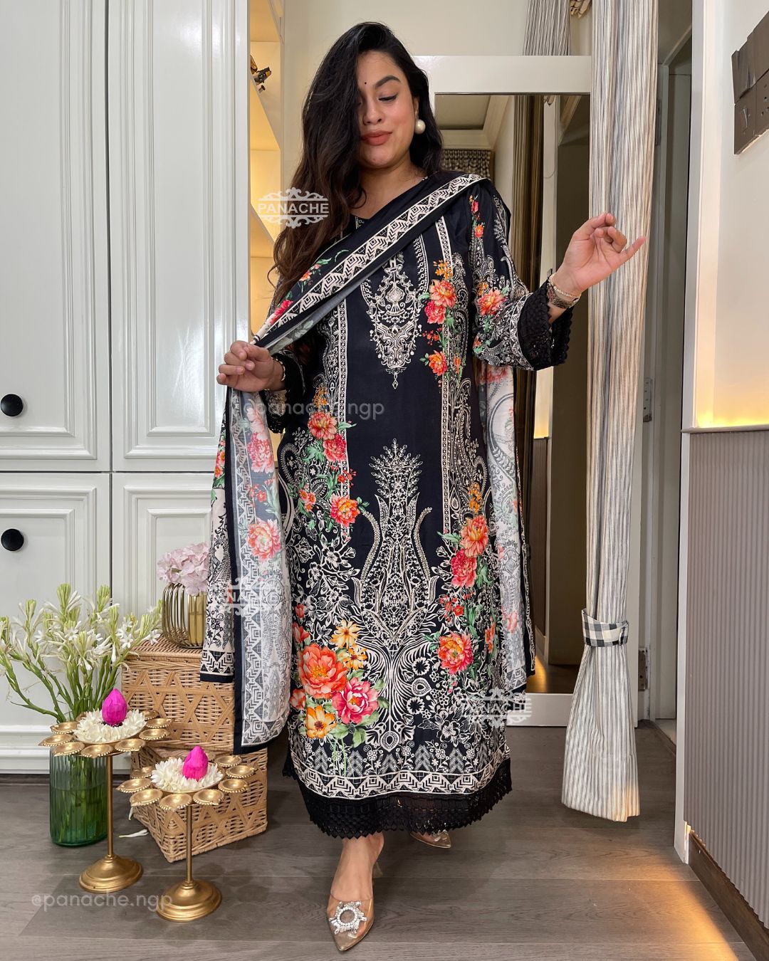 🟣 Front and back printed set with a placement print on kurta front back with plain pants and printed dupatta, crosia details in Daman of kurta and sleeves