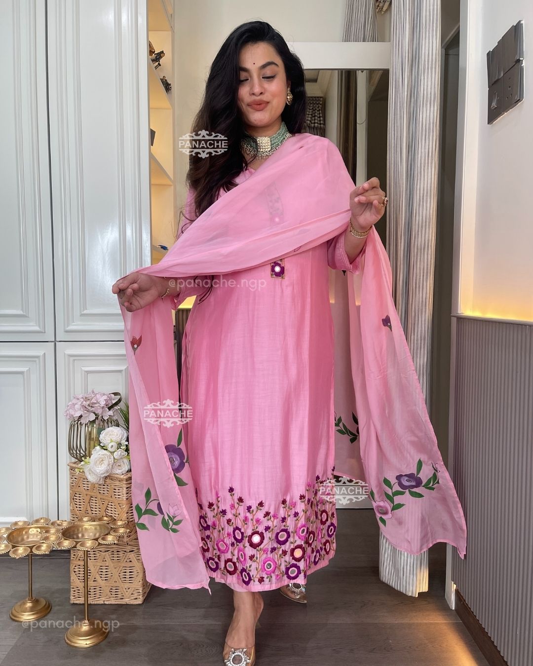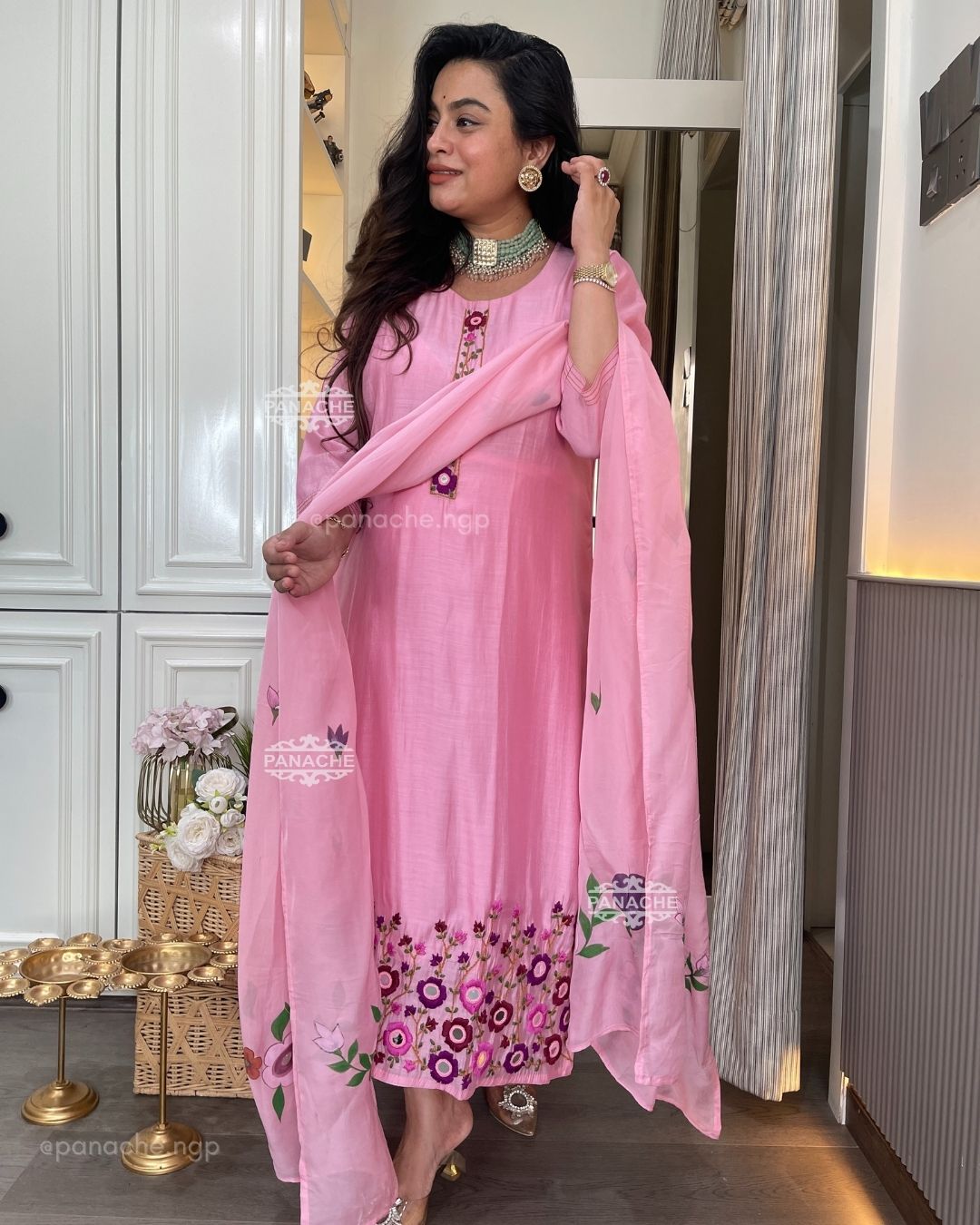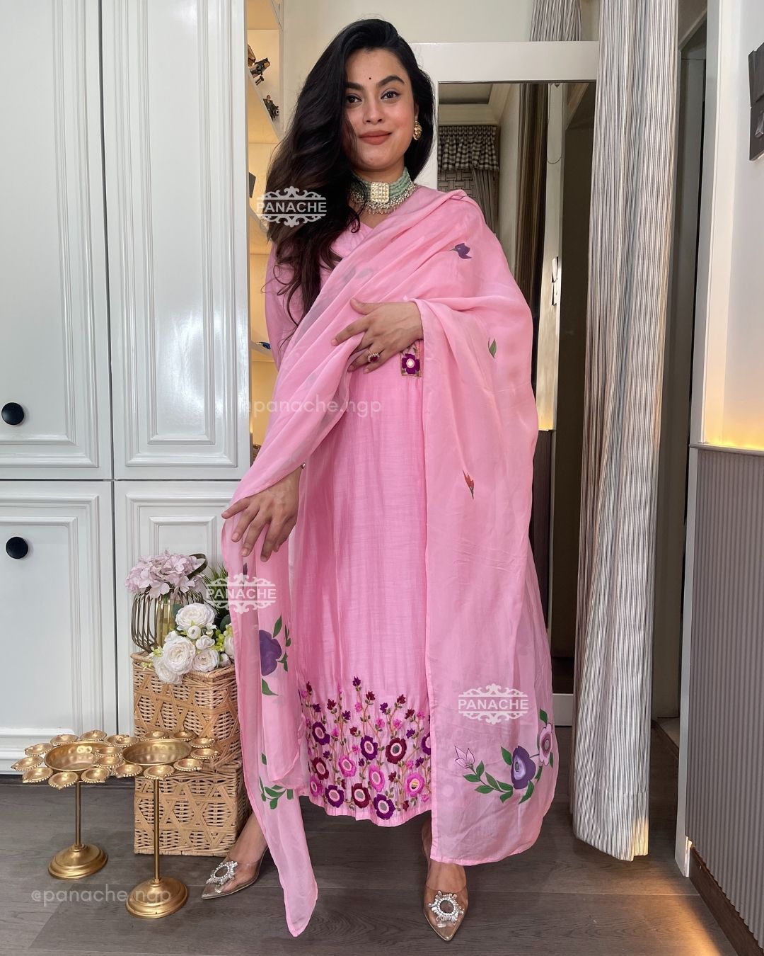 🟣 Intricate neckline with heavy Daman on kurta and hand painted dupatta with shimmer highlights