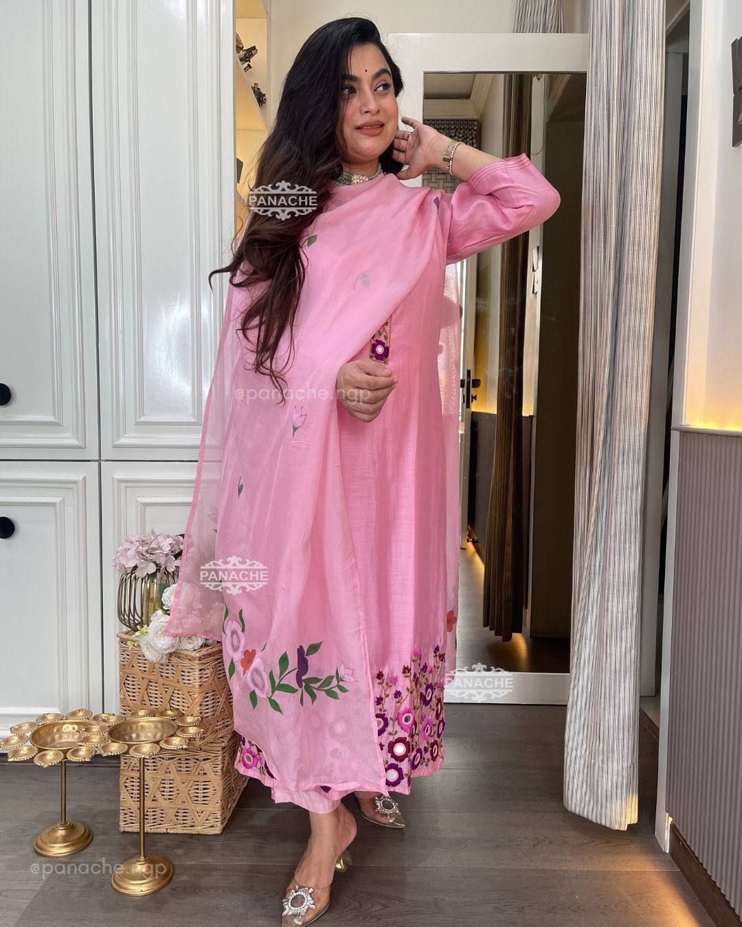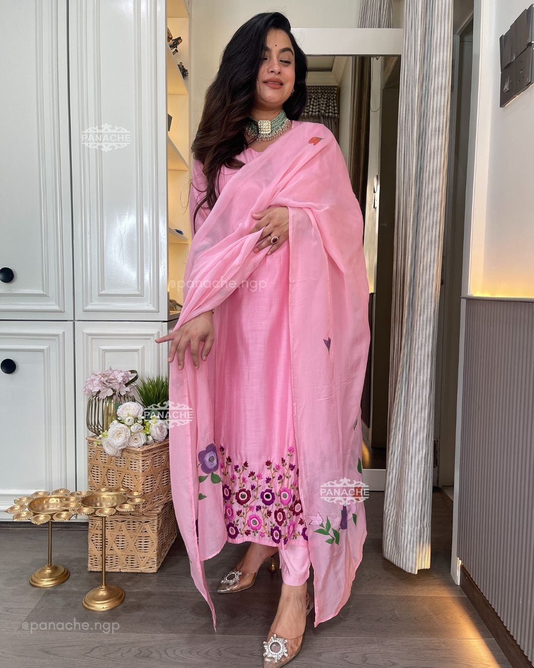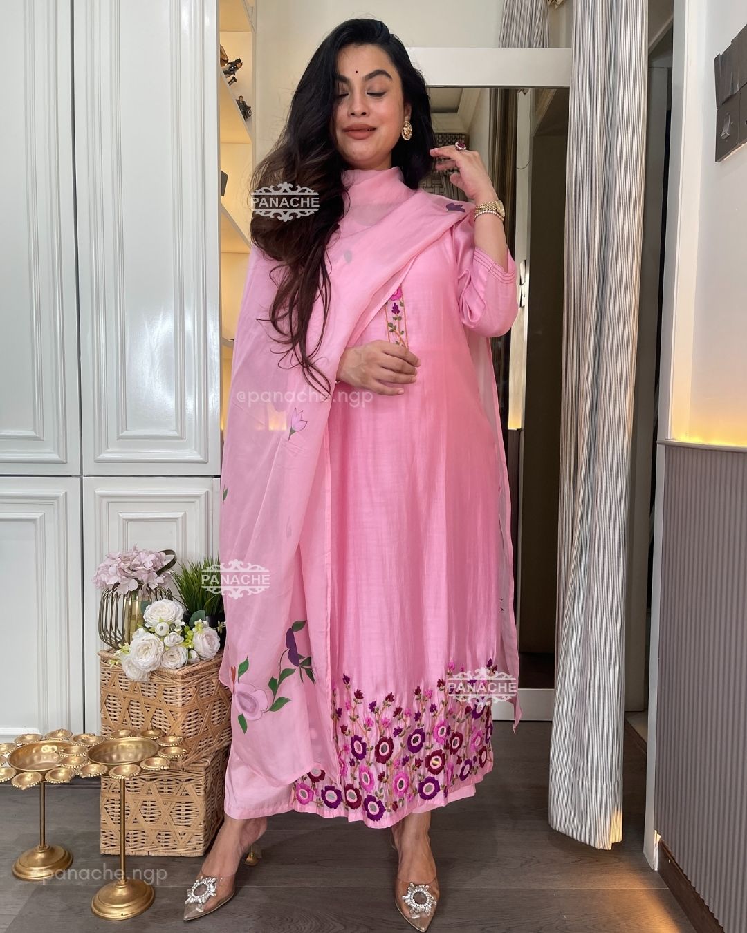 🟣 Intricate neckline with heavy Daman on kurta and hand painted dupatta with shimmer highlights