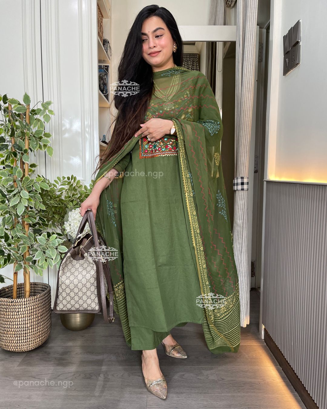 🟣 A lovely sage colour in organic cotton with hand painted chiffon dupatta and comfort of the world while you are anywhere ! Mirror work and thread work details by hand on kurta