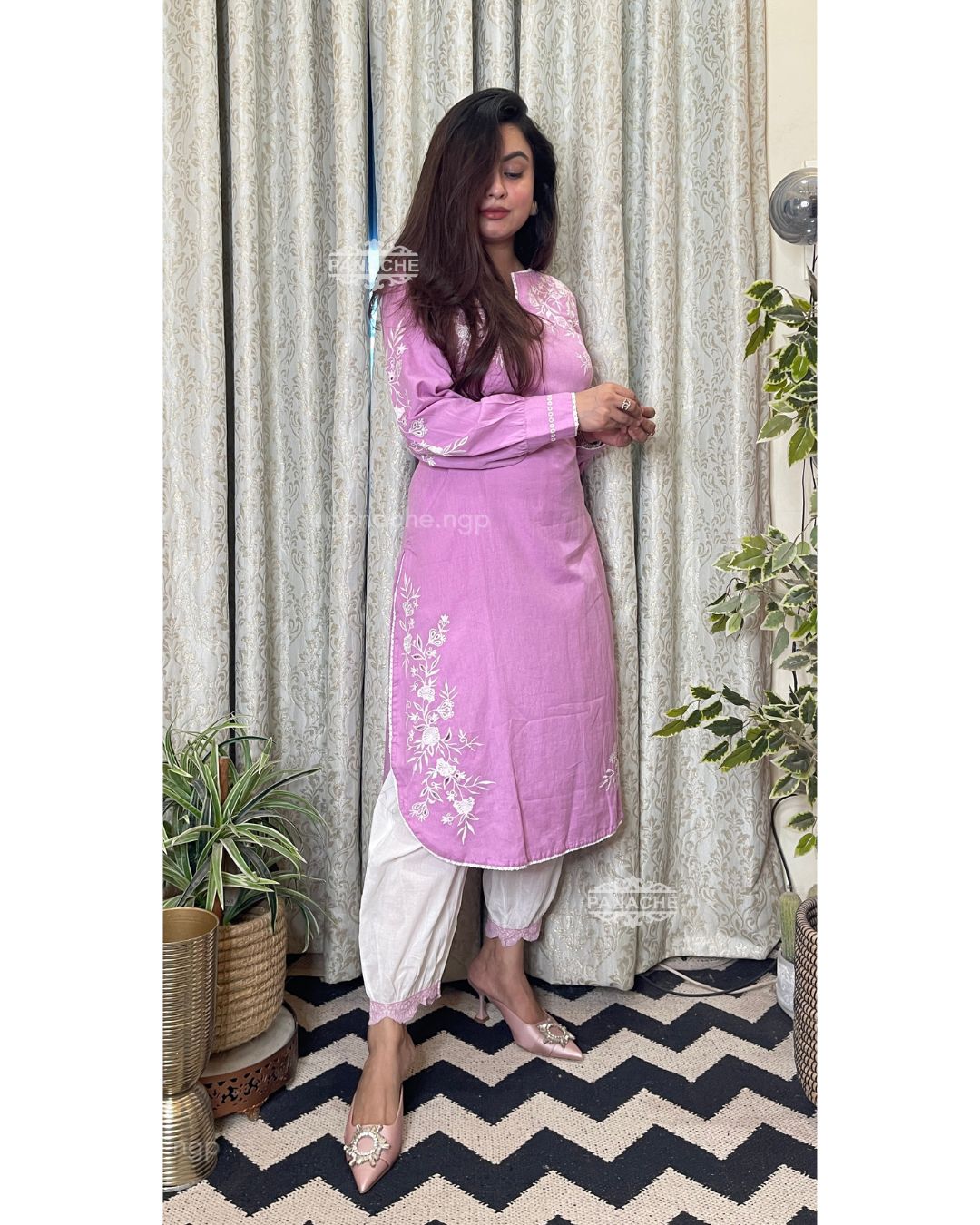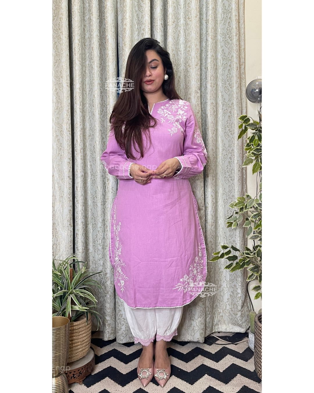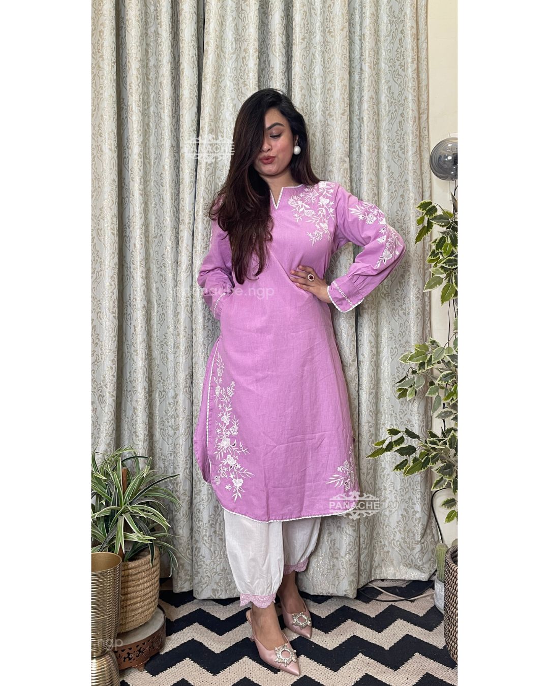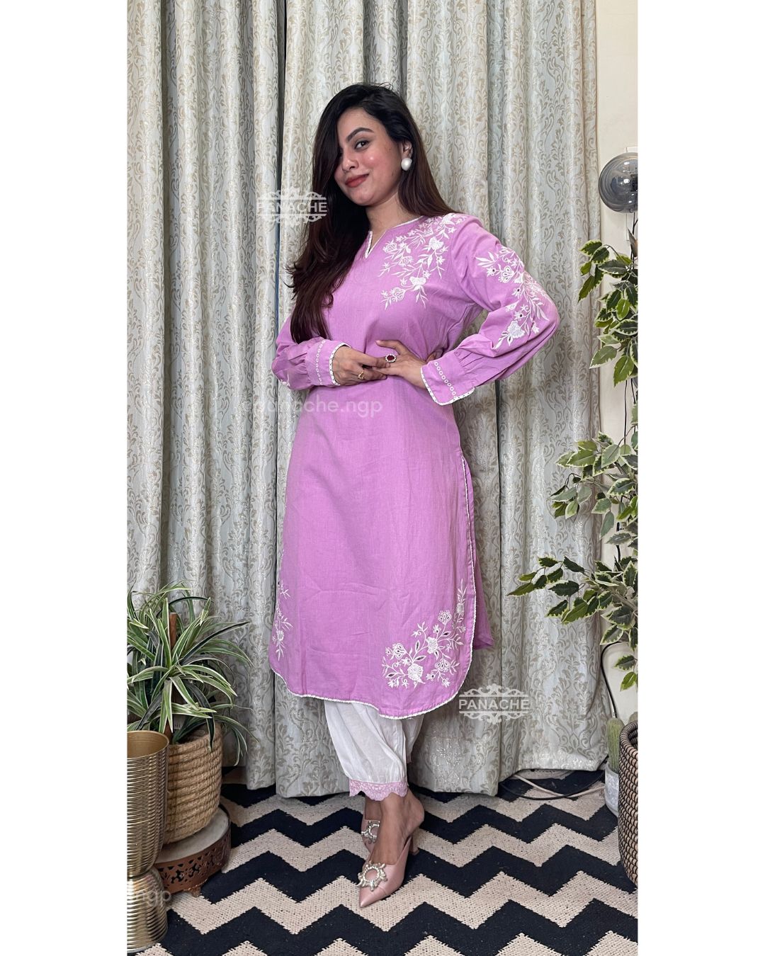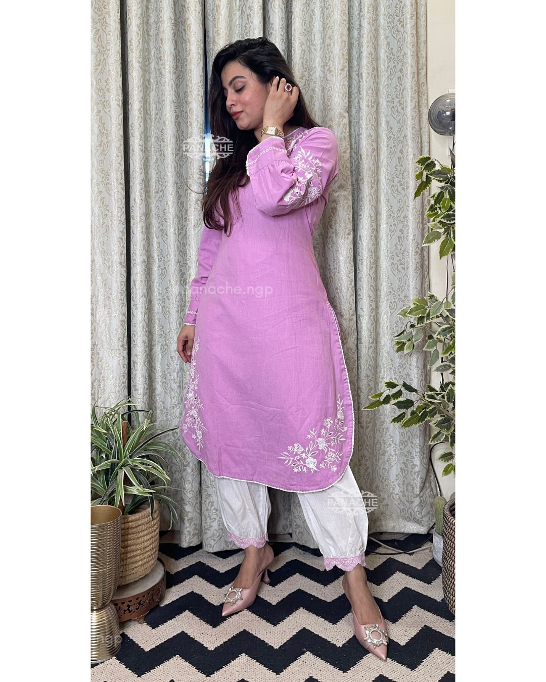 🟣 Soft embroidered kurta with neckline and puffy sleeves with embroidery and grip