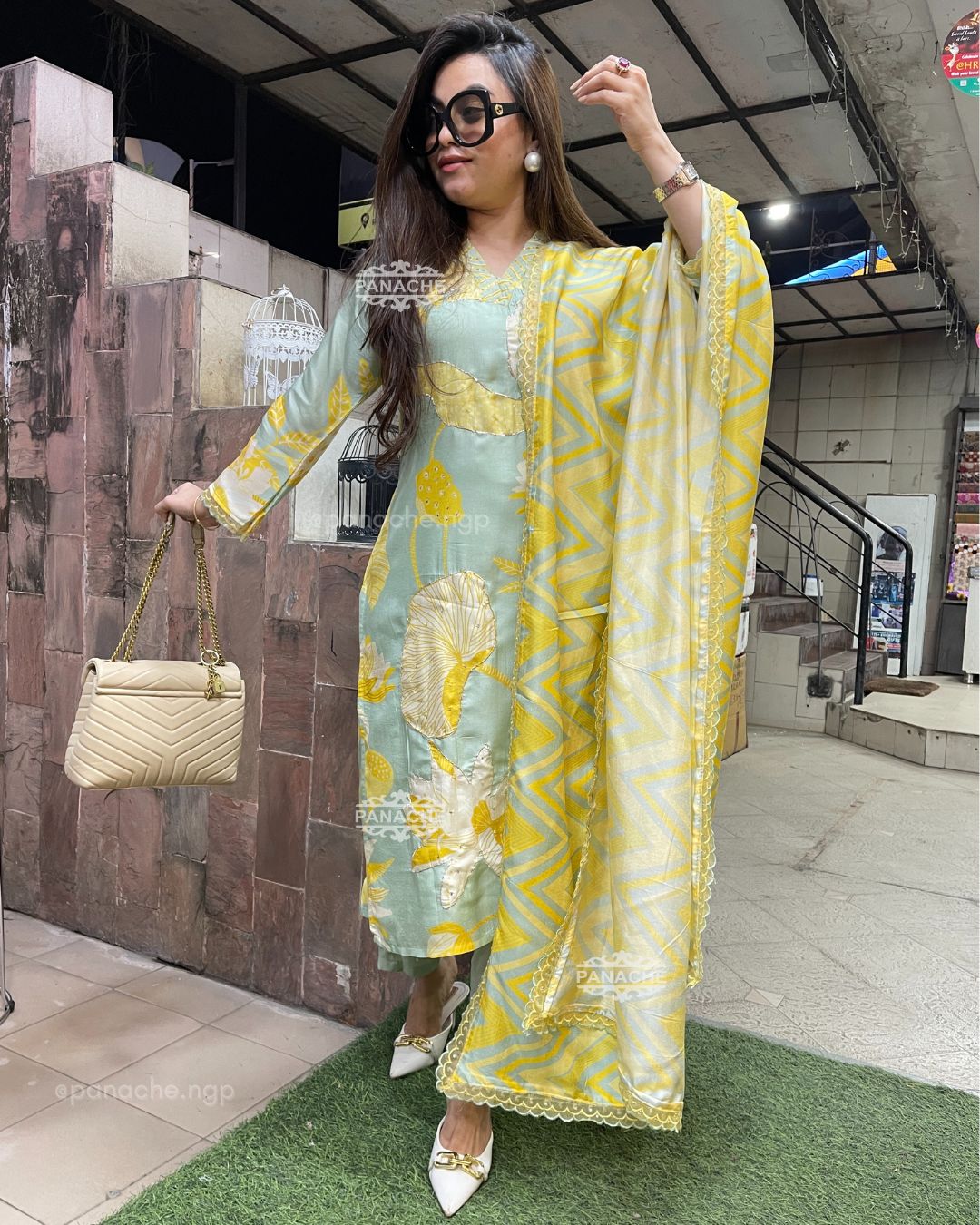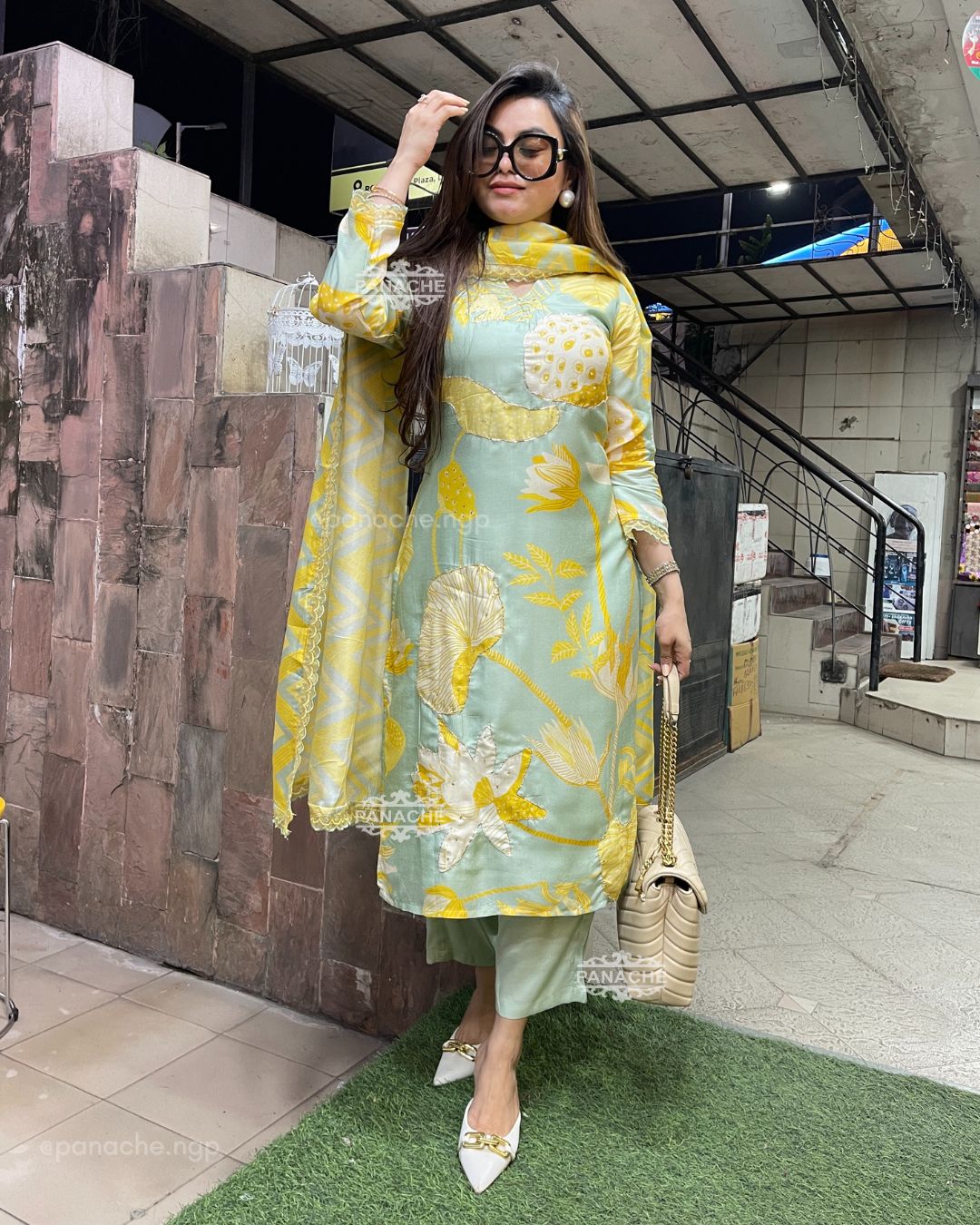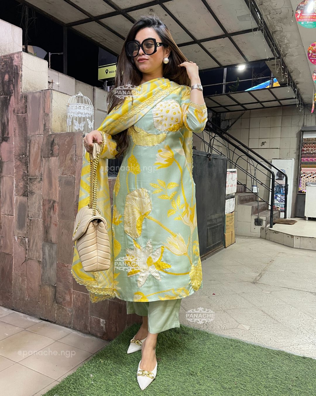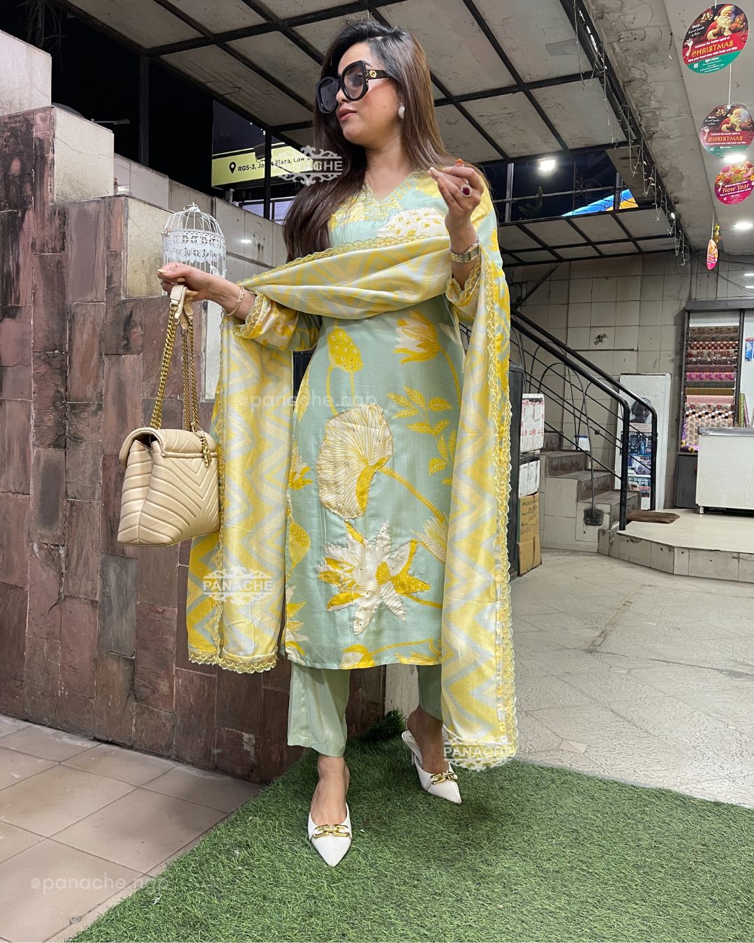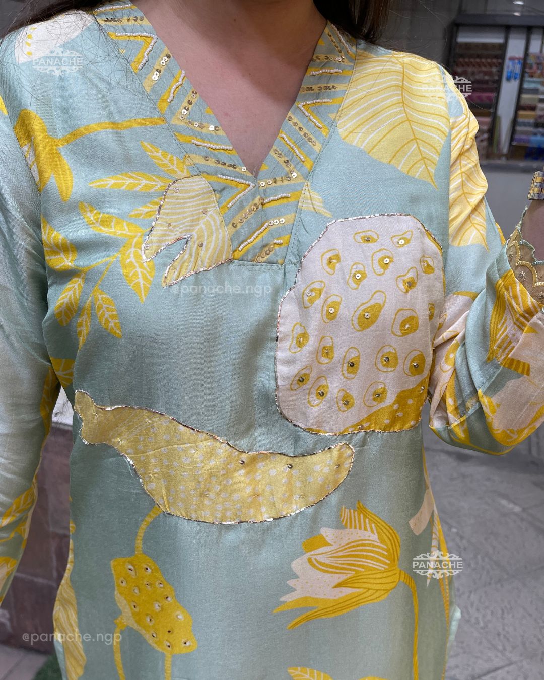 🟣 Printed kurta with nakshi pearl highlights on neckline amd kurta with Crosia details on sleeves, dupatta and plain pants