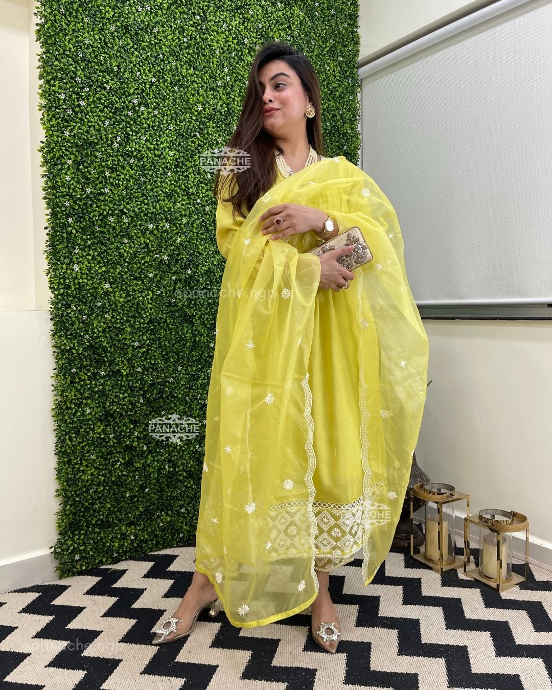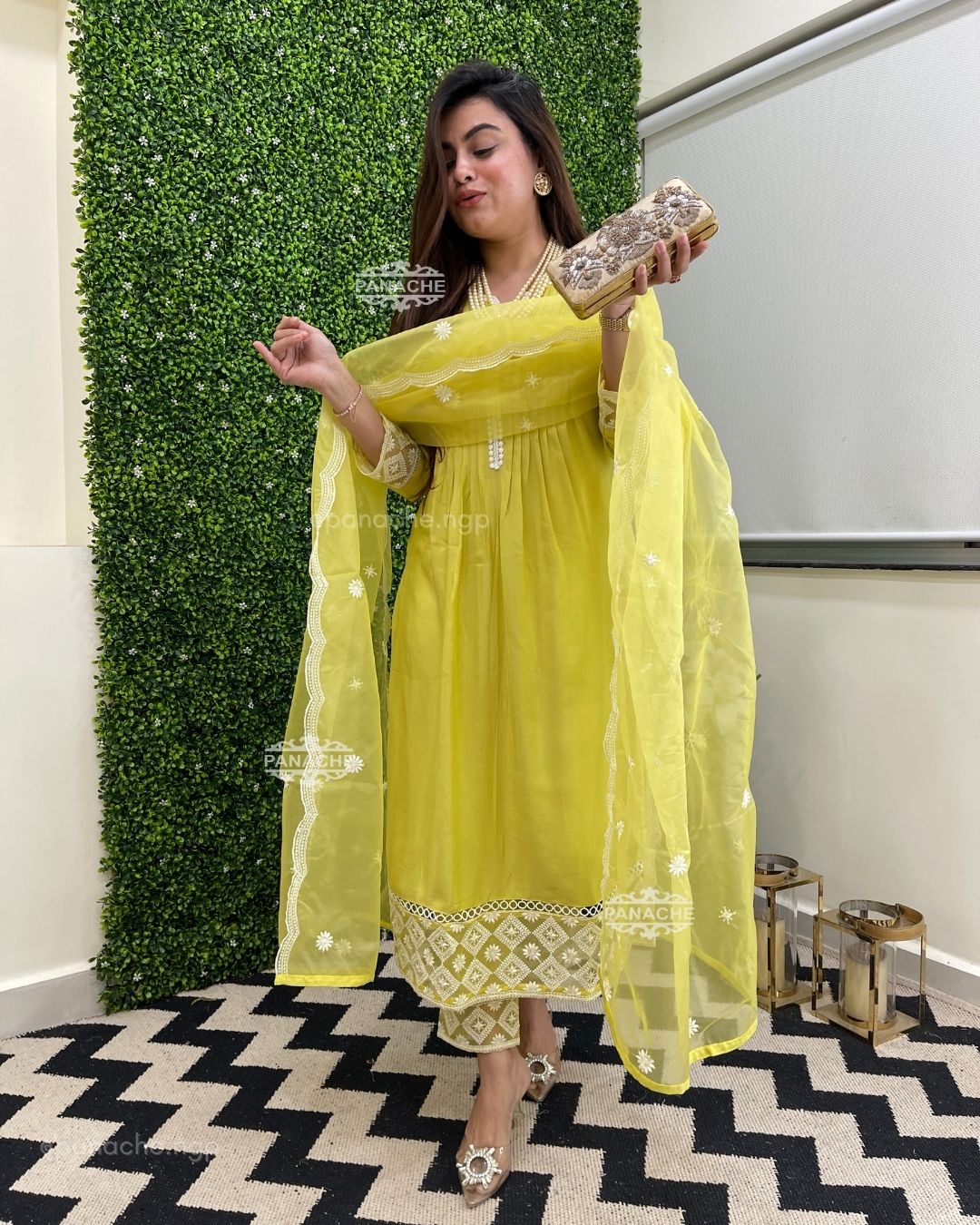 🟣 Intricate neckline with pleats around yolk to give a sleek look, thread work on daman, scallop and buttas on dupatta, thread embroidery on sleeves and daman of pants