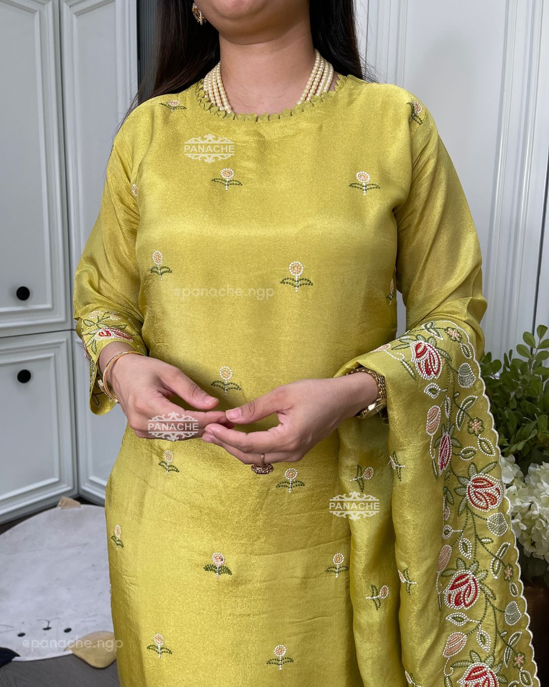 🟣 Detailed neckline with embroidery on sleeves and a heavily embroidered dupatta , heavy Daman teamed with pants