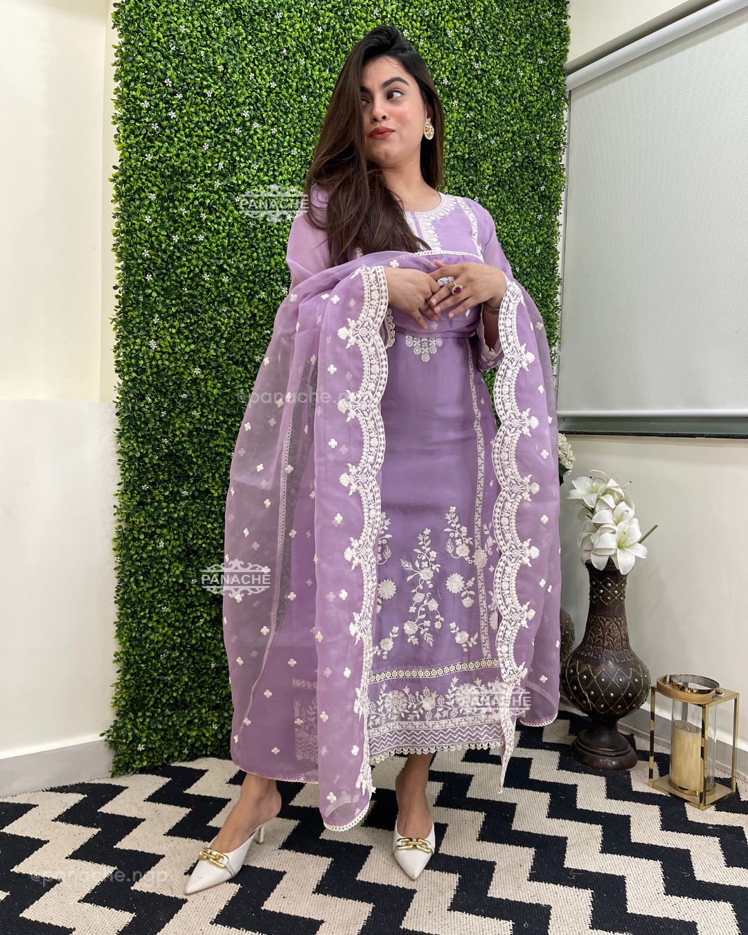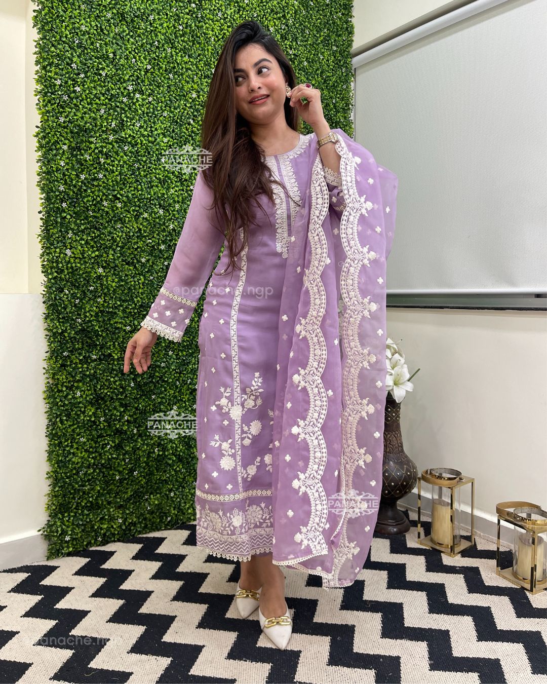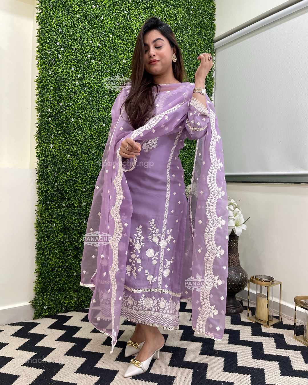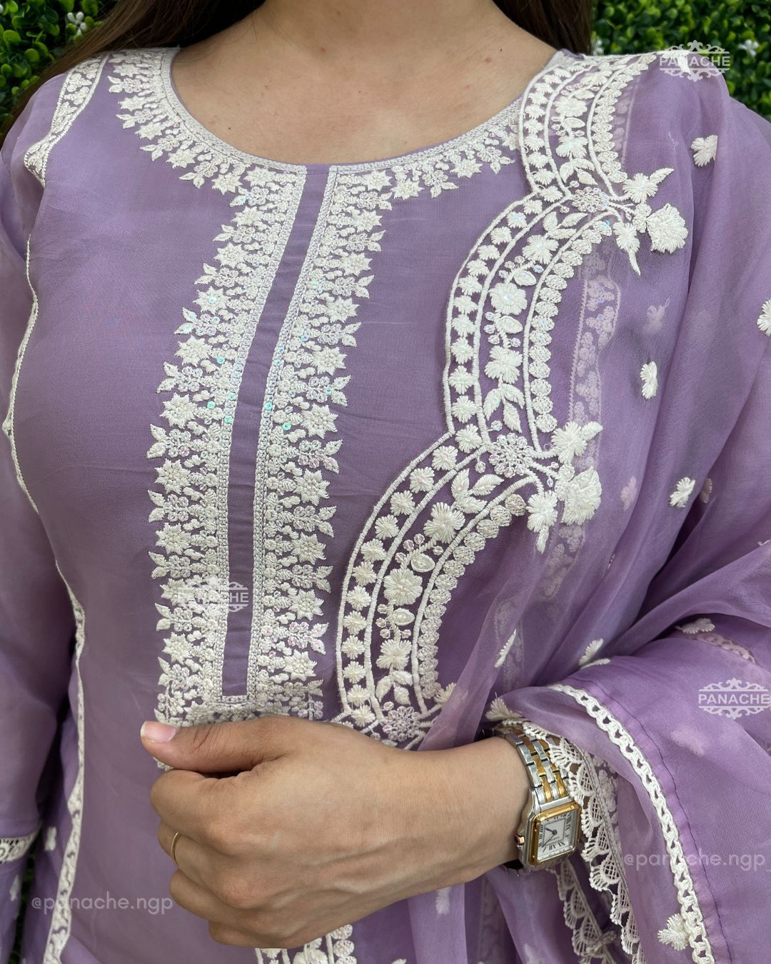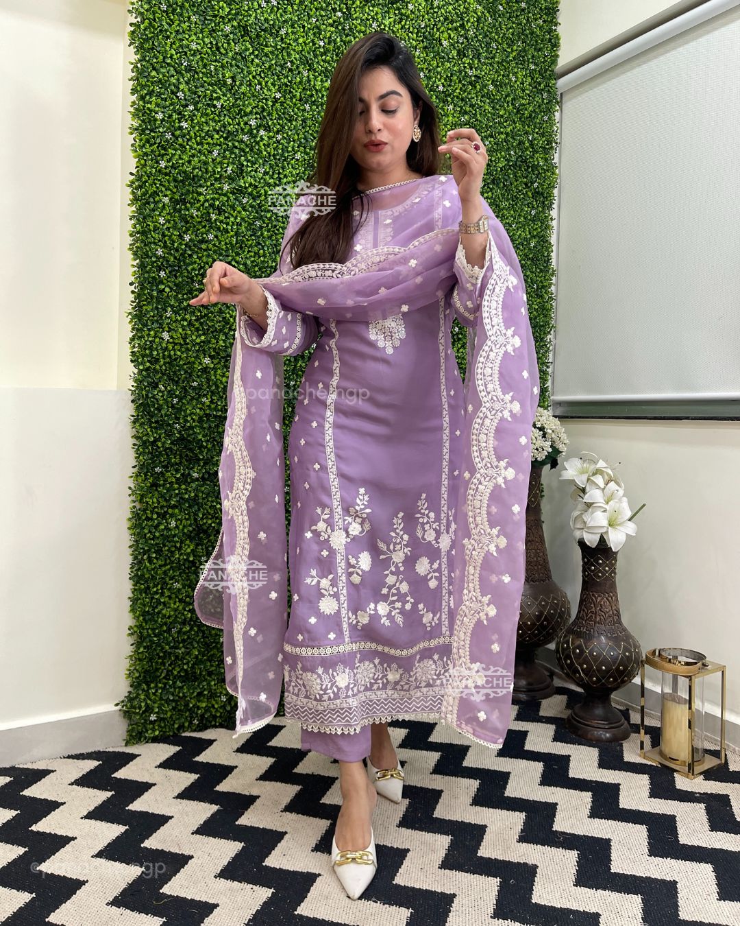 🟣 Karachi style suit with beautiful work in kurta with water sequin highlights, scallop dupatta, small buttas all over and jaal on hands