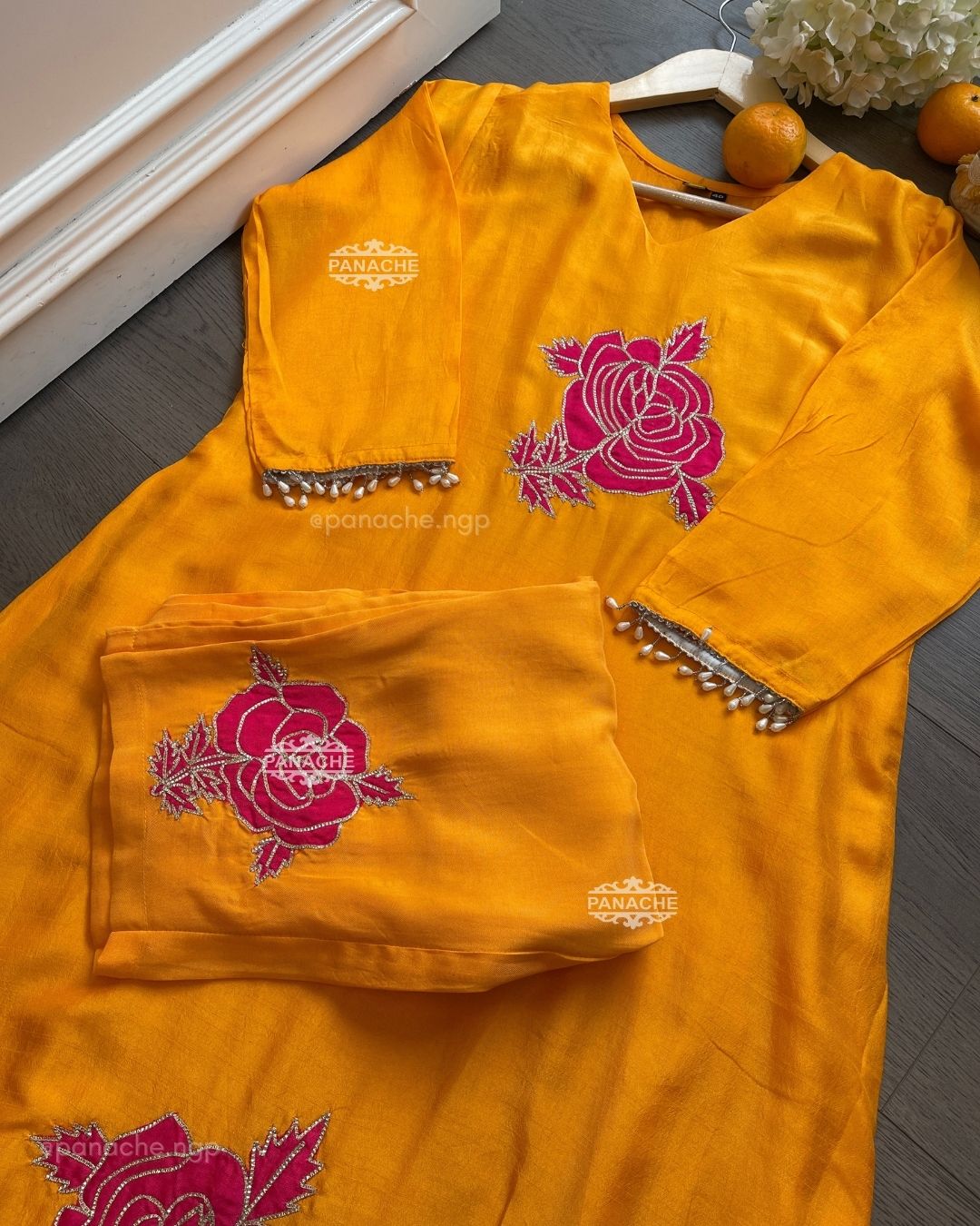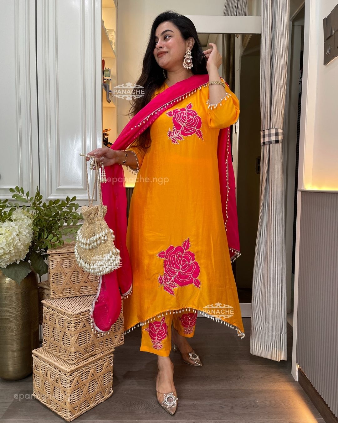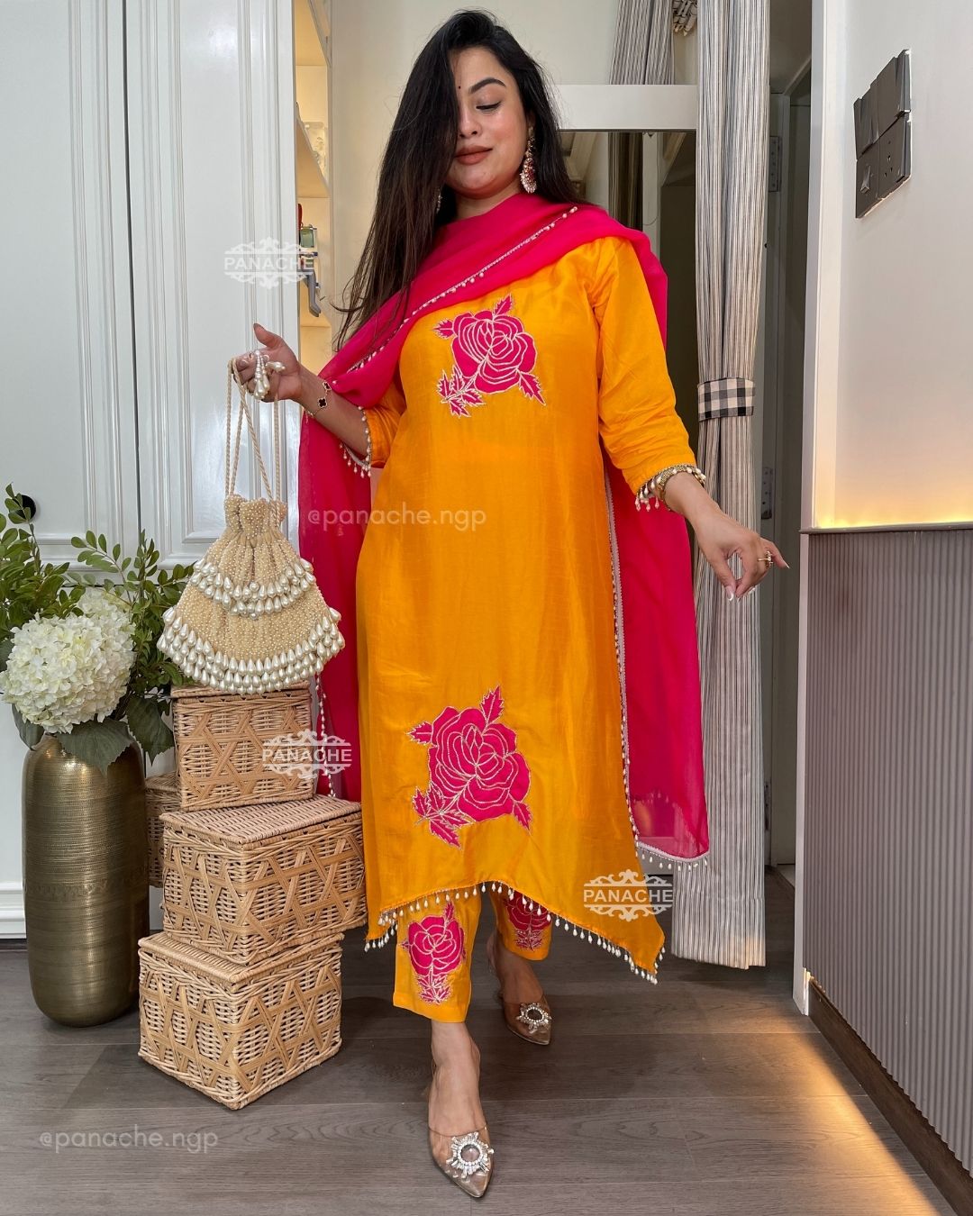 🟣 V neck line with asymmetrical kurta and straight pants with appliqué on kurta and pants with zari, pearl hangings on Daman, dupatta, sleeves