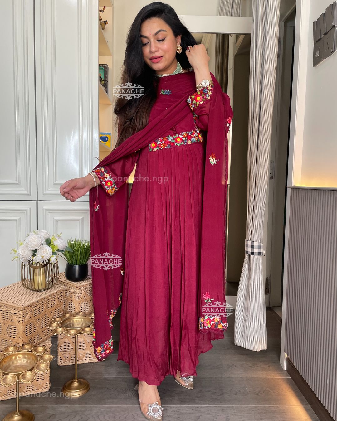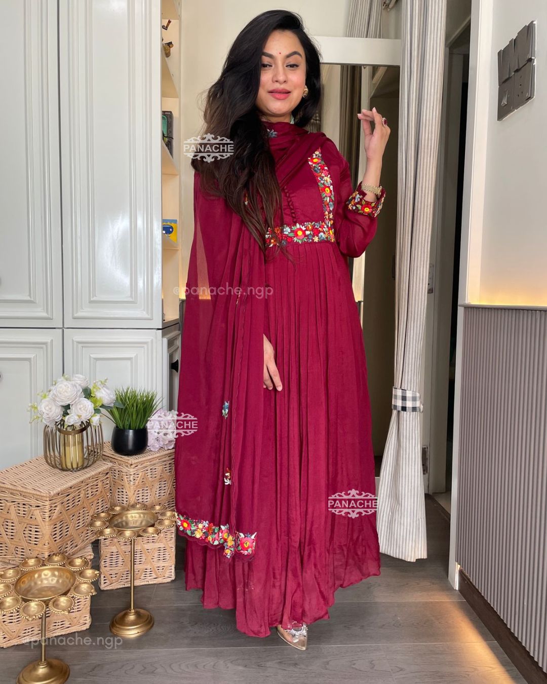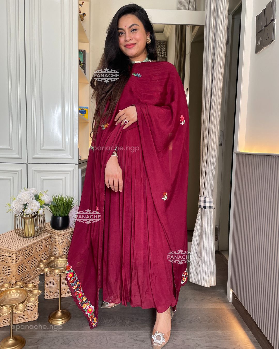 🟣 Heavy dabka frenchknot on neckline sleeves and dupatta with small buttas all over and grace in fabric