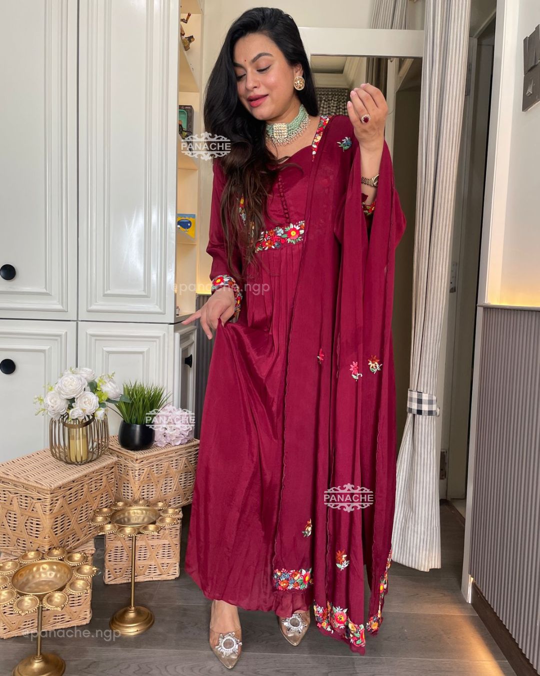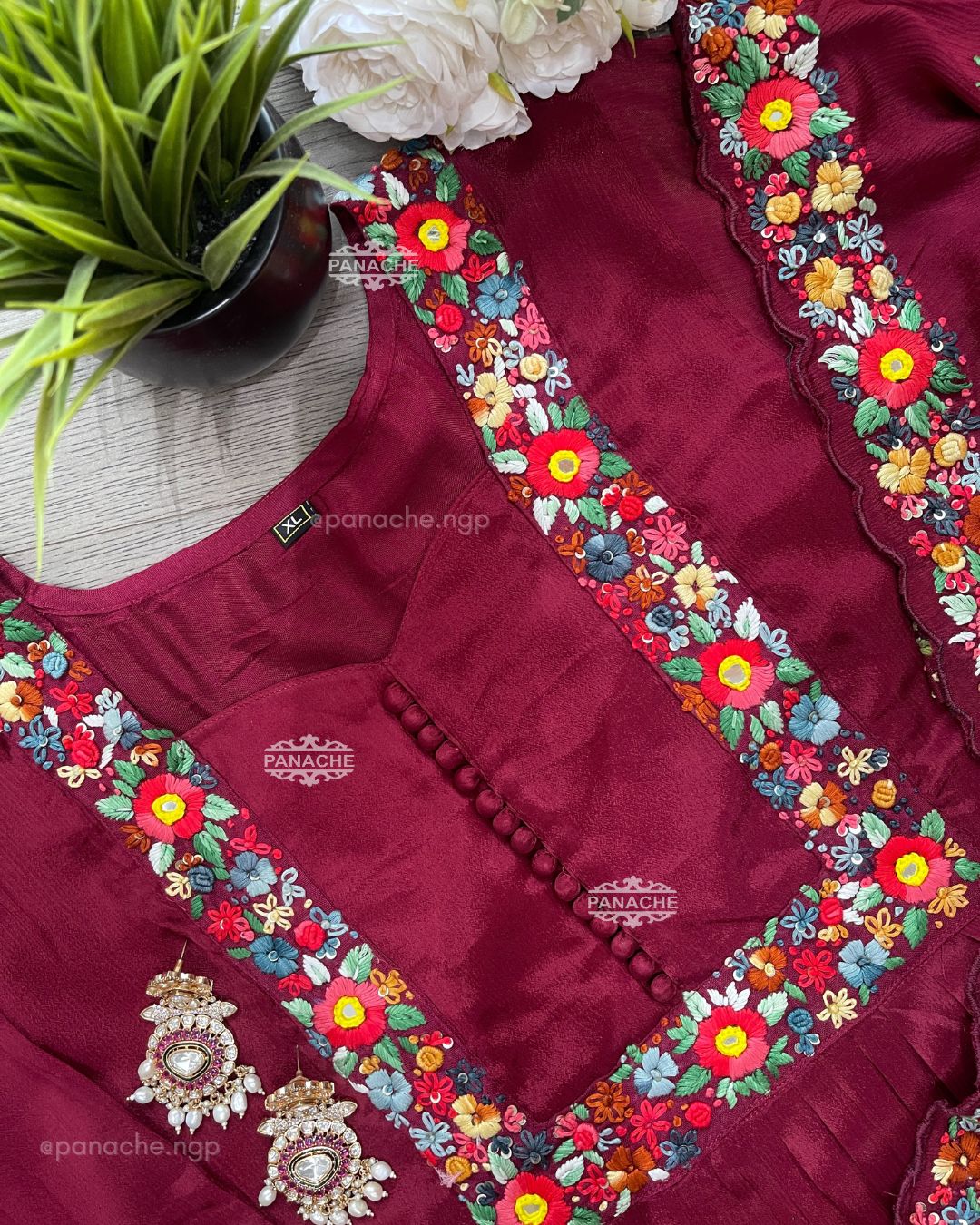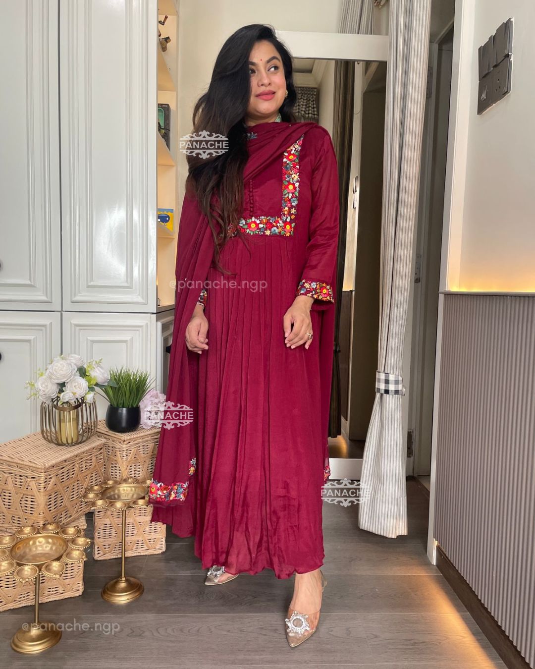 🟣 Heavy dabka frenchknot on neckline sleeves and dupatta with small buttas all over and grace in fabric