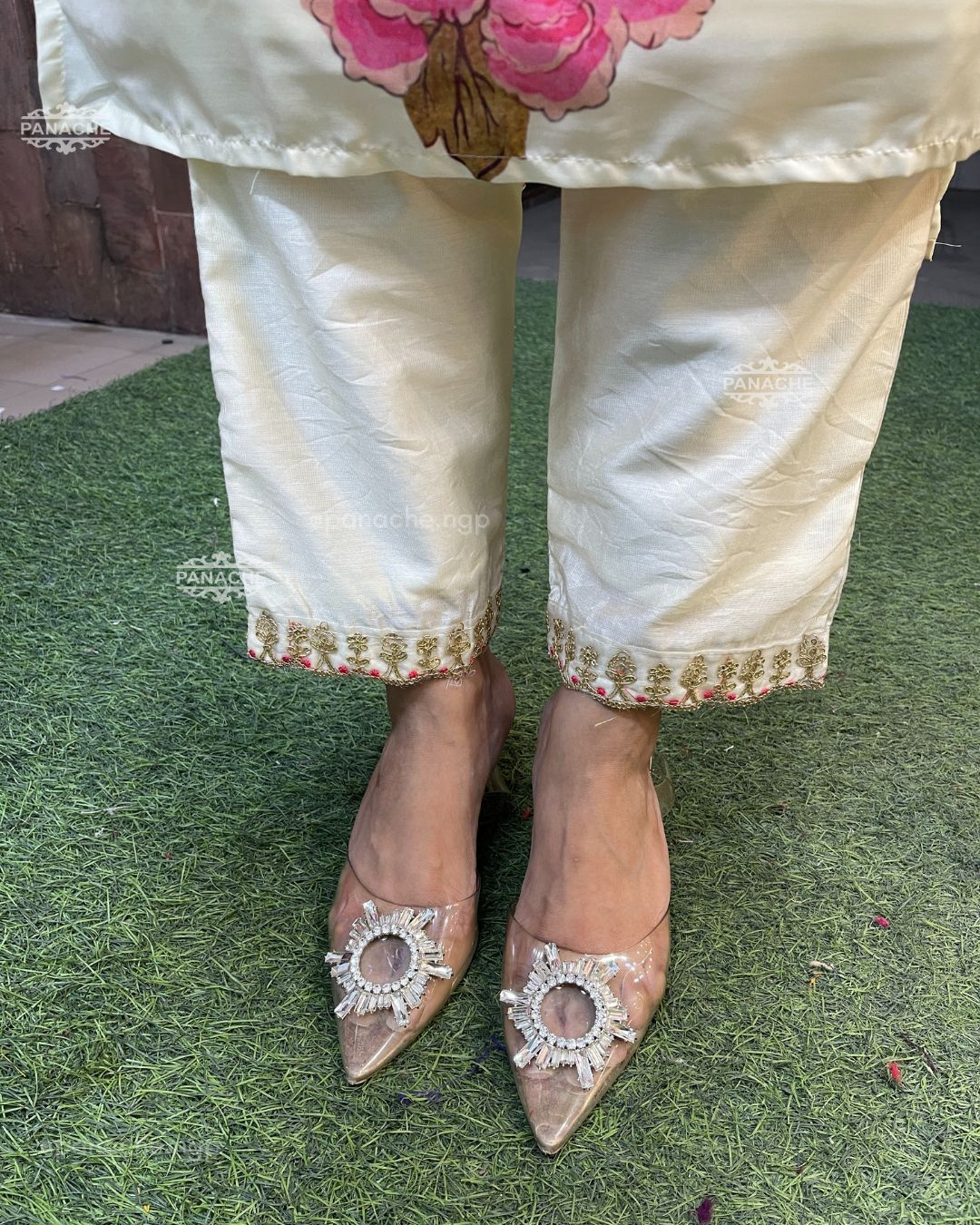 🟣 Shades of off-white and Mary colors of pink with floral print on kurta V - Neckline with lace and same on pants and sleeves