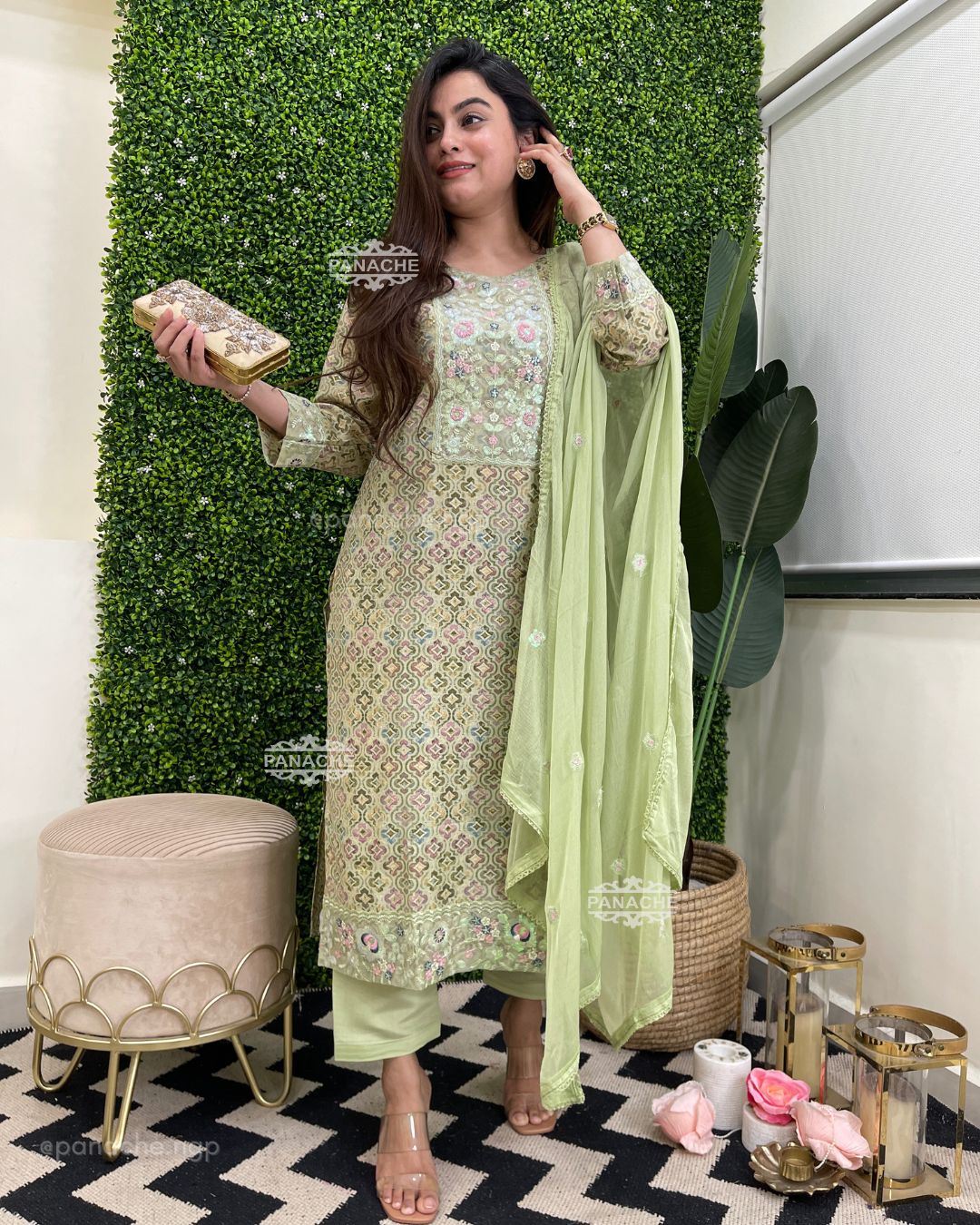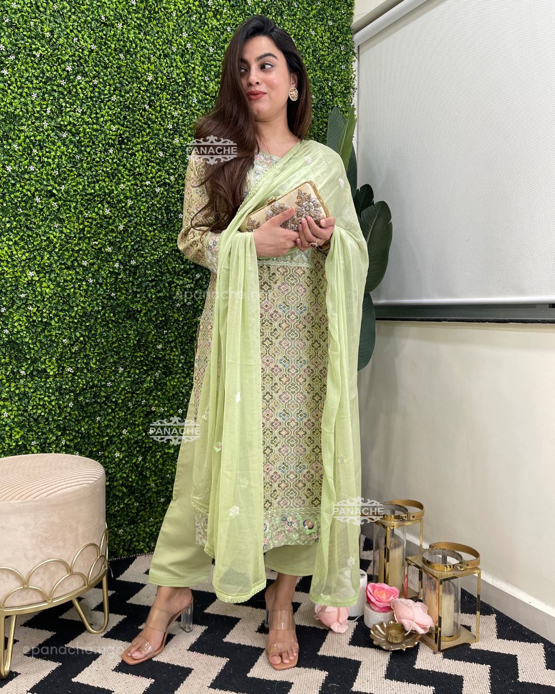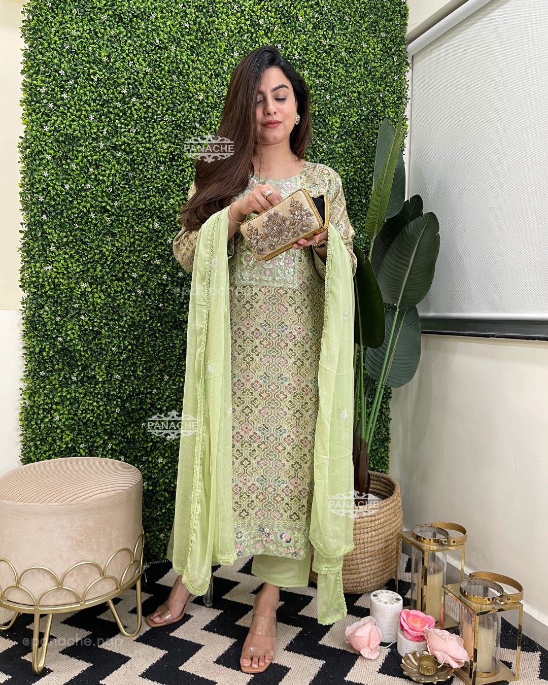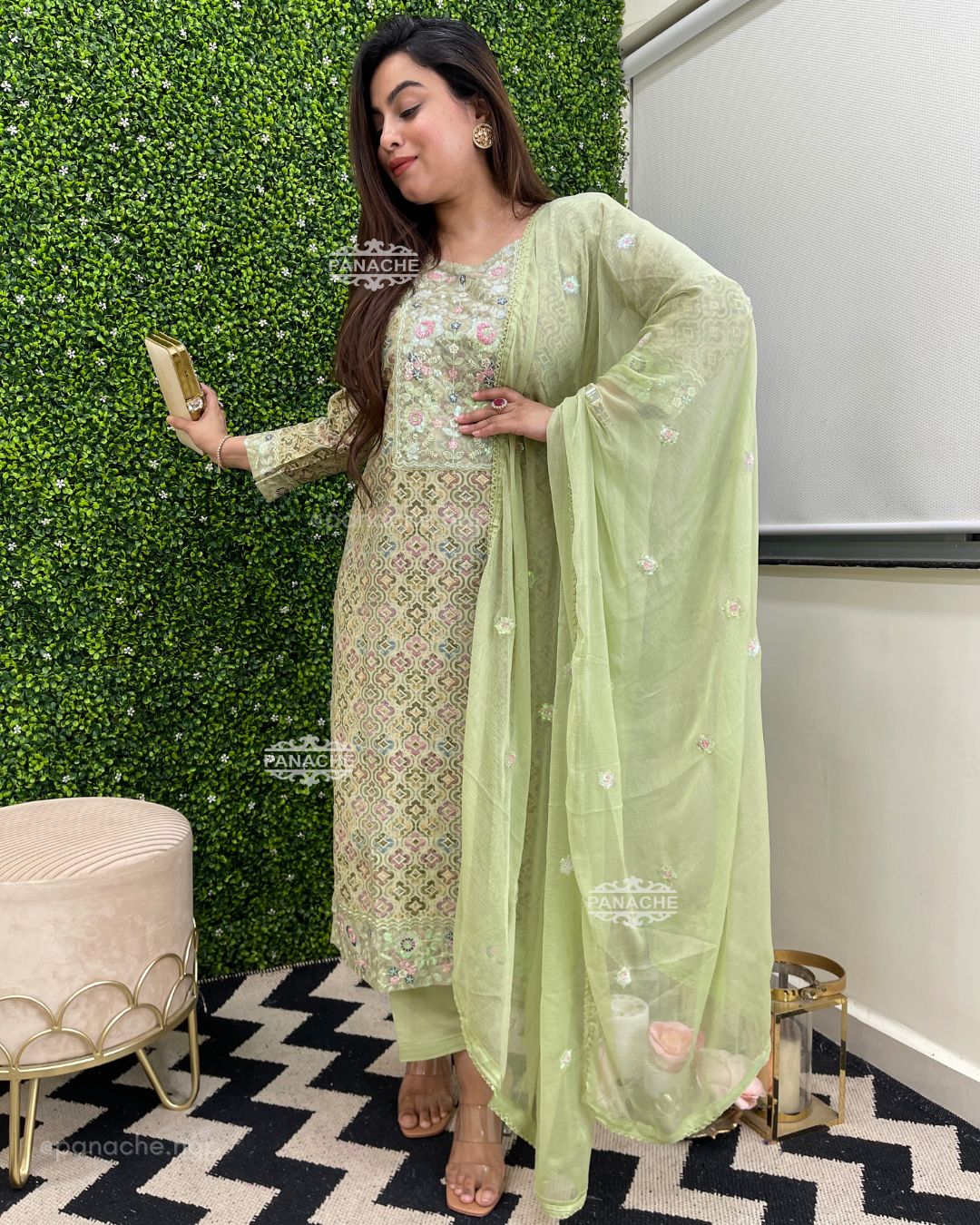 🟣 A beautiful printed kurta with plain pants and even prettier dupatta, water sequin highlights on yolk daman and sleeves