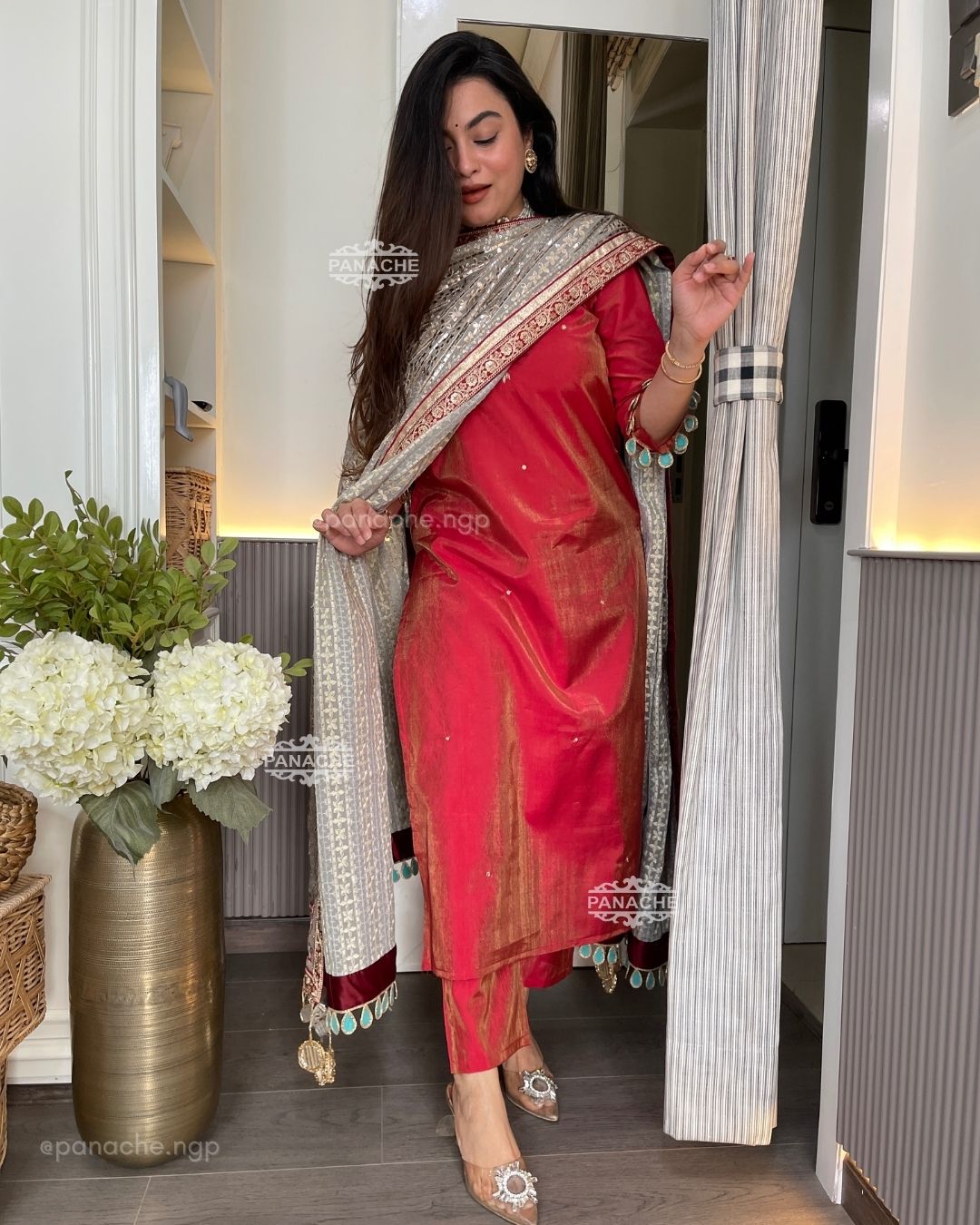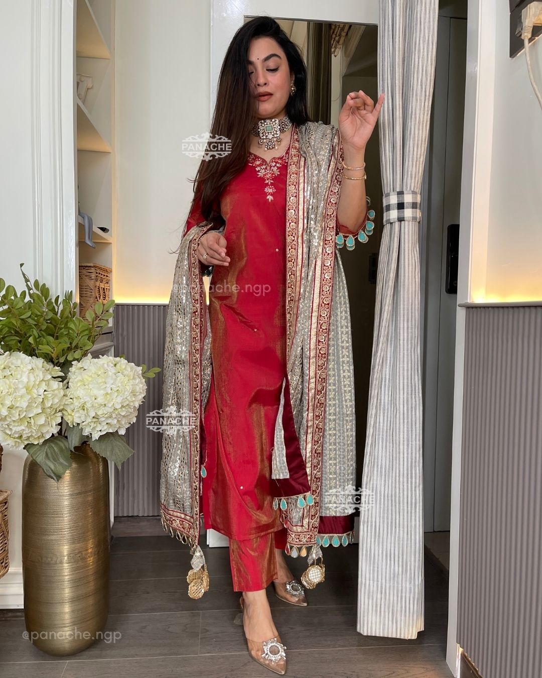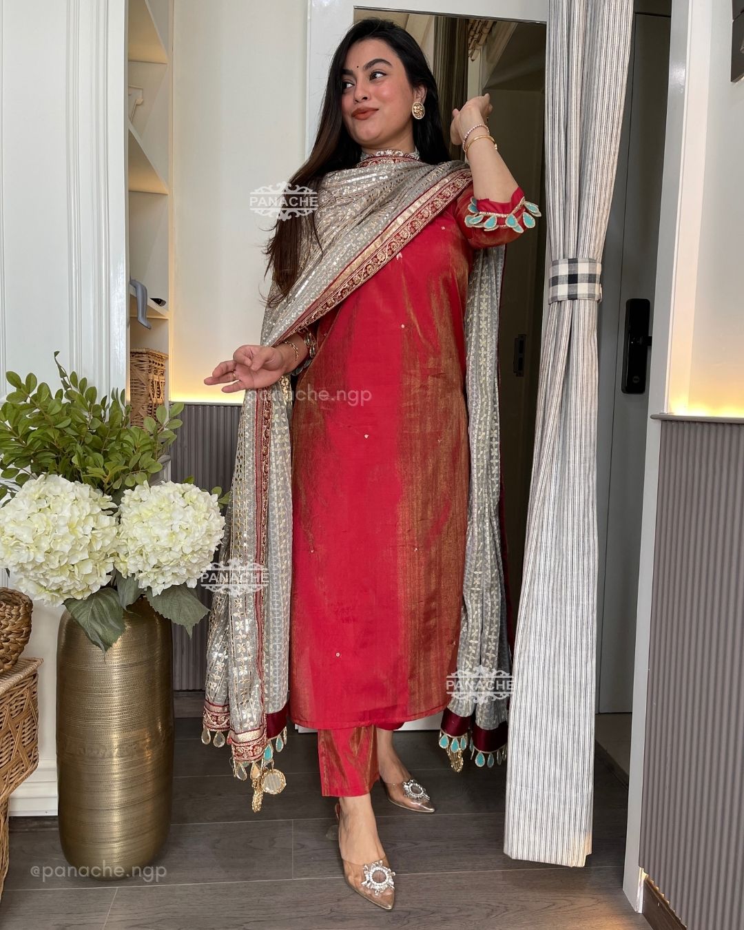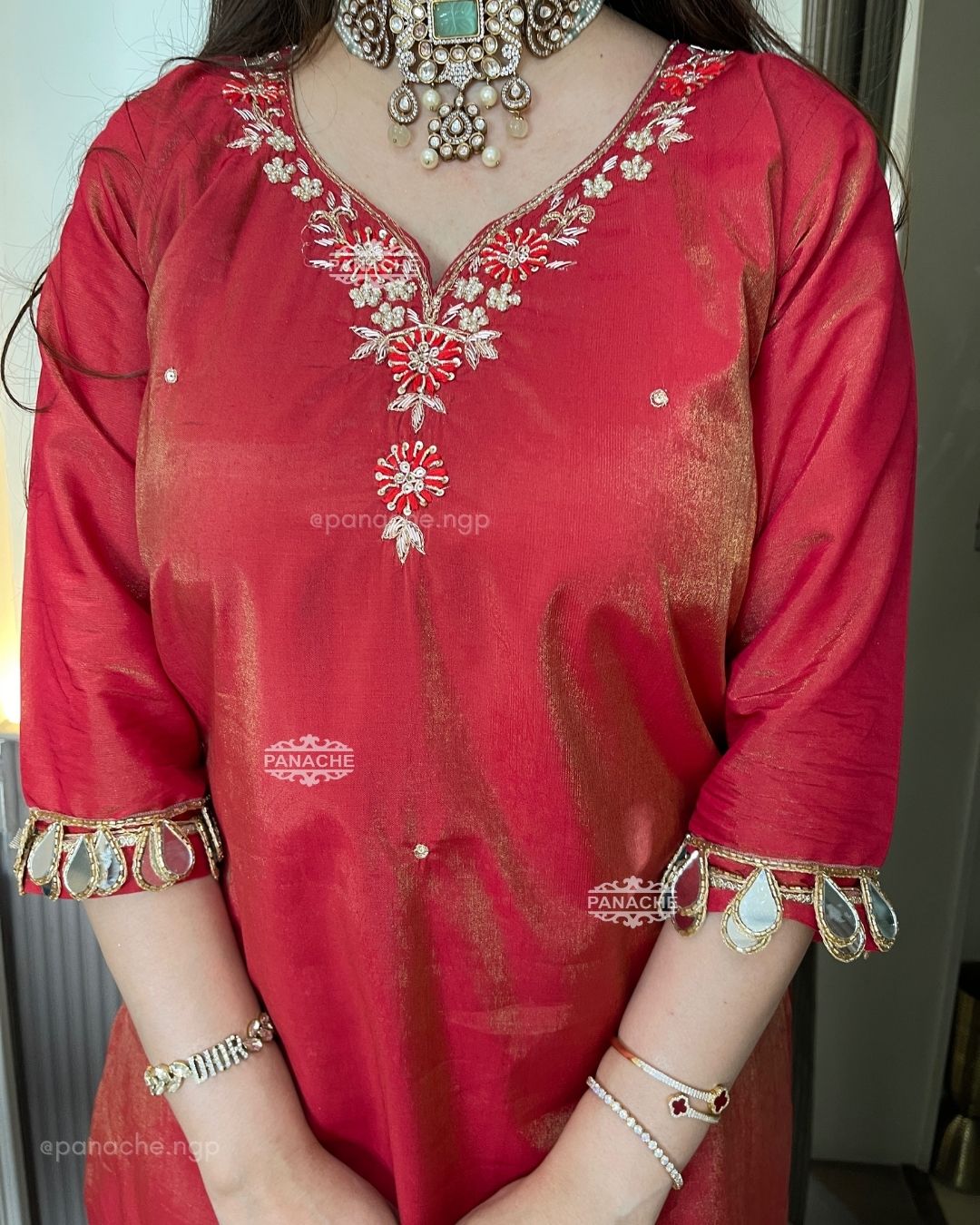 🟣 Handwork on kurta with red highlights and a dupatta with our signature under fall and Pittman work with shimmer lace, handwork heavy tassels on dupatta with hand mirror on Daman of kurta