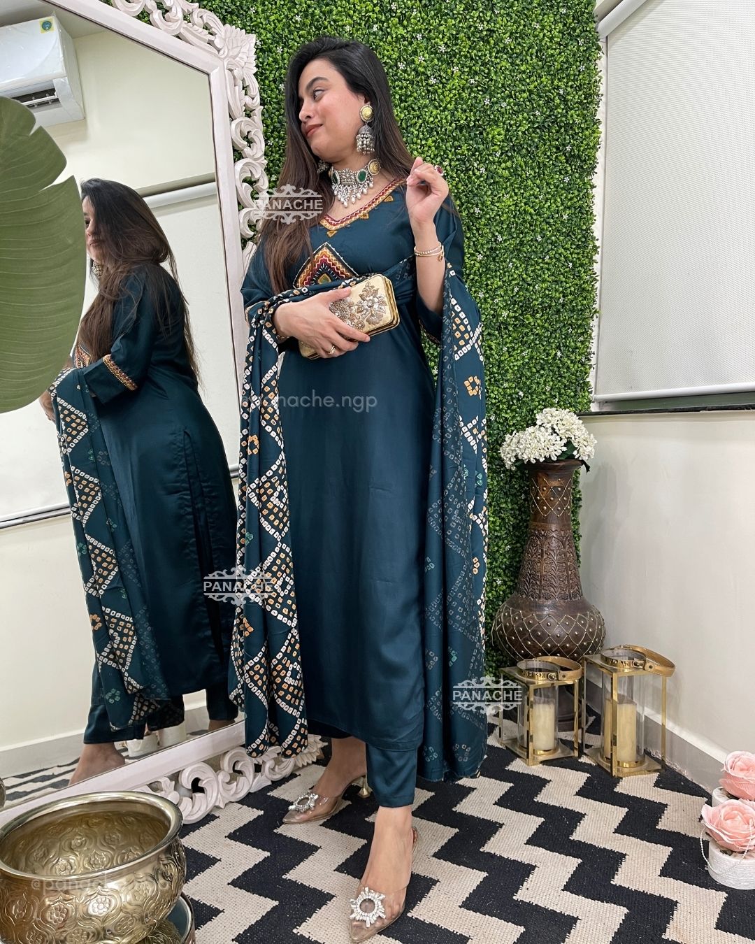 🟣 Beautiful neckline with real mirrors and a lovely soft Bandhani dupatta