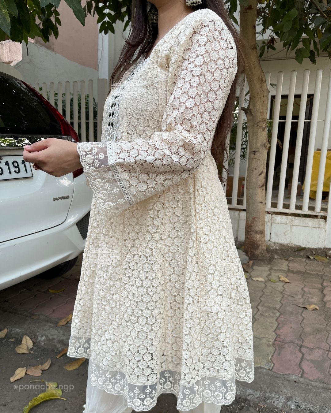 🟣 Real mirrors on neckline of kurta with crosia lace on sleeves Daman of kurta and beautiful neckline, salwar with Potli details on Daman