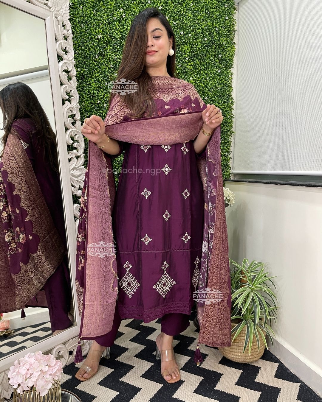 🟣 Mirror work meets floral finesse!