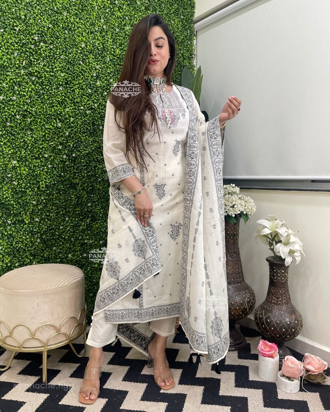 🟣 Weaved embroidered on kurta all over with a massive weaved dupatta and tassels all over dupatta paired with potli pants