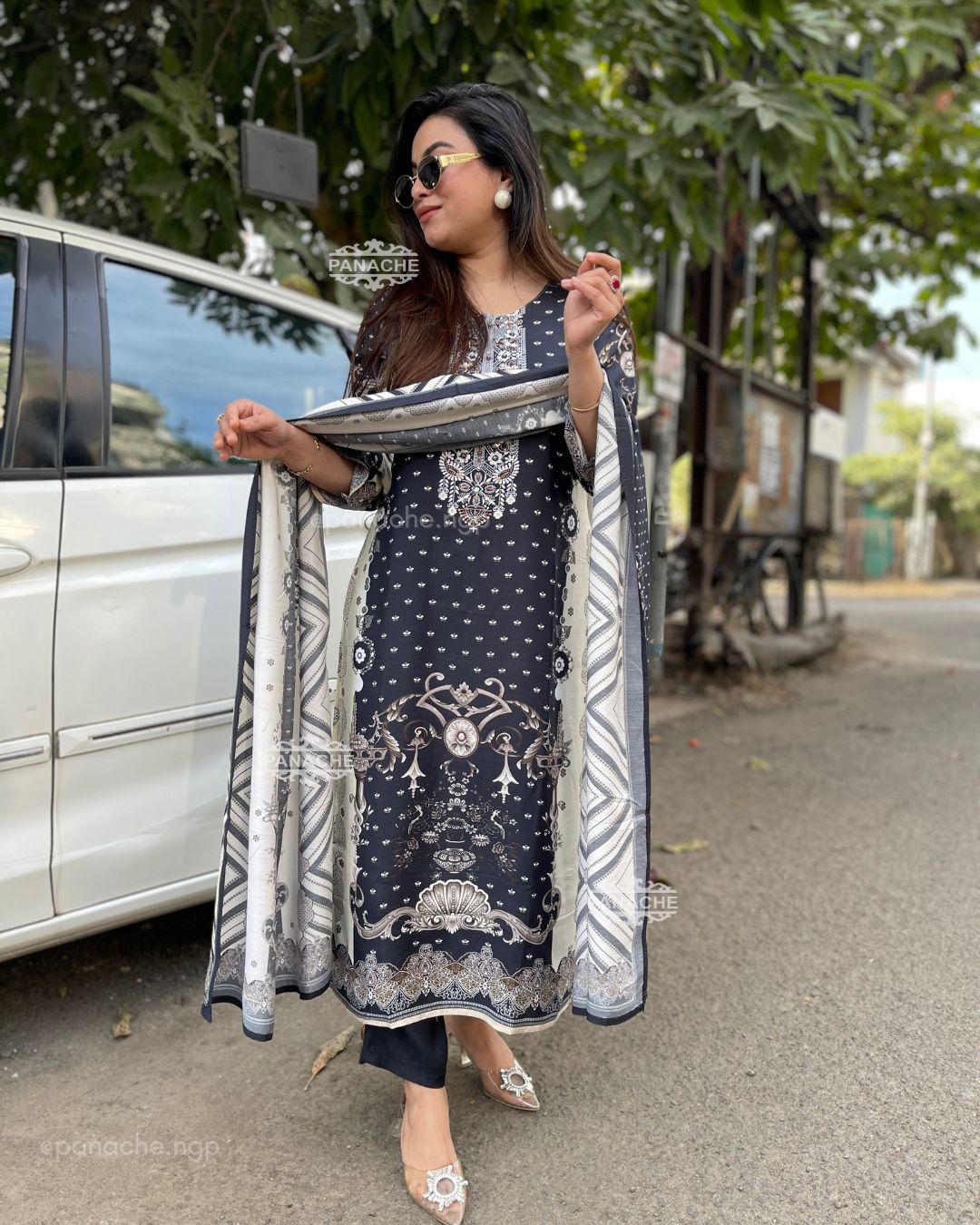 🟣 A print on print with style and handwork on neckline with printed dupatta and plain pants