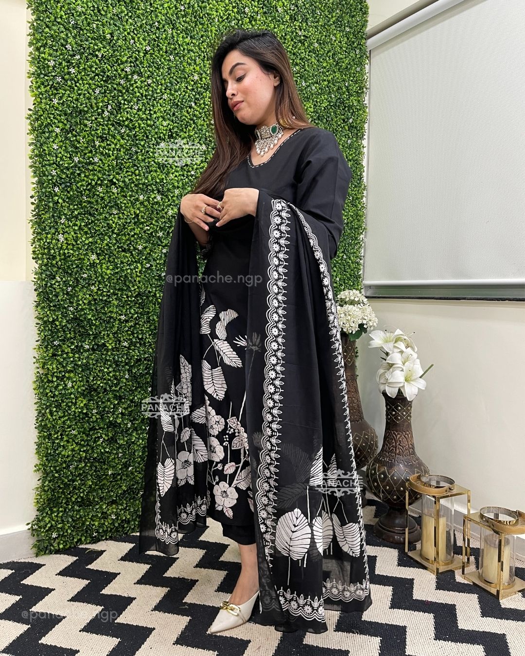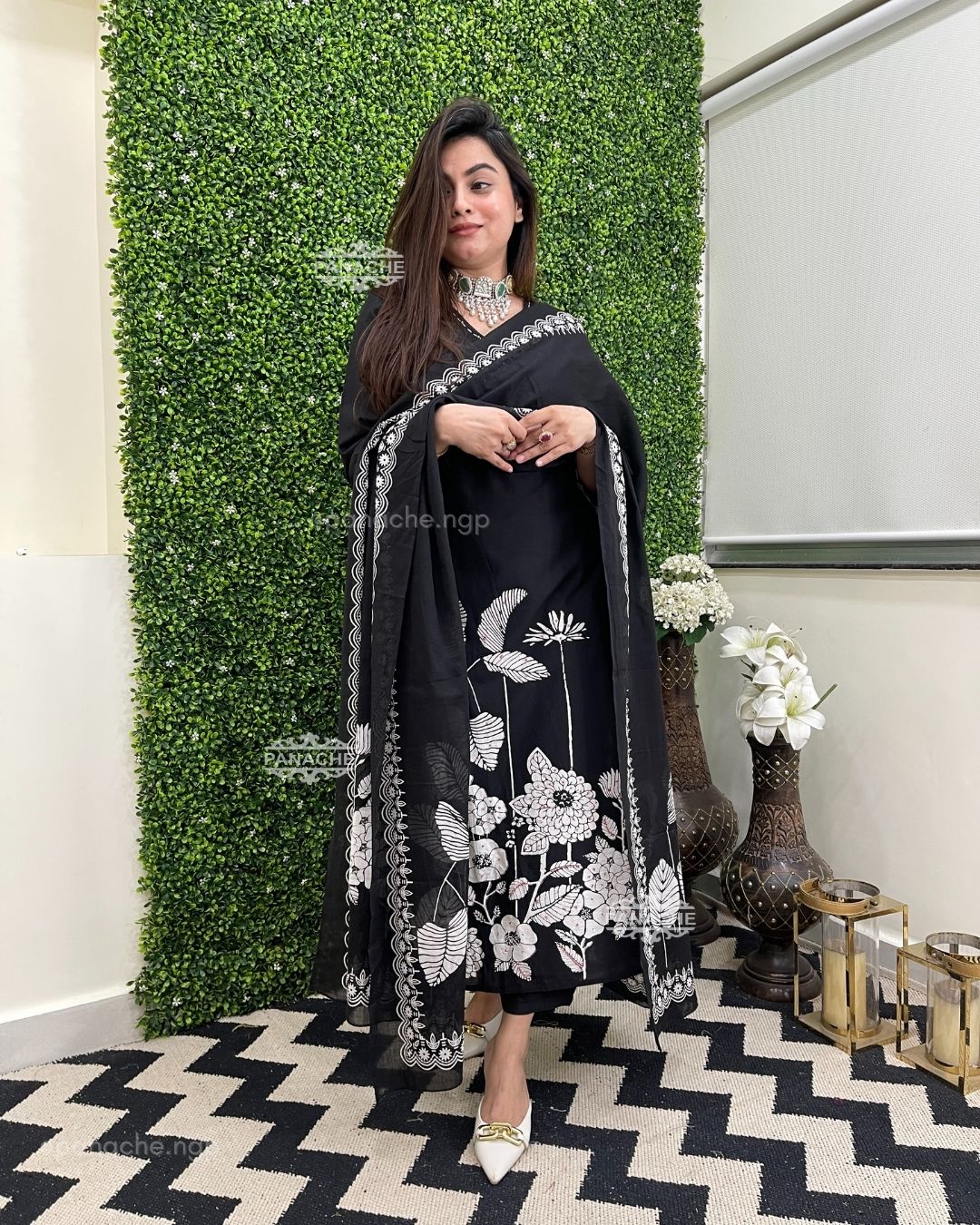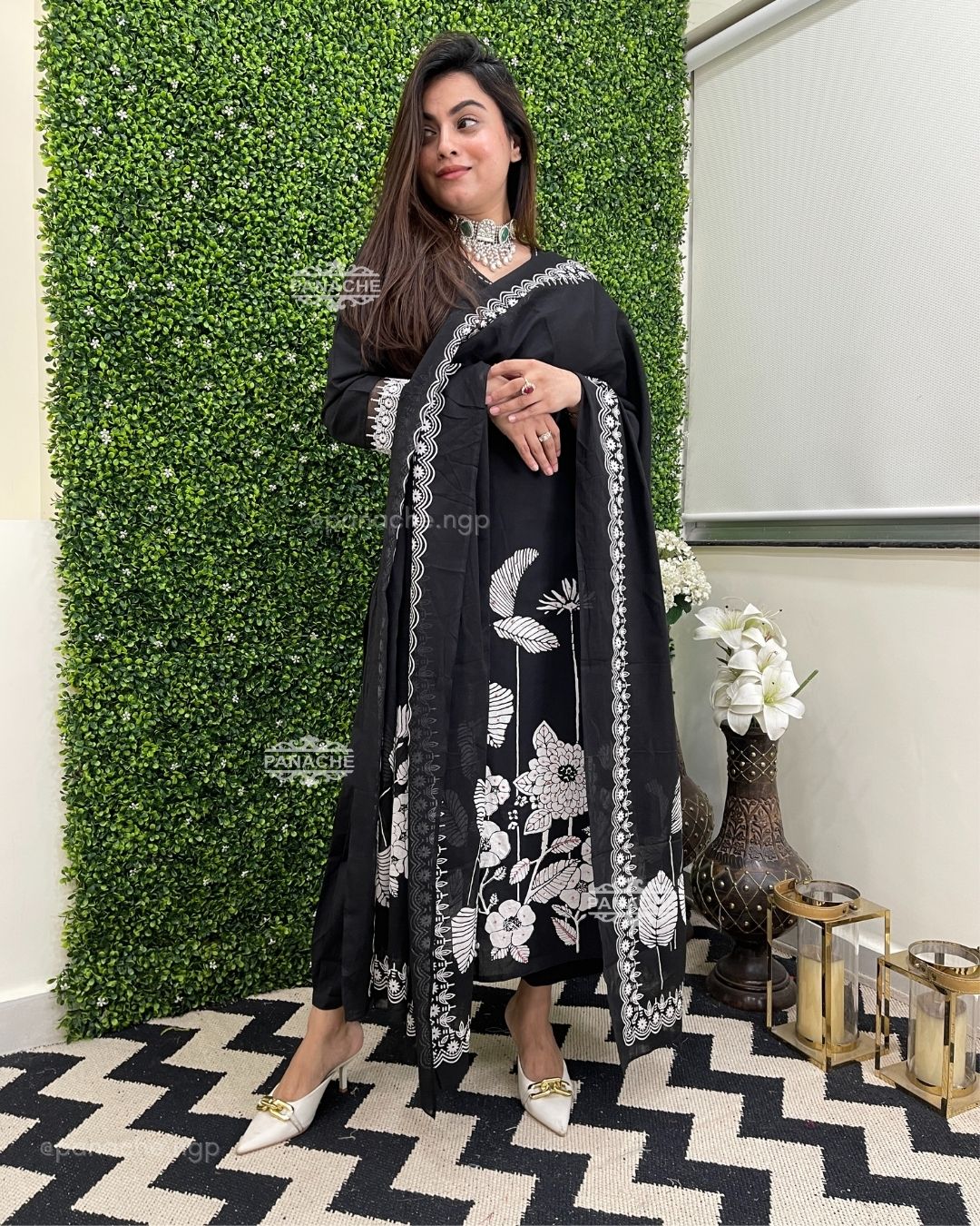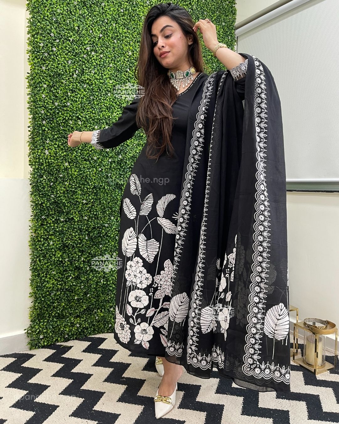 🟣 A beautiful neckline with cross-stitch details and a beautiful flower print with highlights, a dupatta that never ends soft to feel & great to wear, a 4-side print with daman print, plain pants