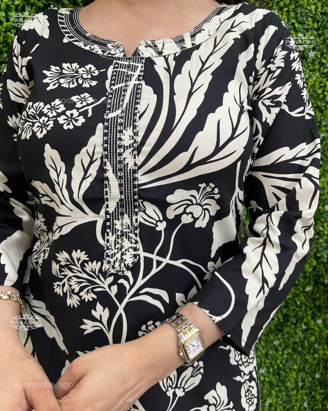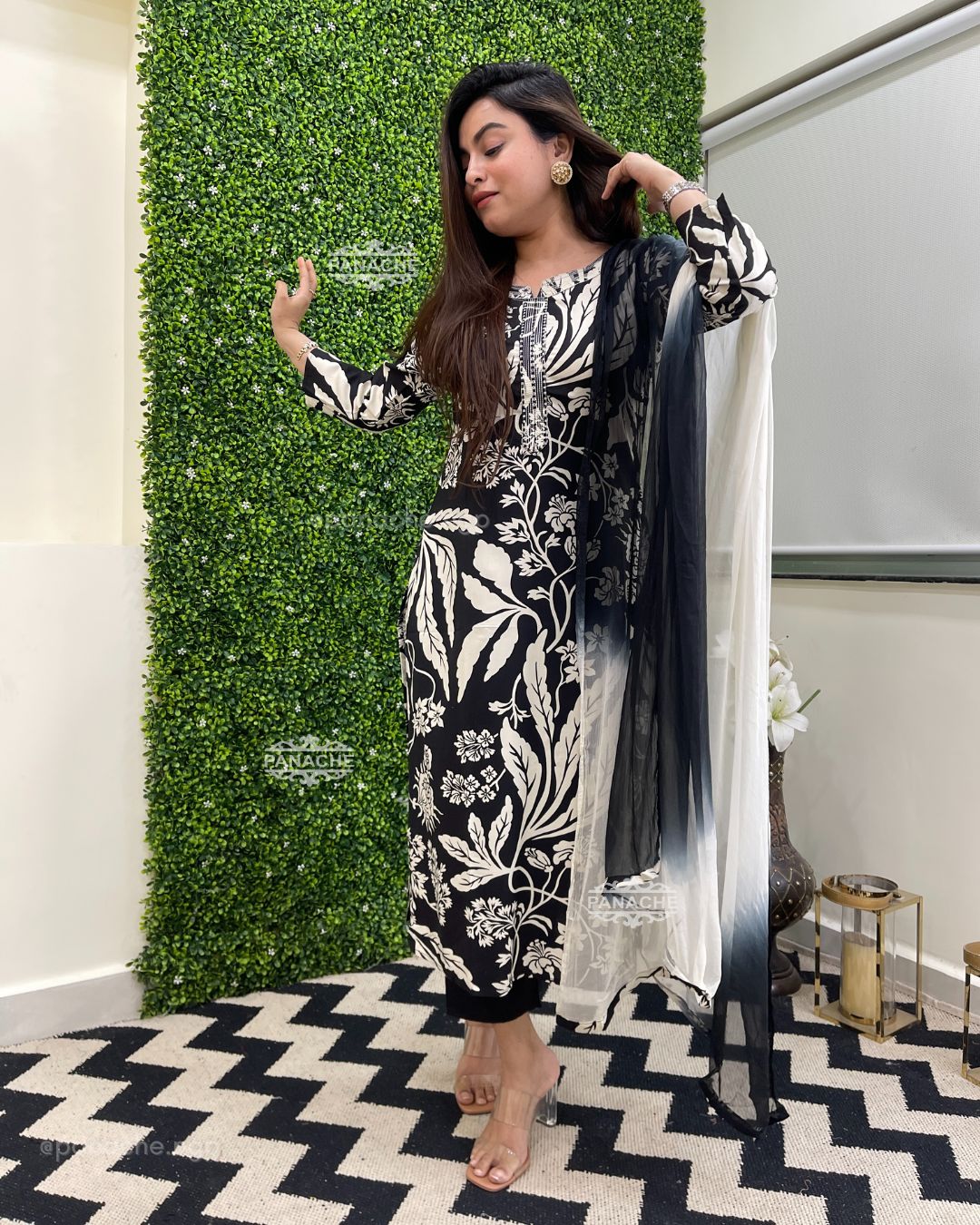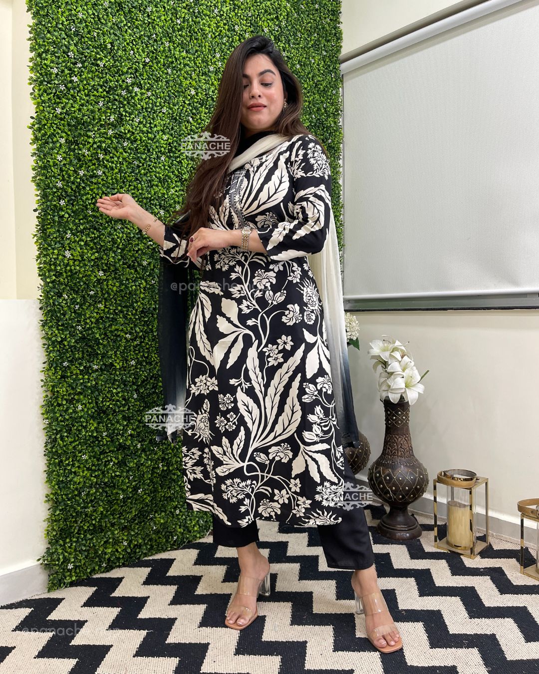 🟣 A new neckline in monochrome print with soft feel on wearing, shaded dupatta and plain pants