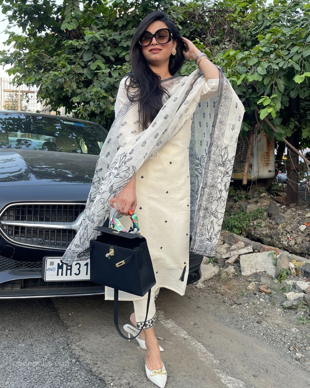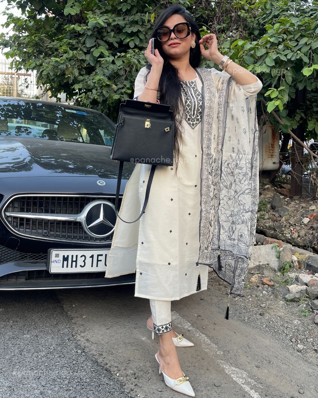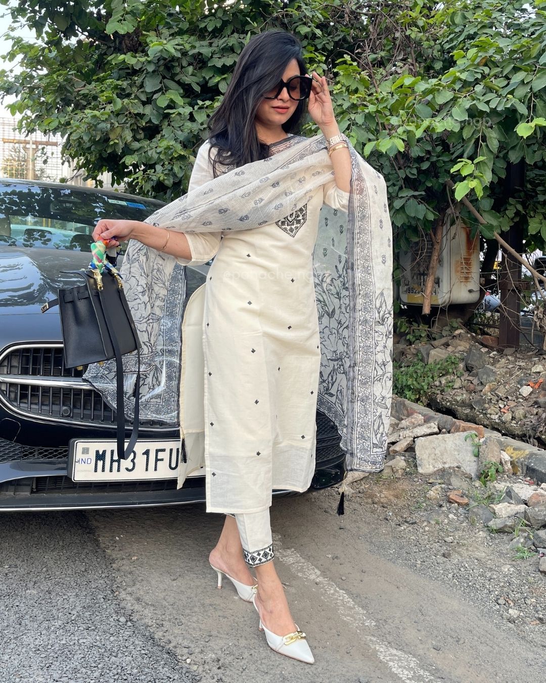 🟣 Embroidery on neckline and small buttas all over kurta with work on daman of pants, printed kota doriya dupatta