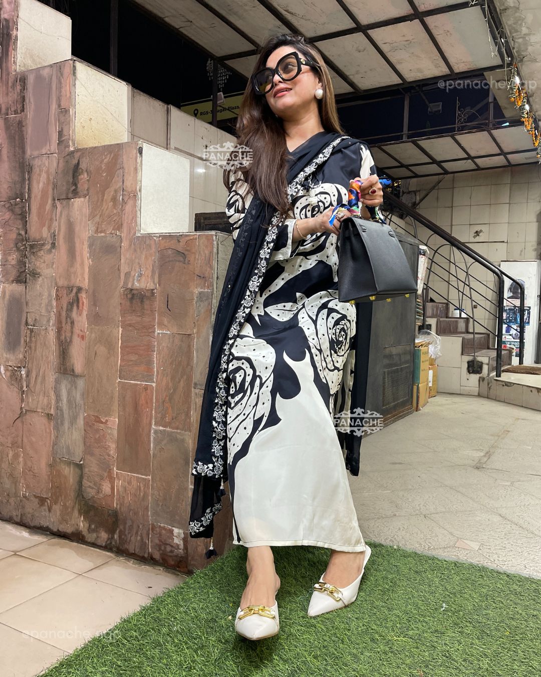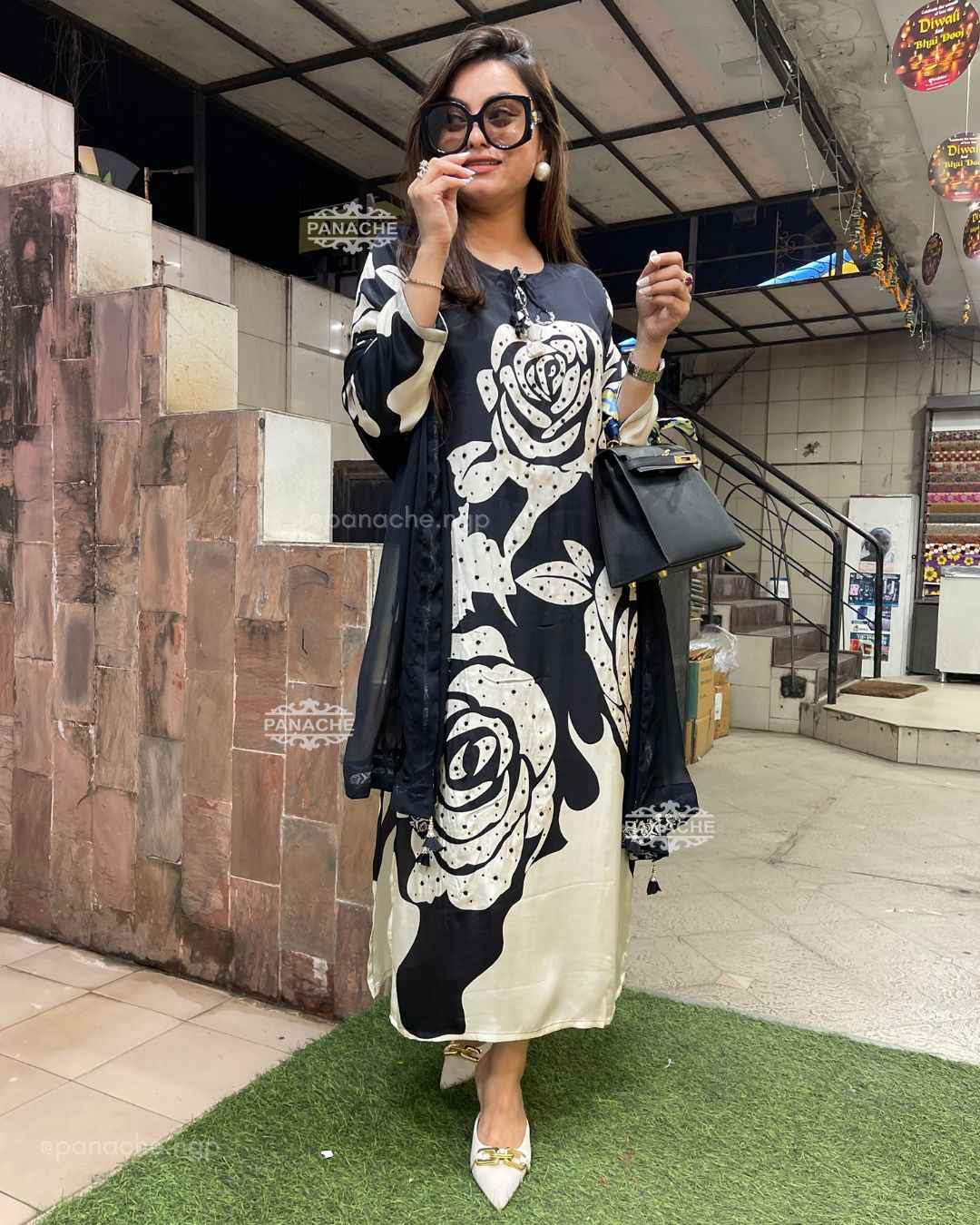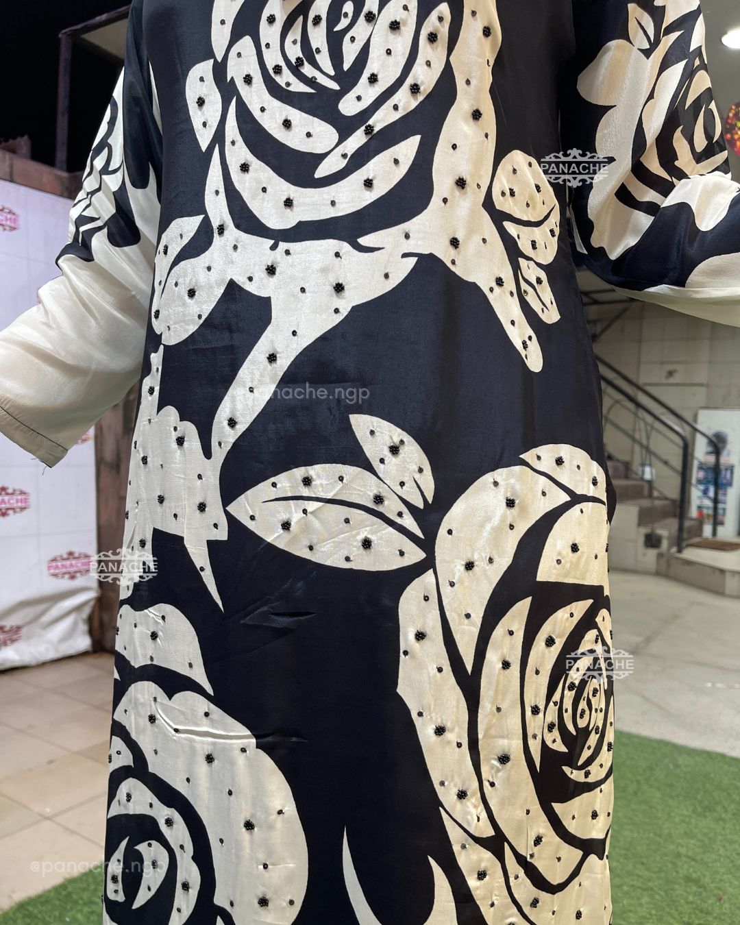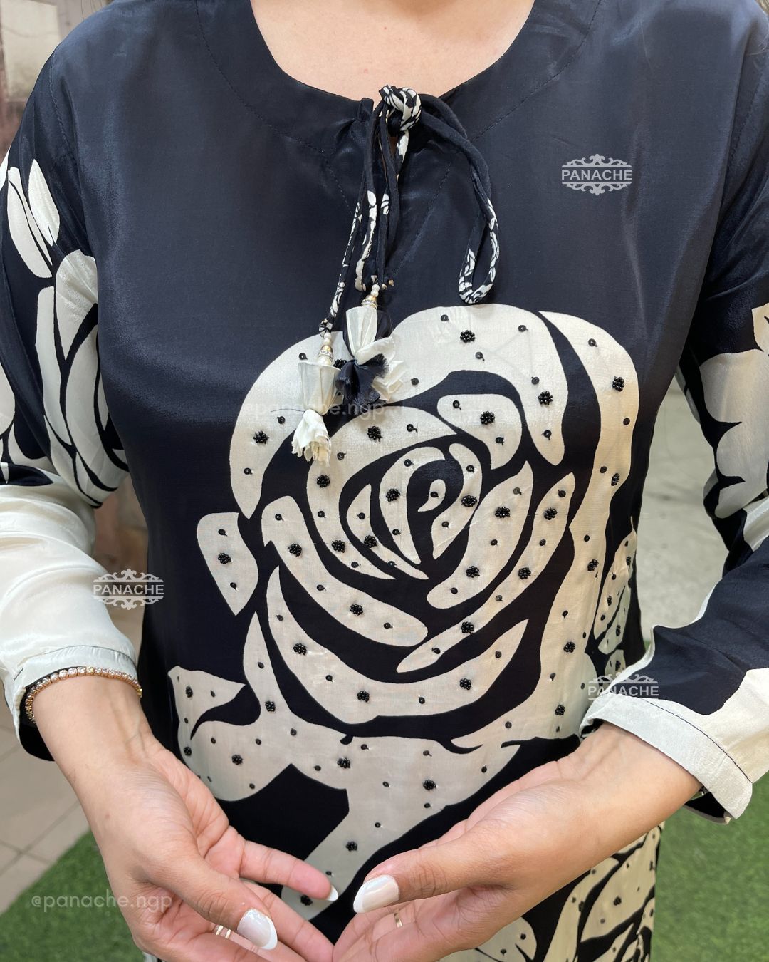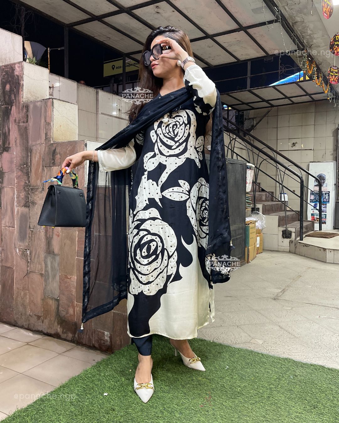 🟣 Floral soft chinnon set with cutpipe pearl details all over kurta and hand made tassels on neckline , small sprinkles on dupatta also