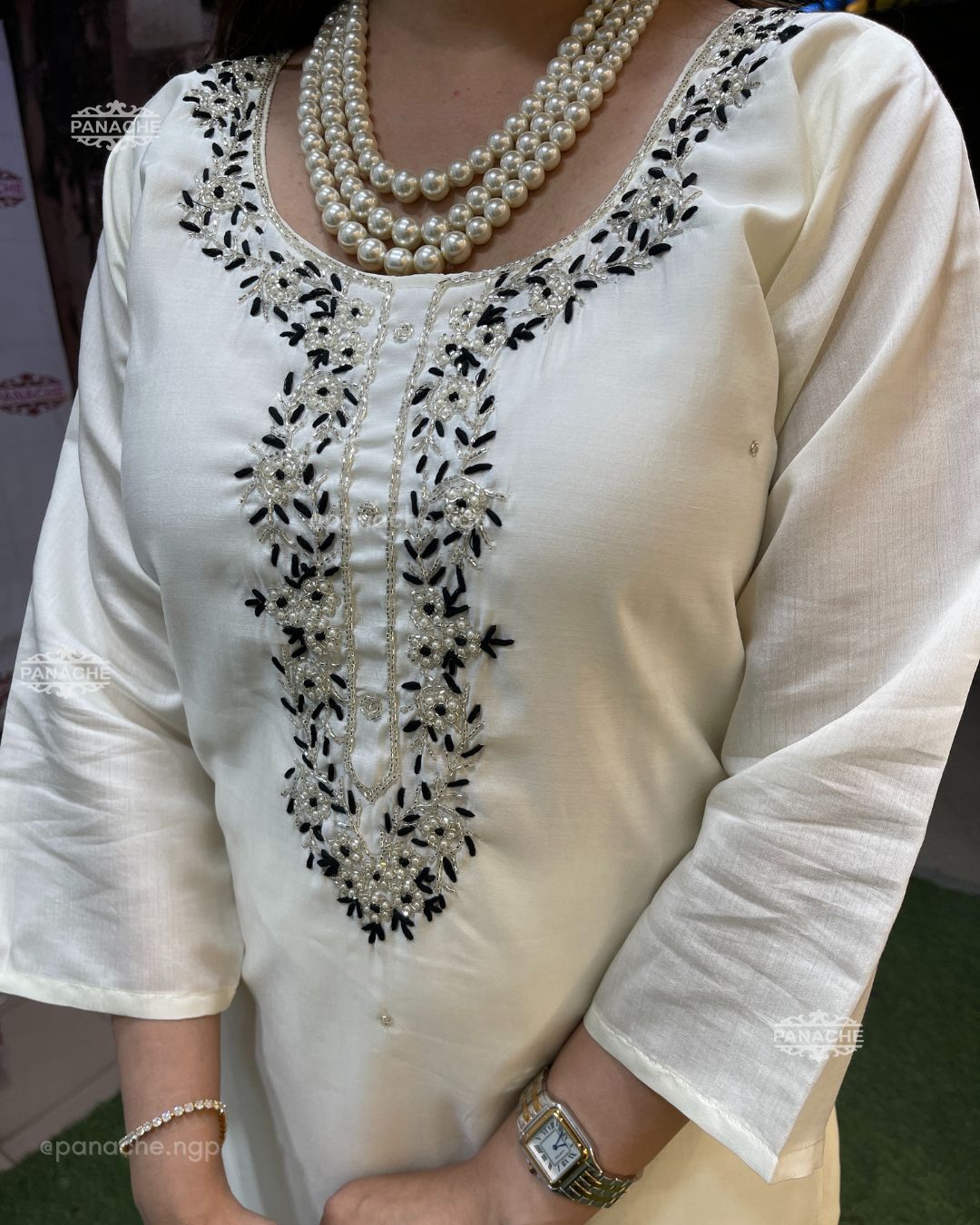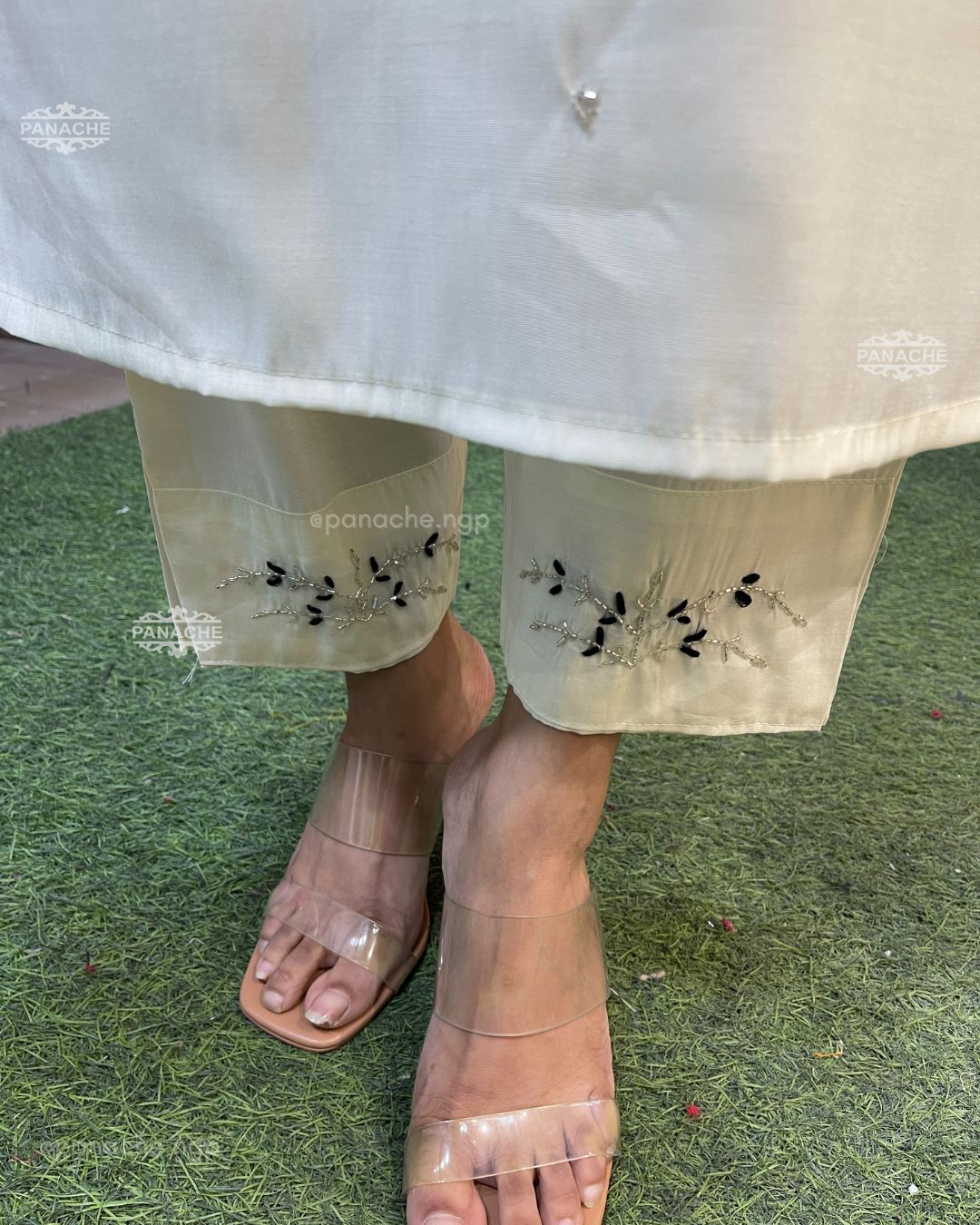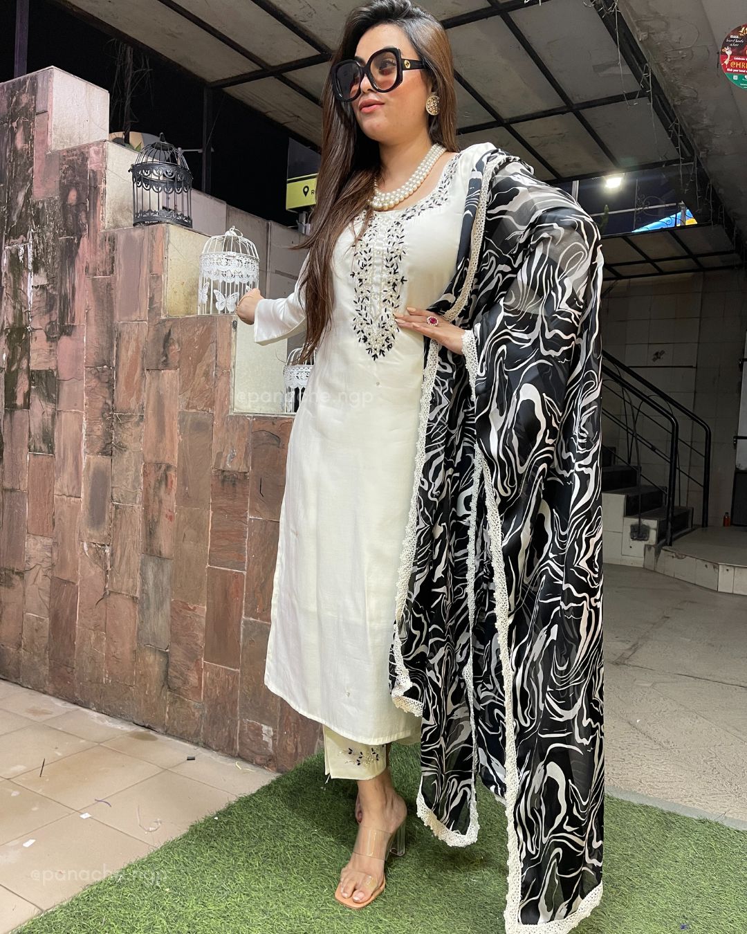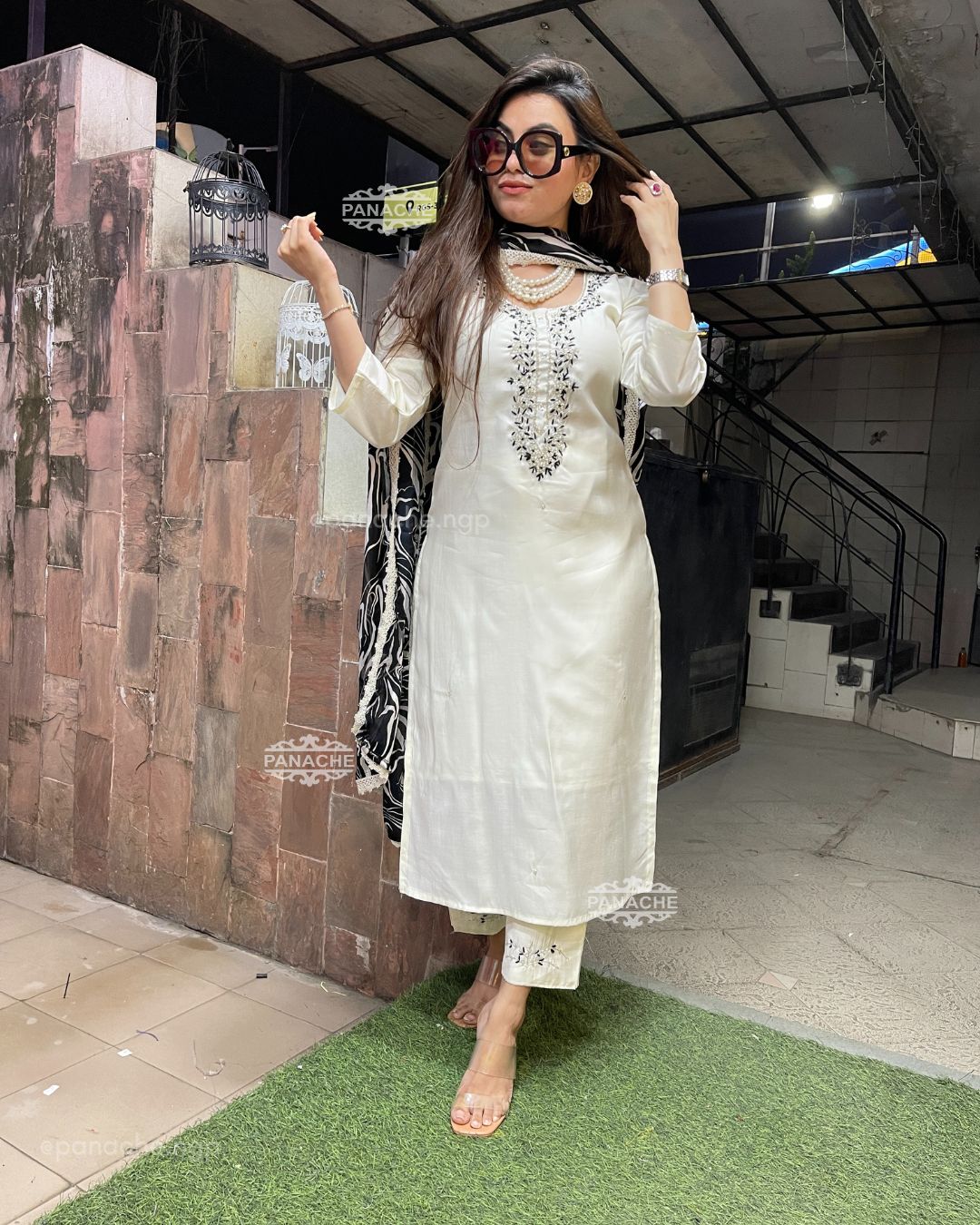 🟣 Handwork on neckline of kurta & daman of pants with stripes and self print dupatta which will surprise you pleasantly with its grace! Crosia borders on all sides