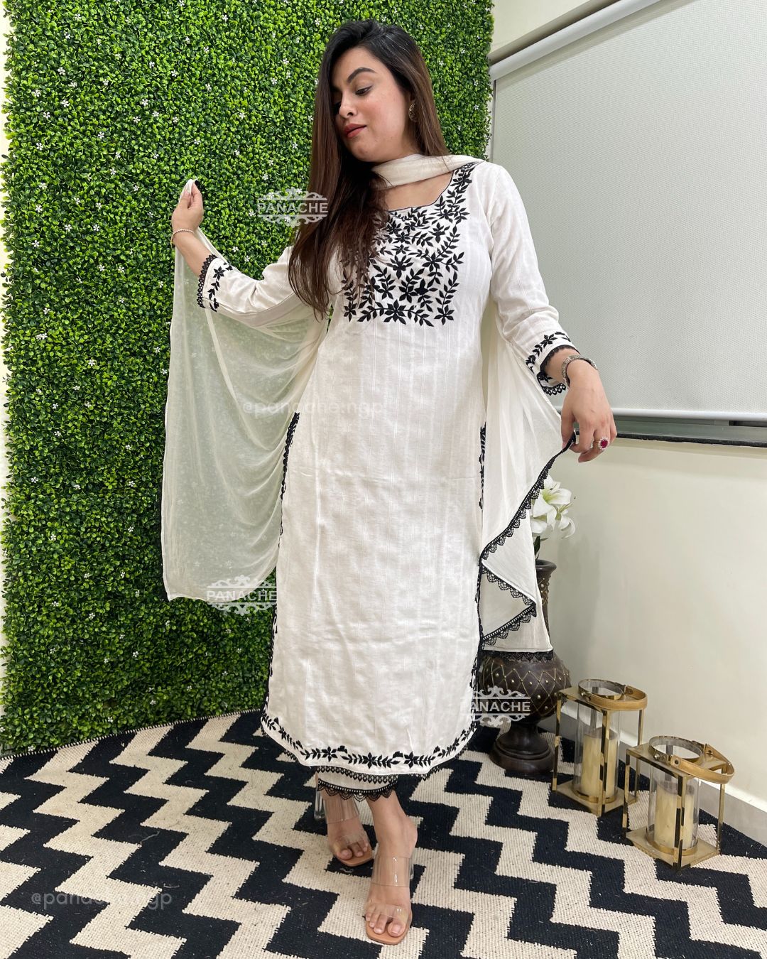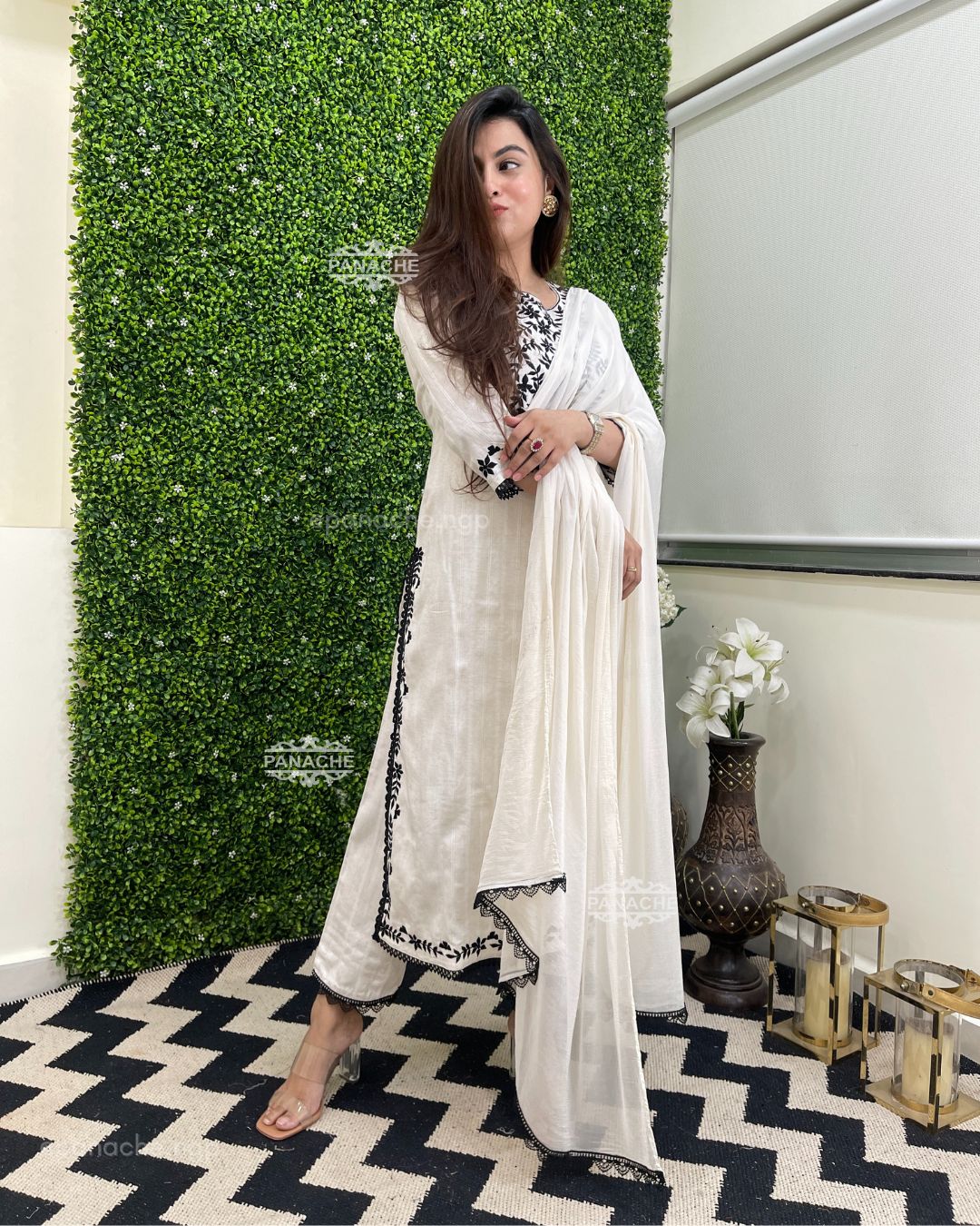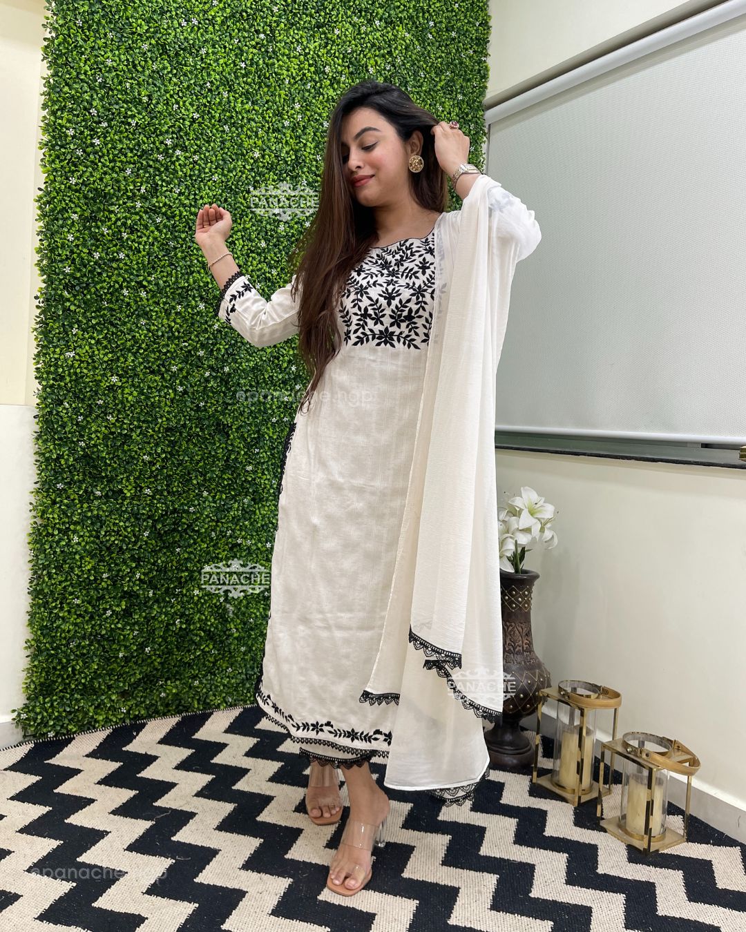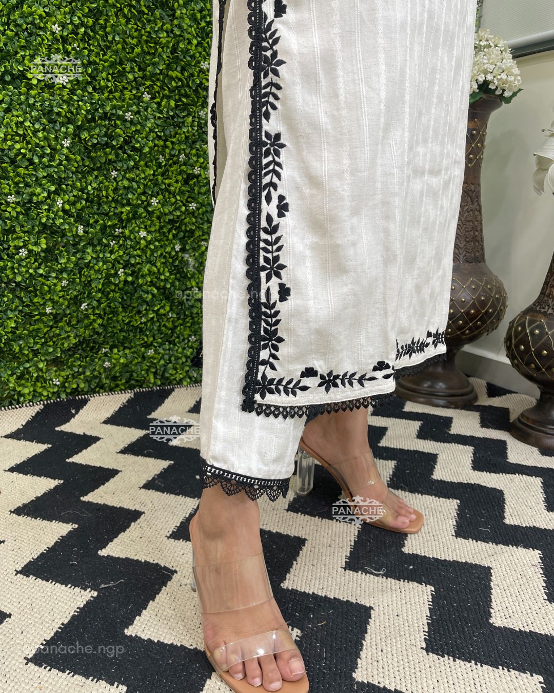 🟣 Black embroidered neckline with sleeves, side cuts embroidered and lace all over dupatta and highlights kurta, sleeves and pants