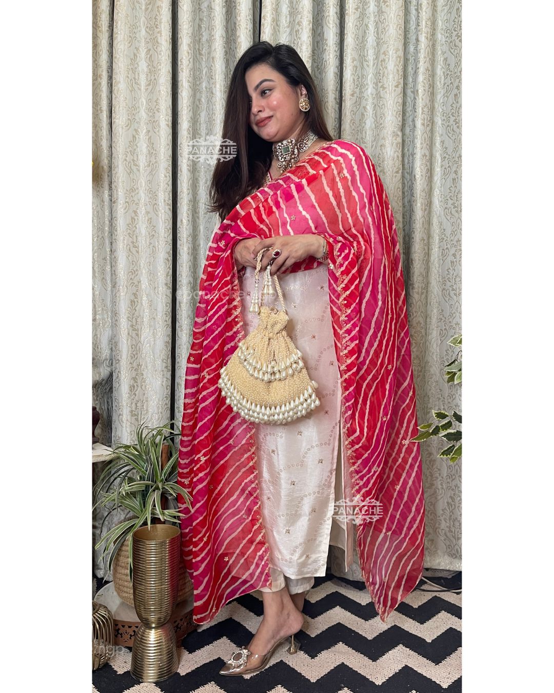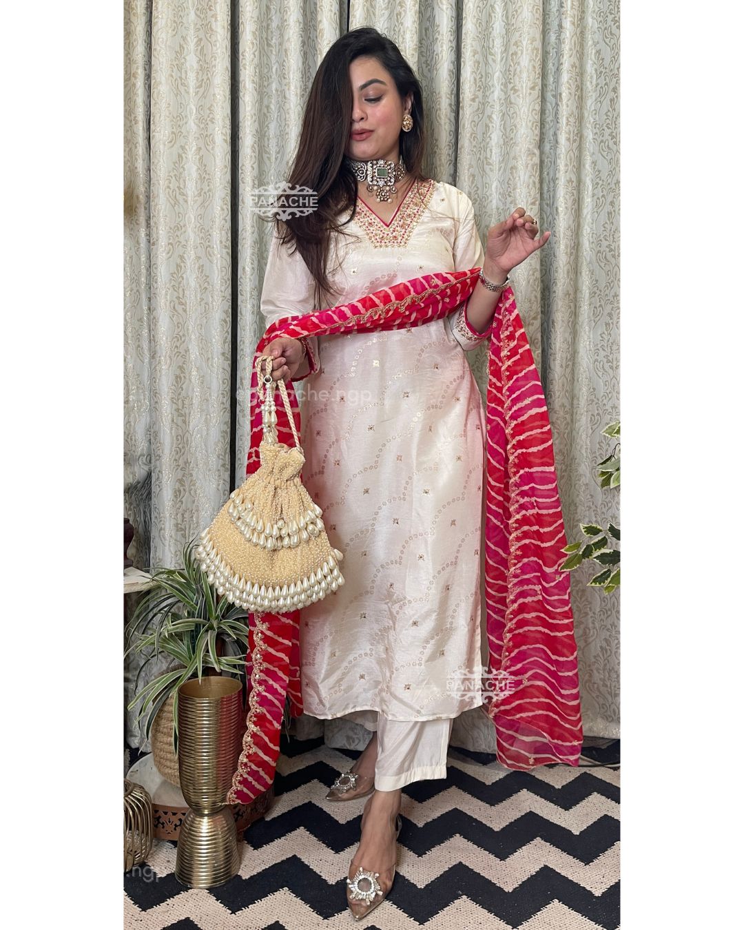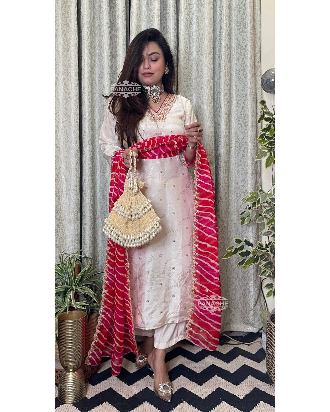 🟣 Banarsi kurta pant set with lehriyan dupatta, machine scalloped work on dupatta, intricate handwork in kurta neckline and sleeves