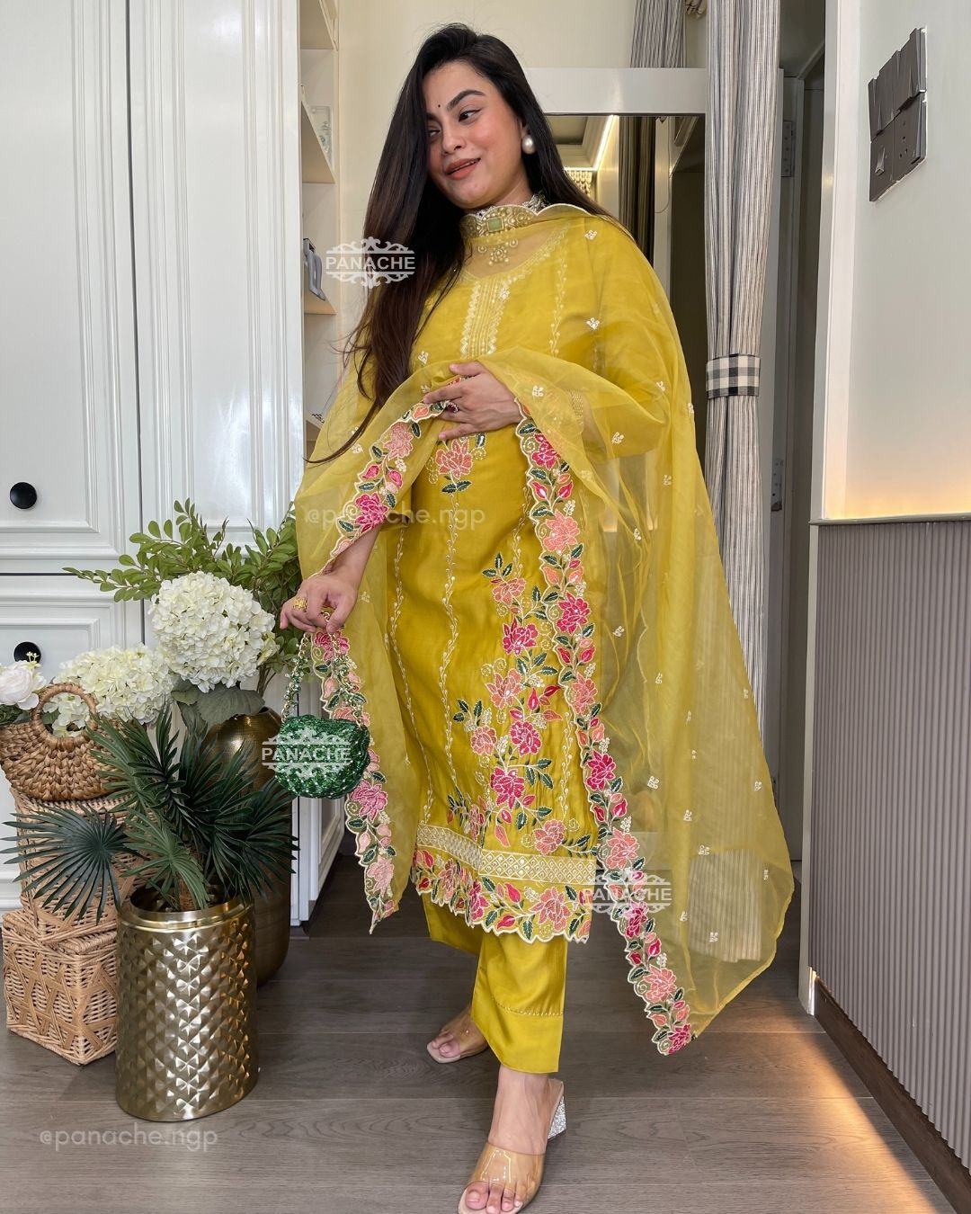 🟣 Contrast Floral embroidery in kurta with cutwork borders on dupatta and plain pants