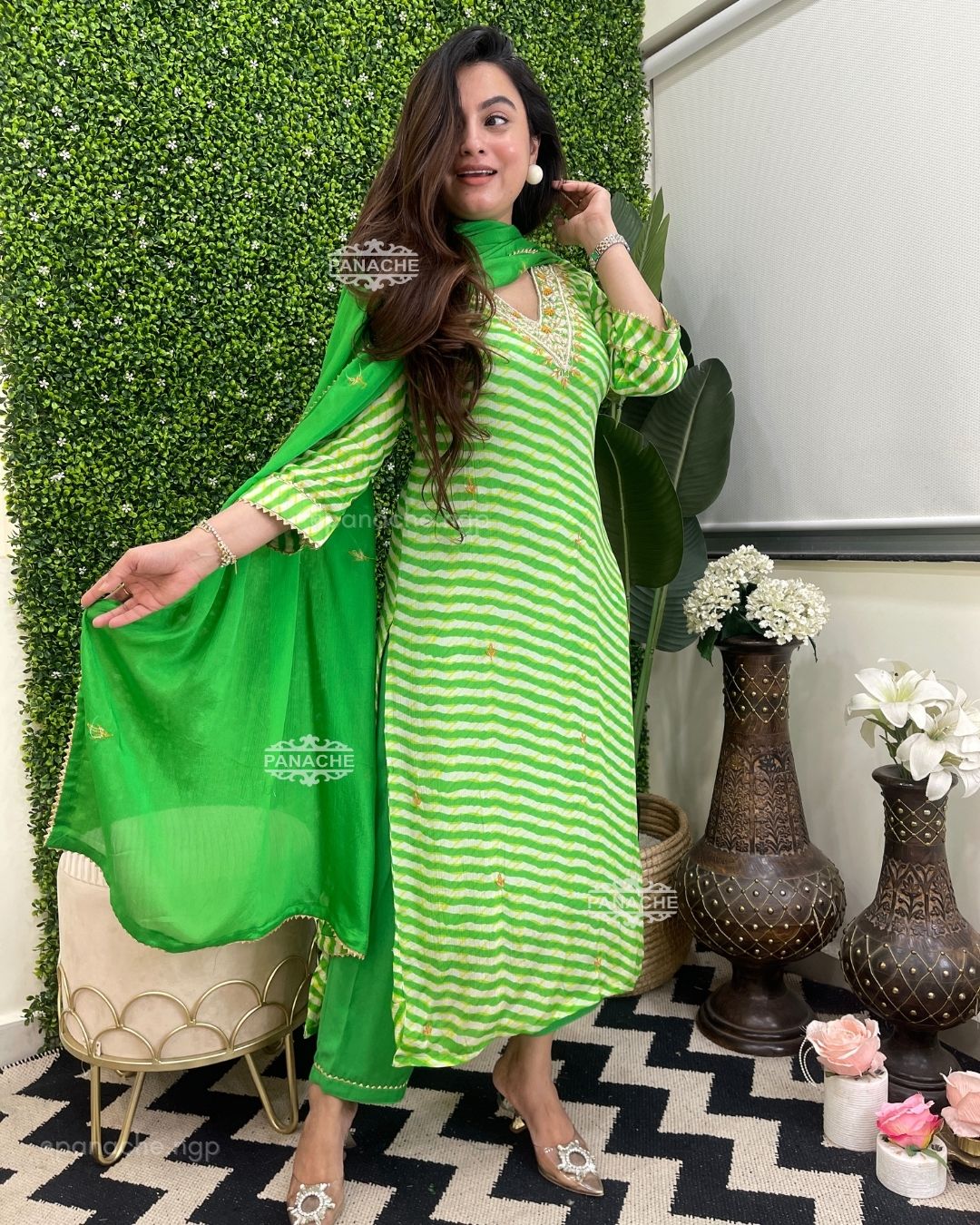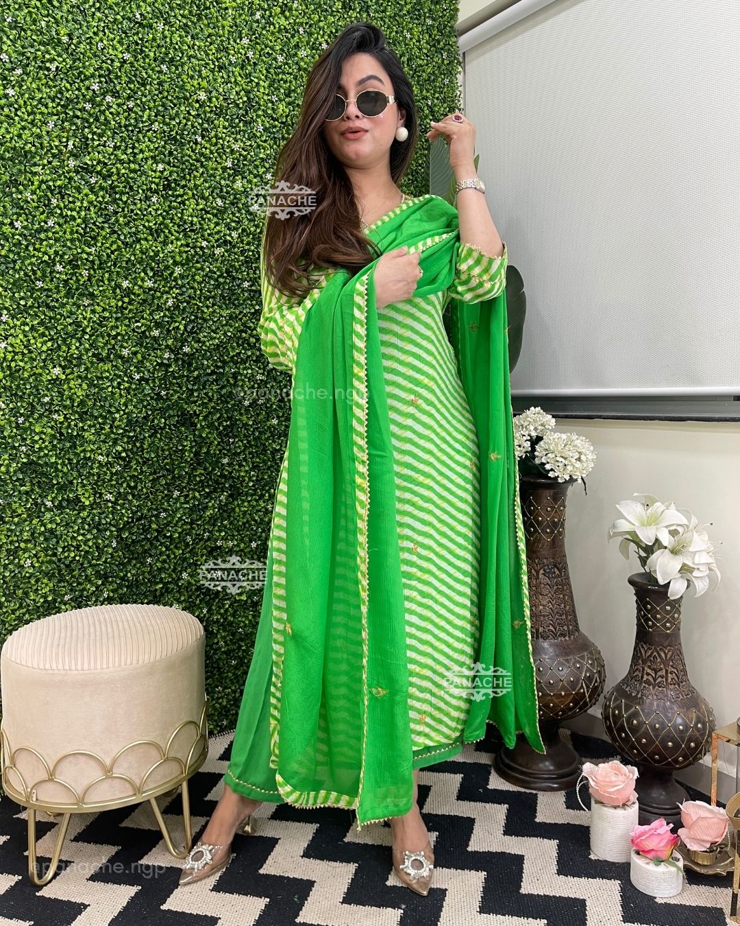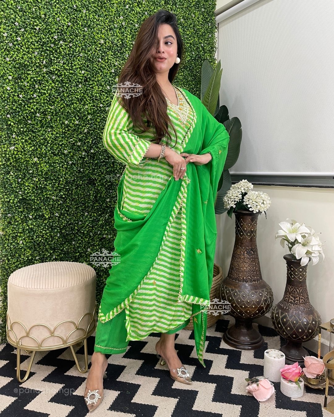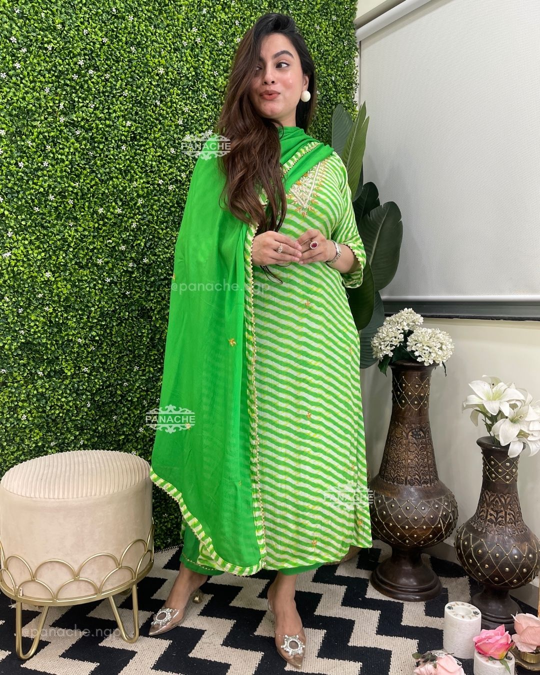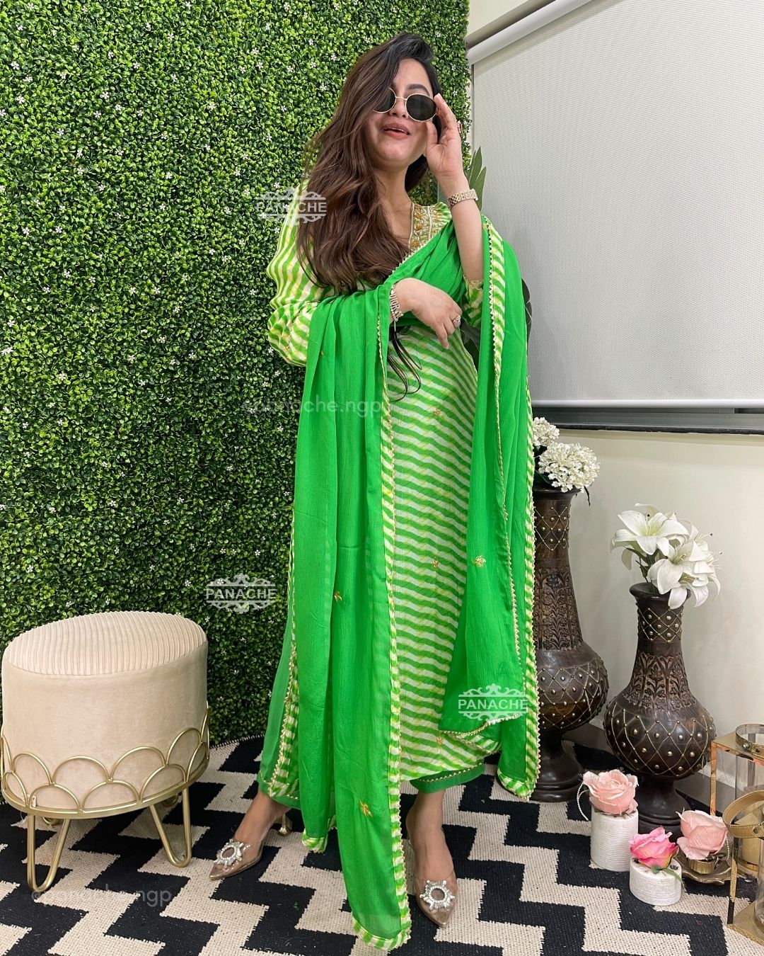 🟣 A fresh splash of green leheriyan made with the finest and purest fabric
