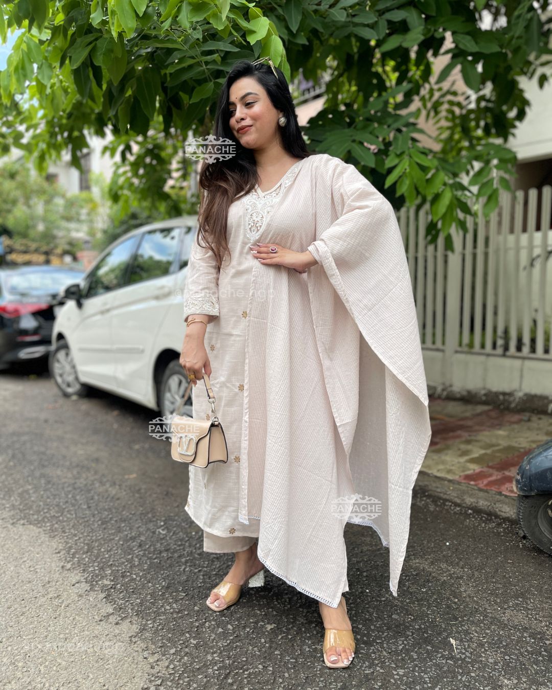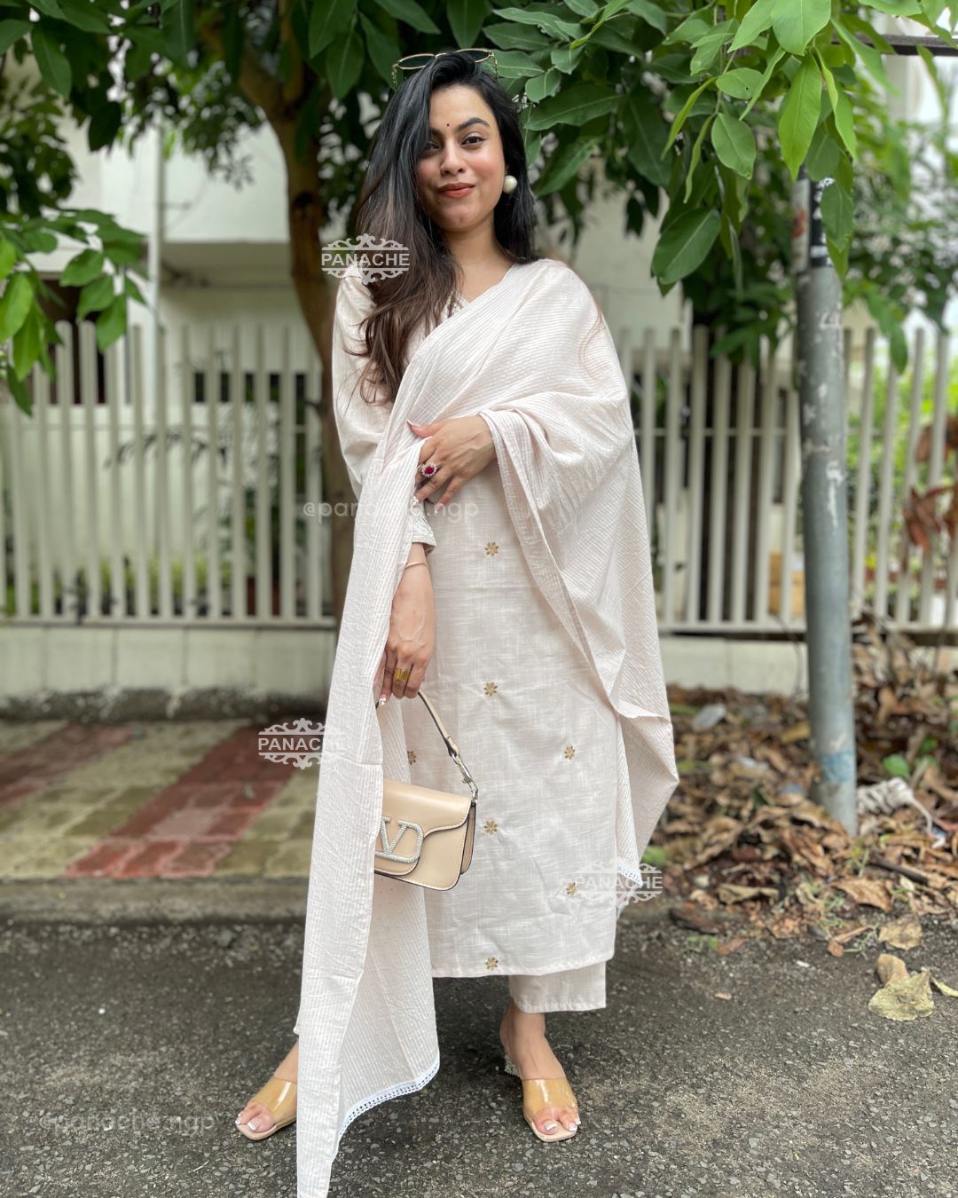 🟣 Contrast thread embroidery on neckline and sleeves with small buttas on kurta, self dupatta ans plain pants