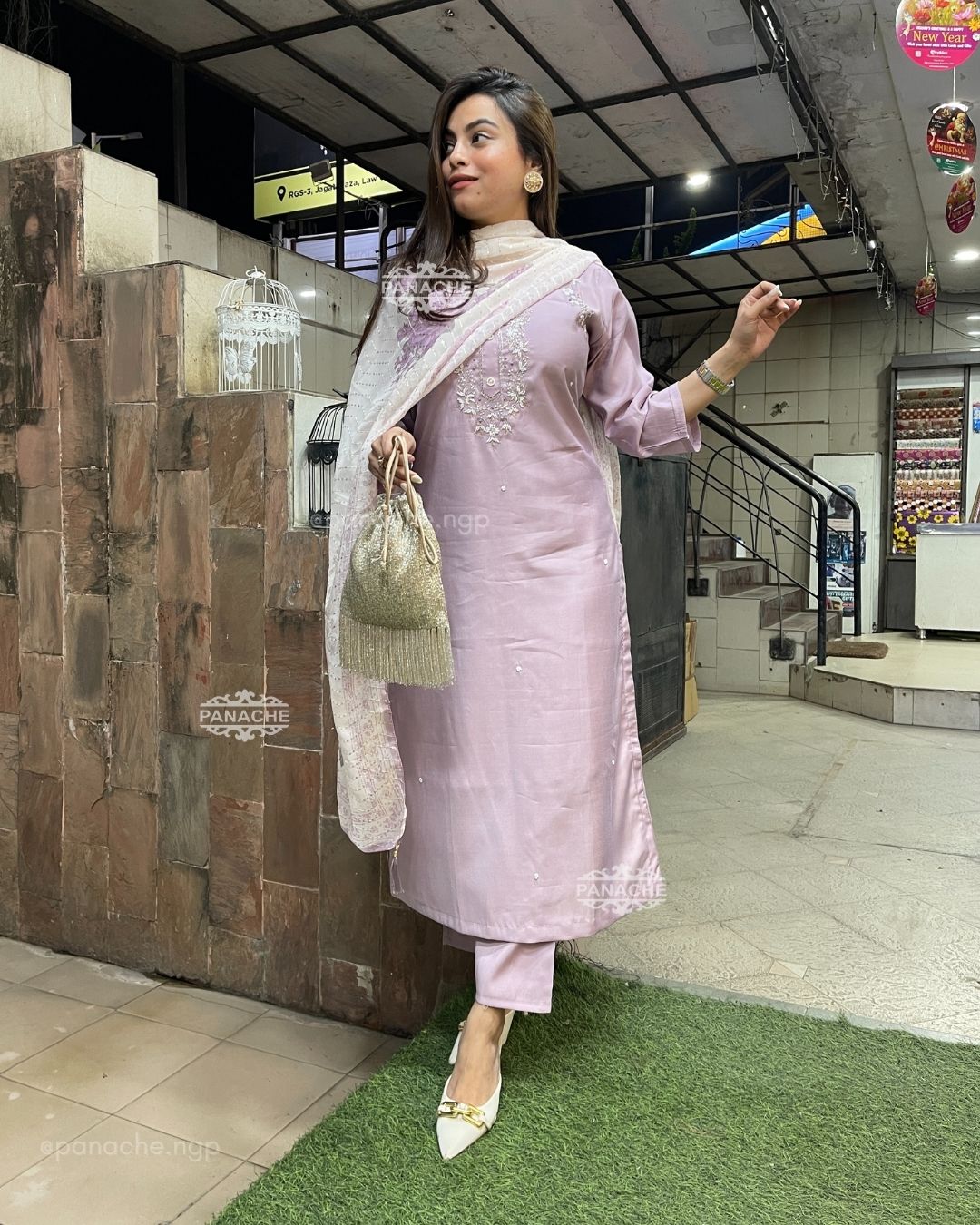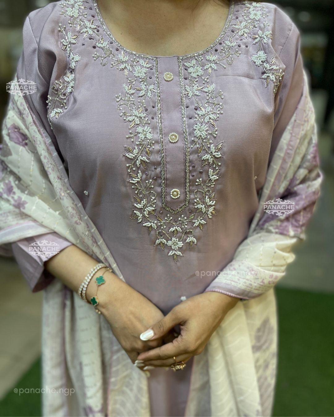 🟣 A budget set with silver handwork on neckline with shimmer sequin and floral dupatta with tassels