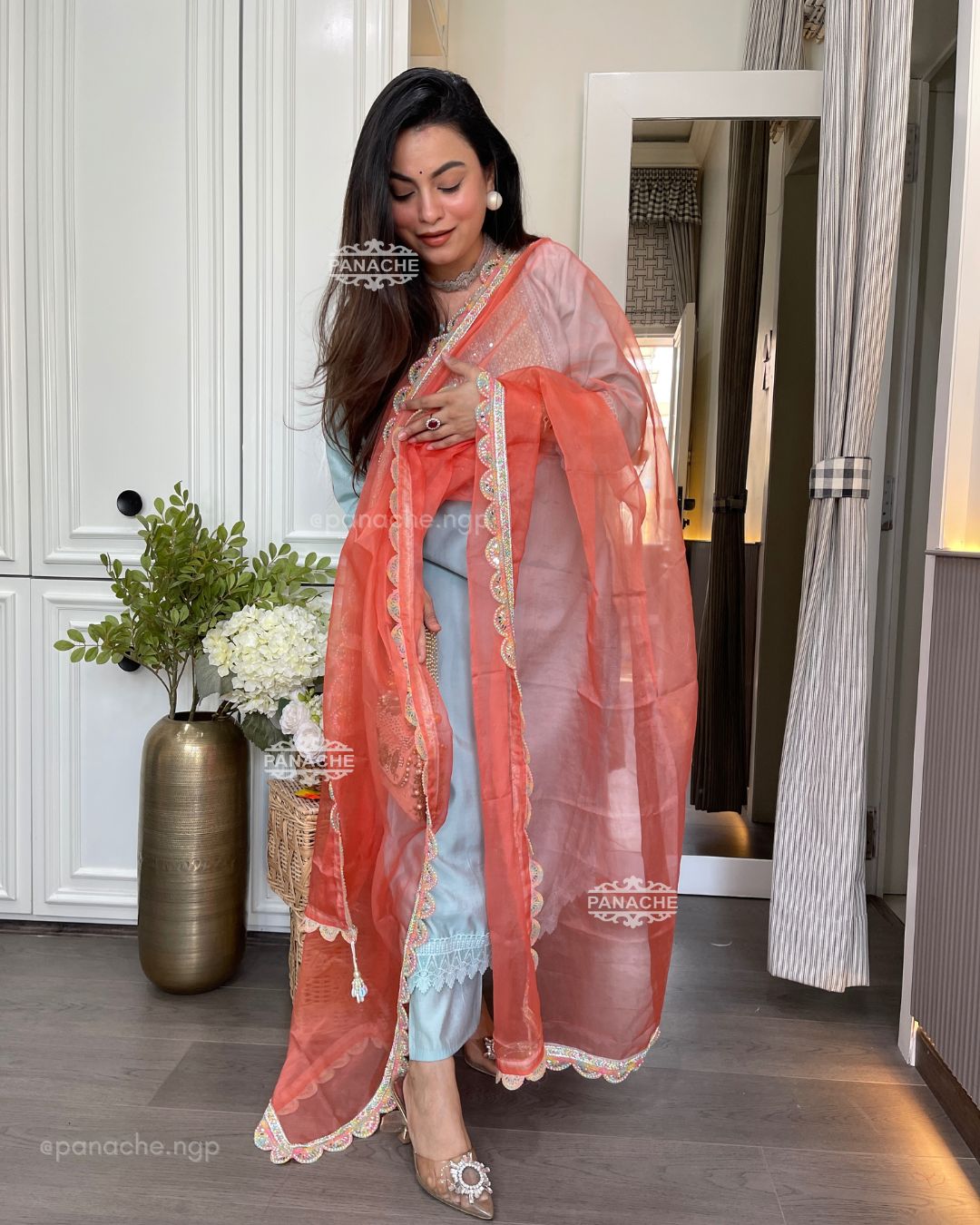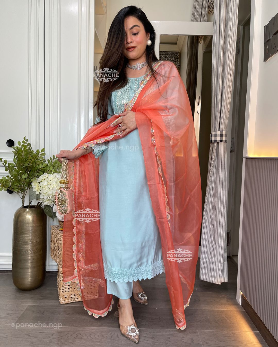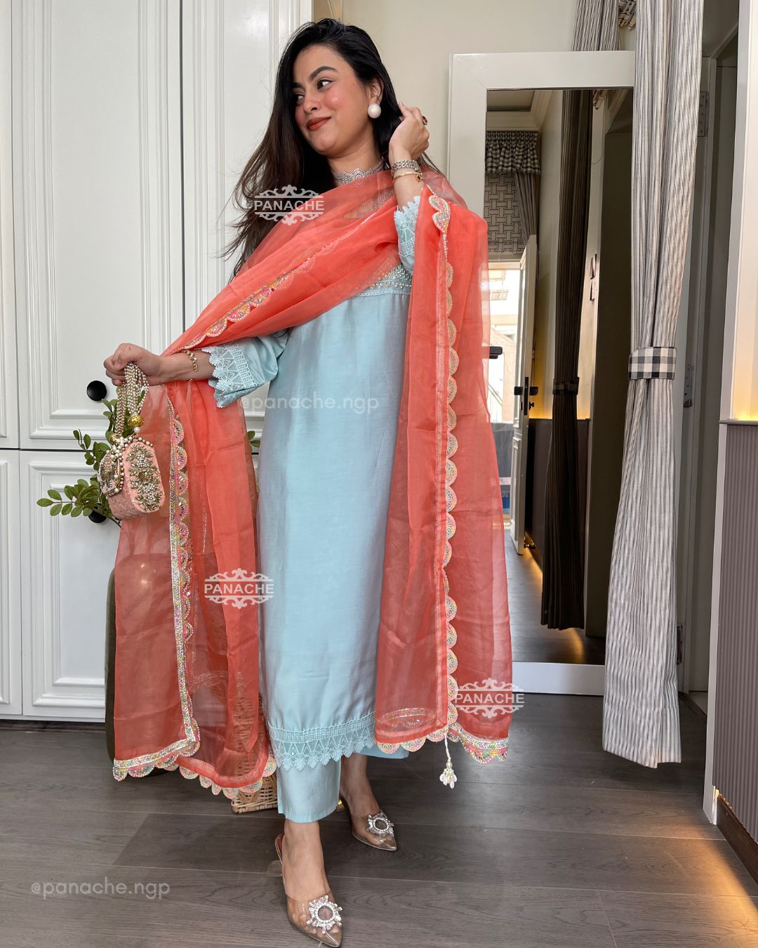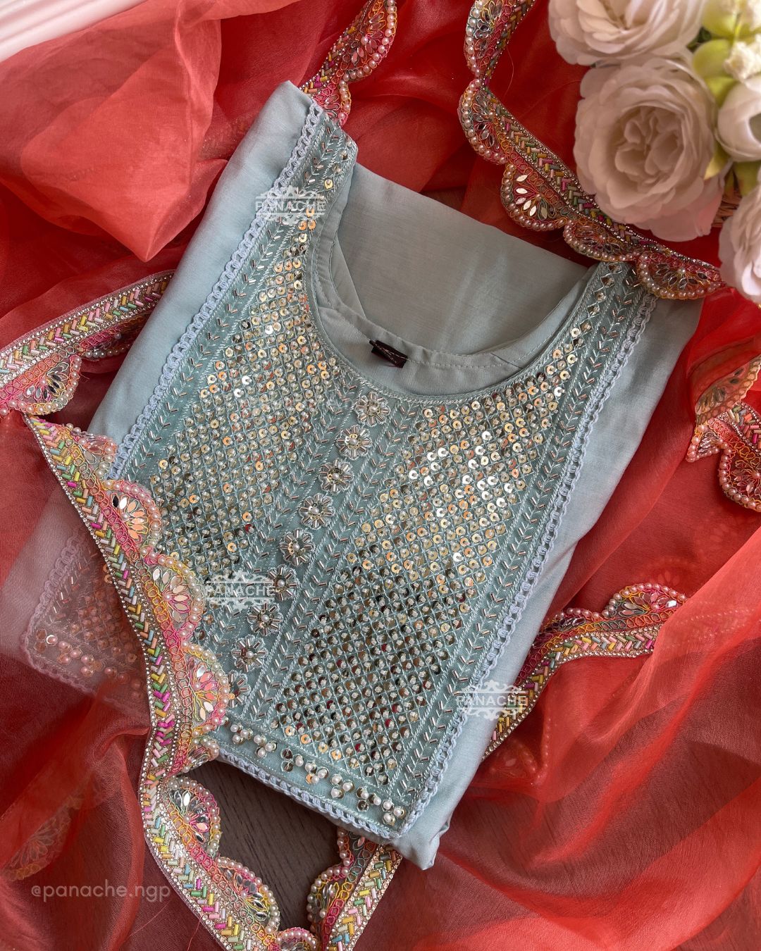🟣 Cut pipe silver and pearl embroidered kurta neckline with detailed sleeves and Daman