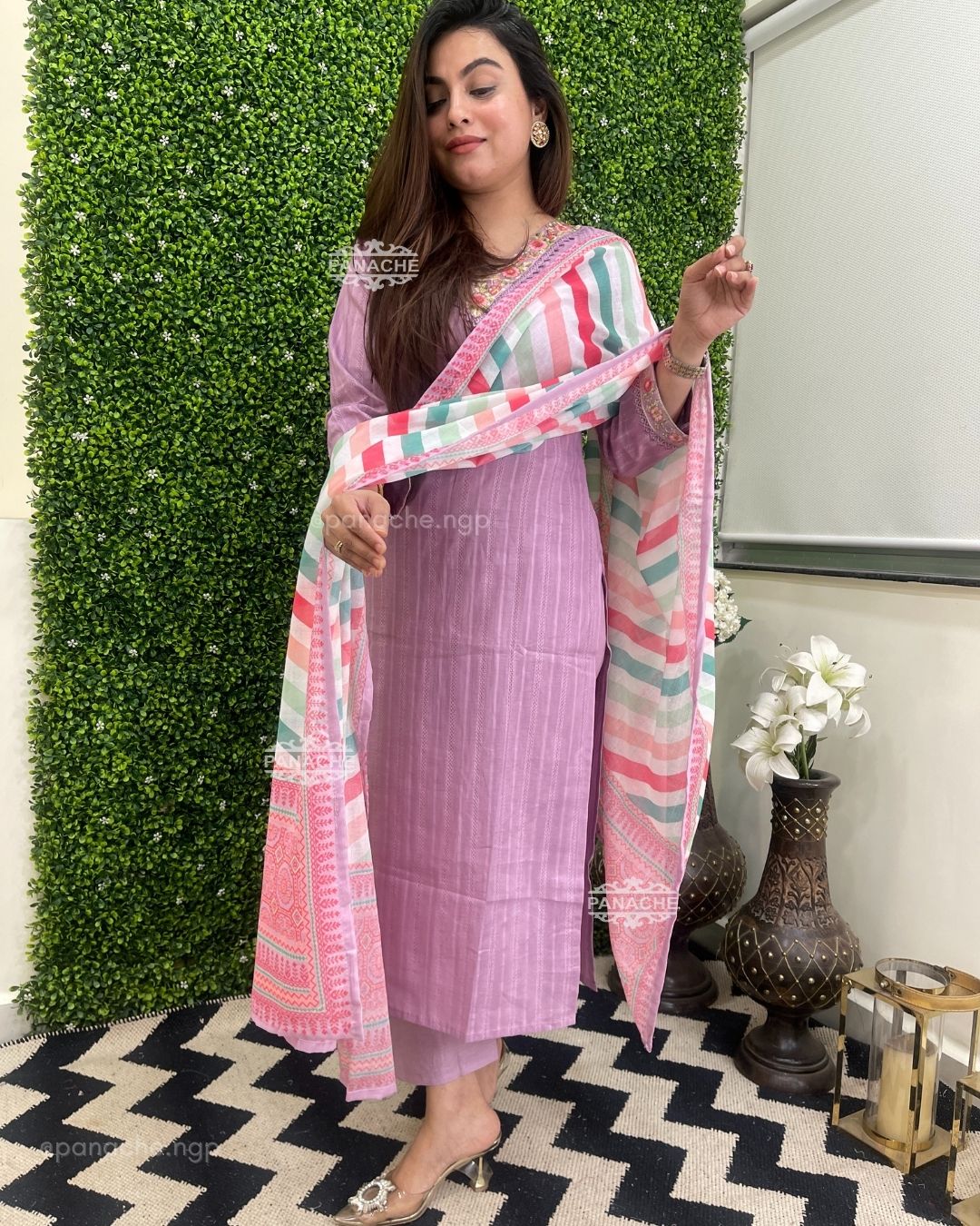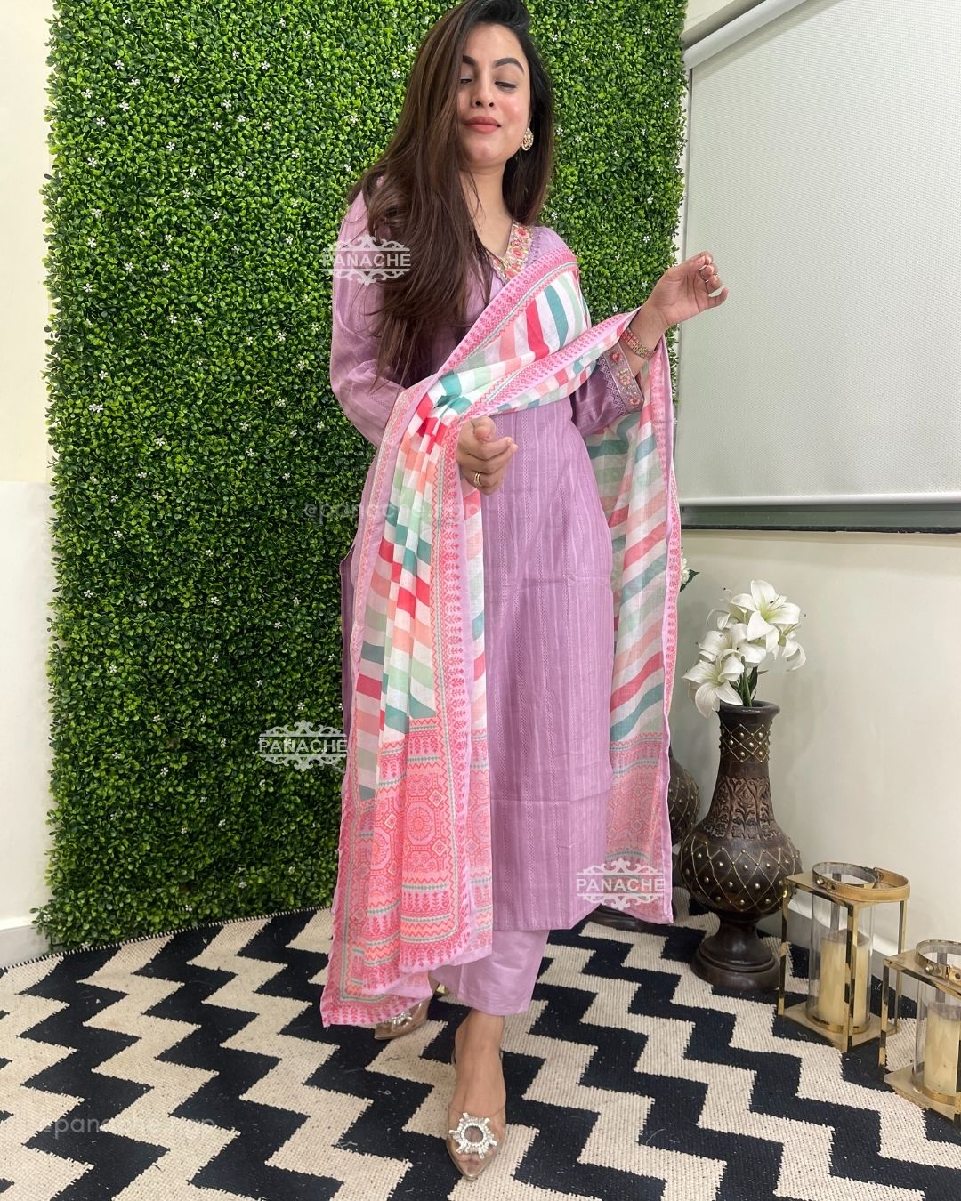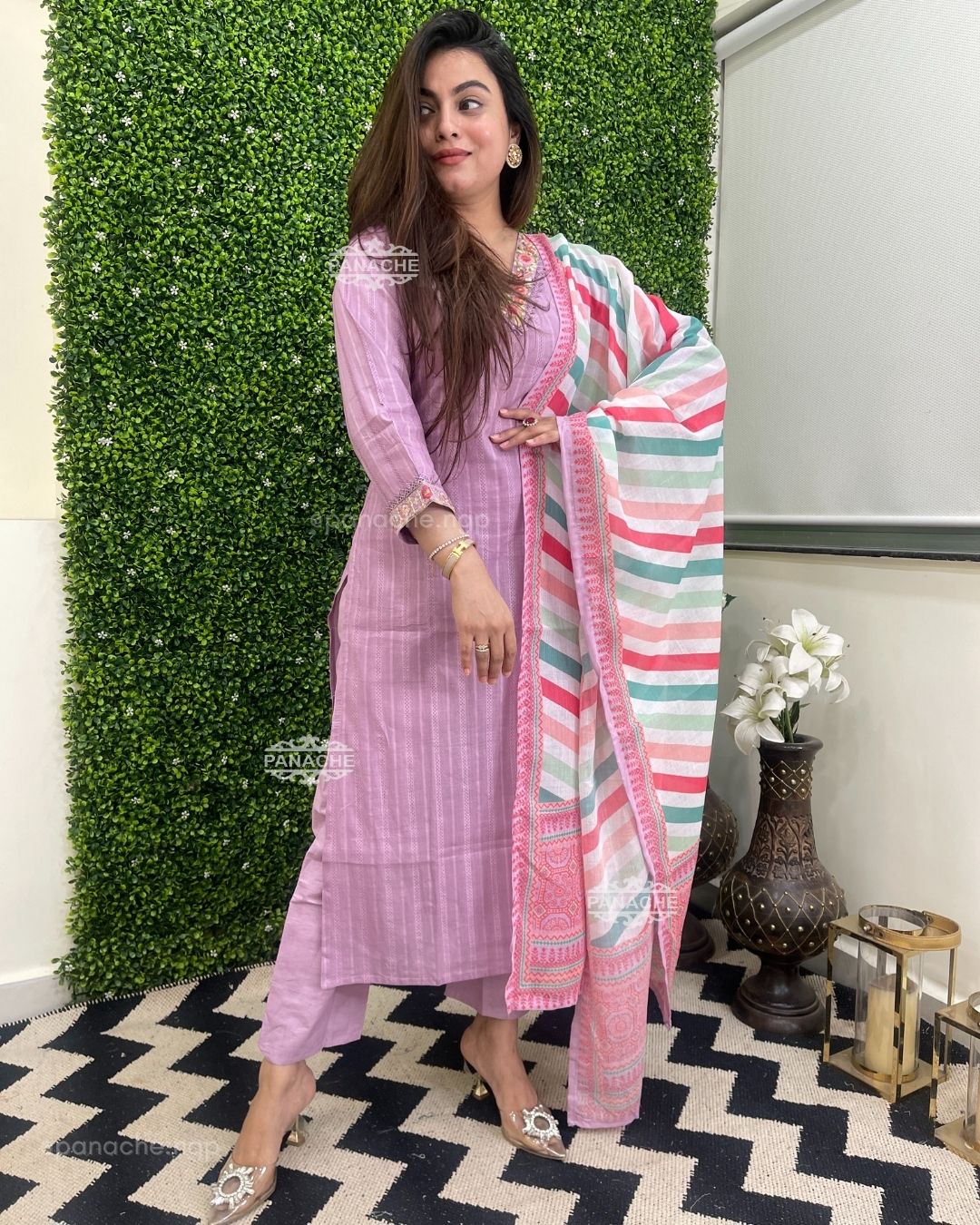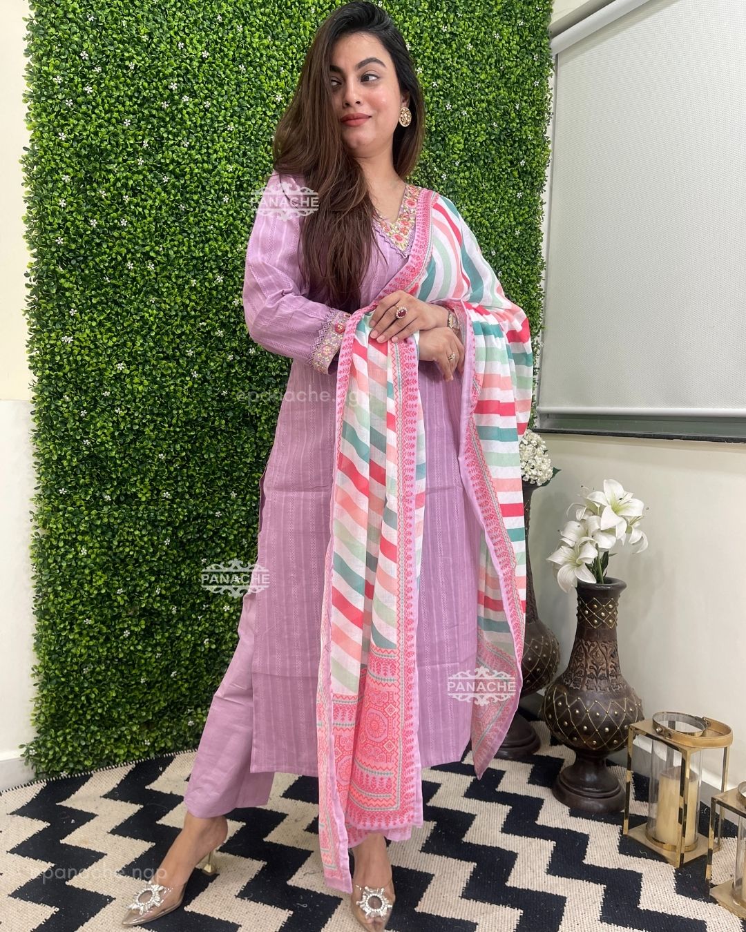 🟣 Embroidered neckline in contrast same on sleeves and a self-print kurta with plain pants and the most adorable shades of pink peach blue & lilac on the dupatta!