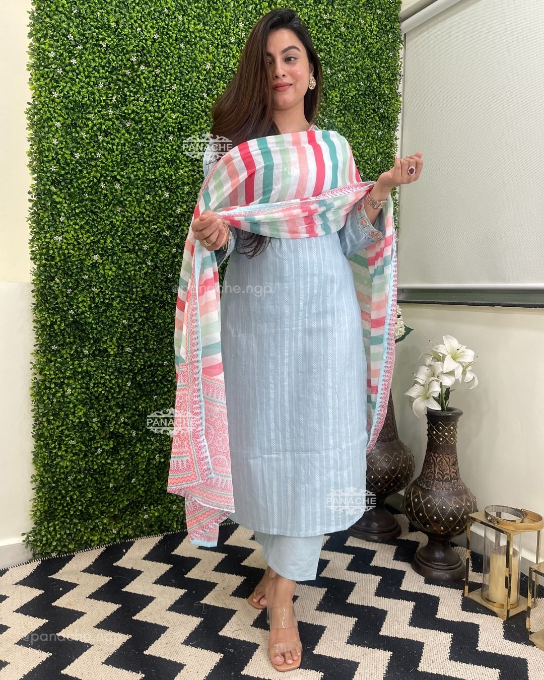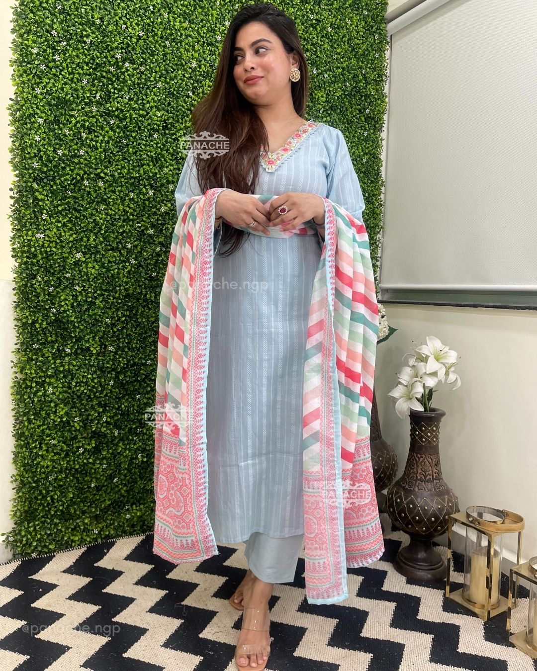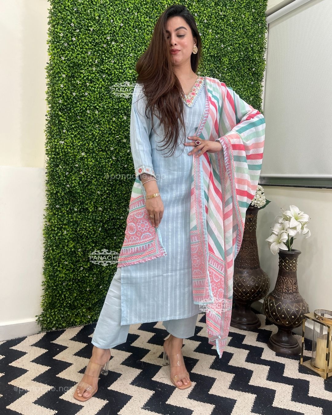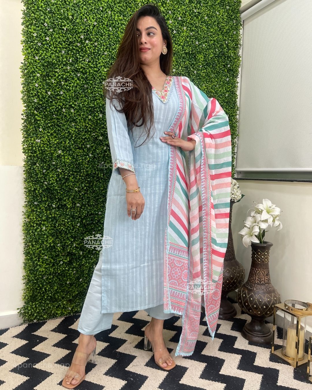 🟣 Embroidered neckline in contrast same on sleeves and a self-print kurta with plain pants and the most adorable shades of pink peach blue & lilac on the dupatta!