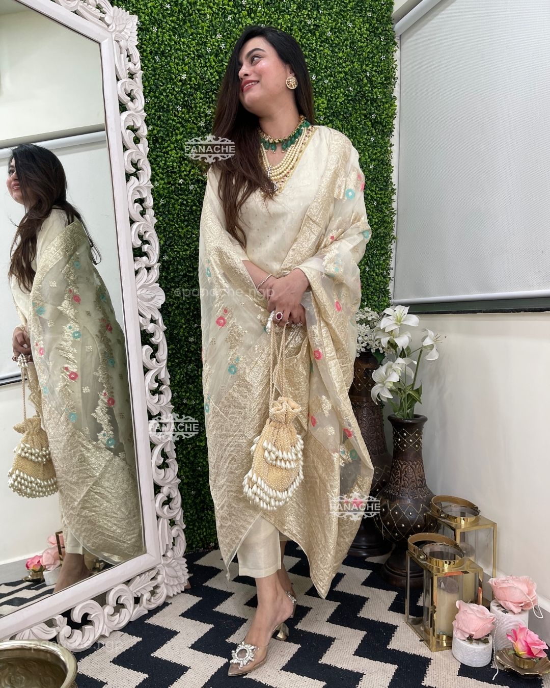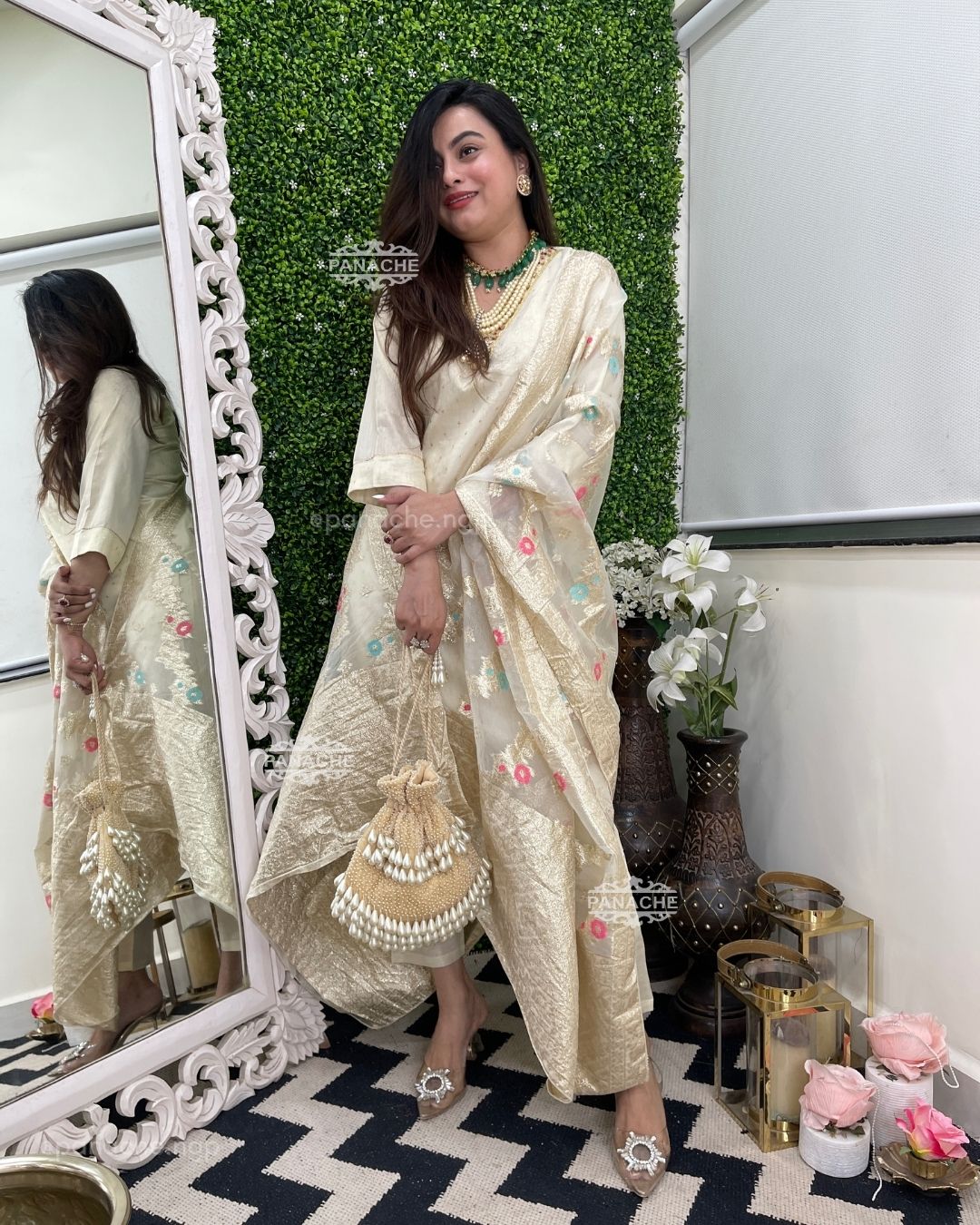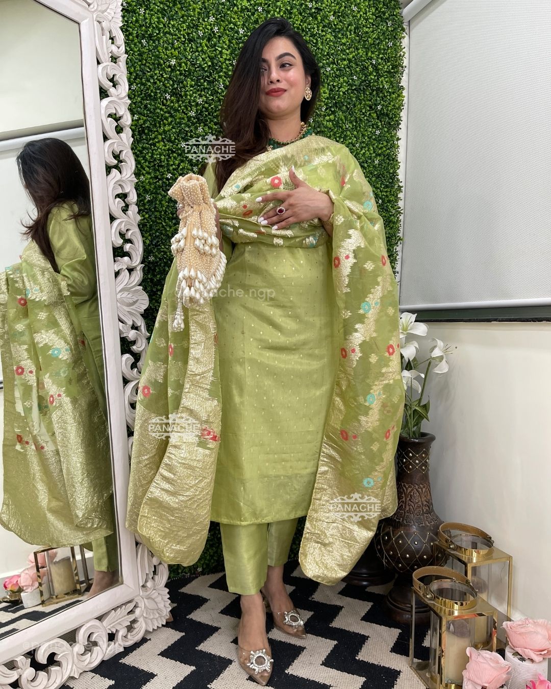 🟣 Self butti tissue kurta with pants and a heavy tissue dupatta with coloured buttas giving December feels