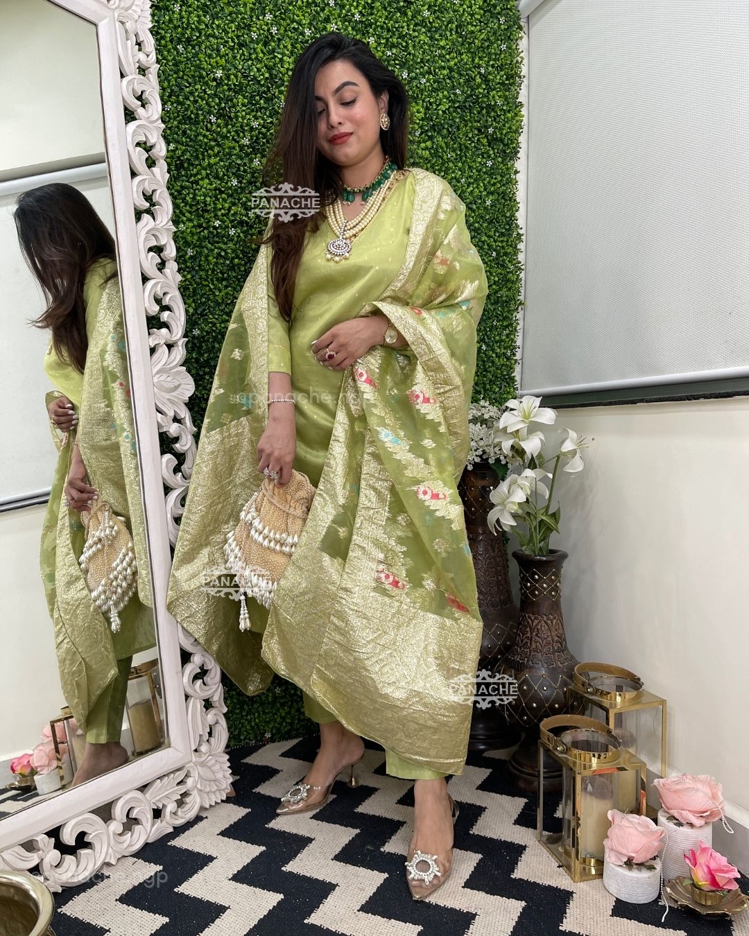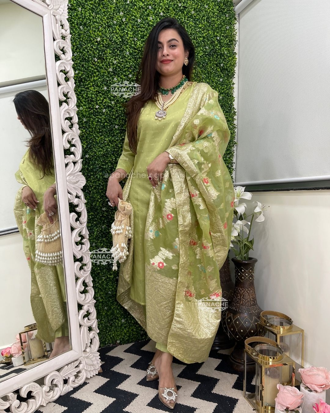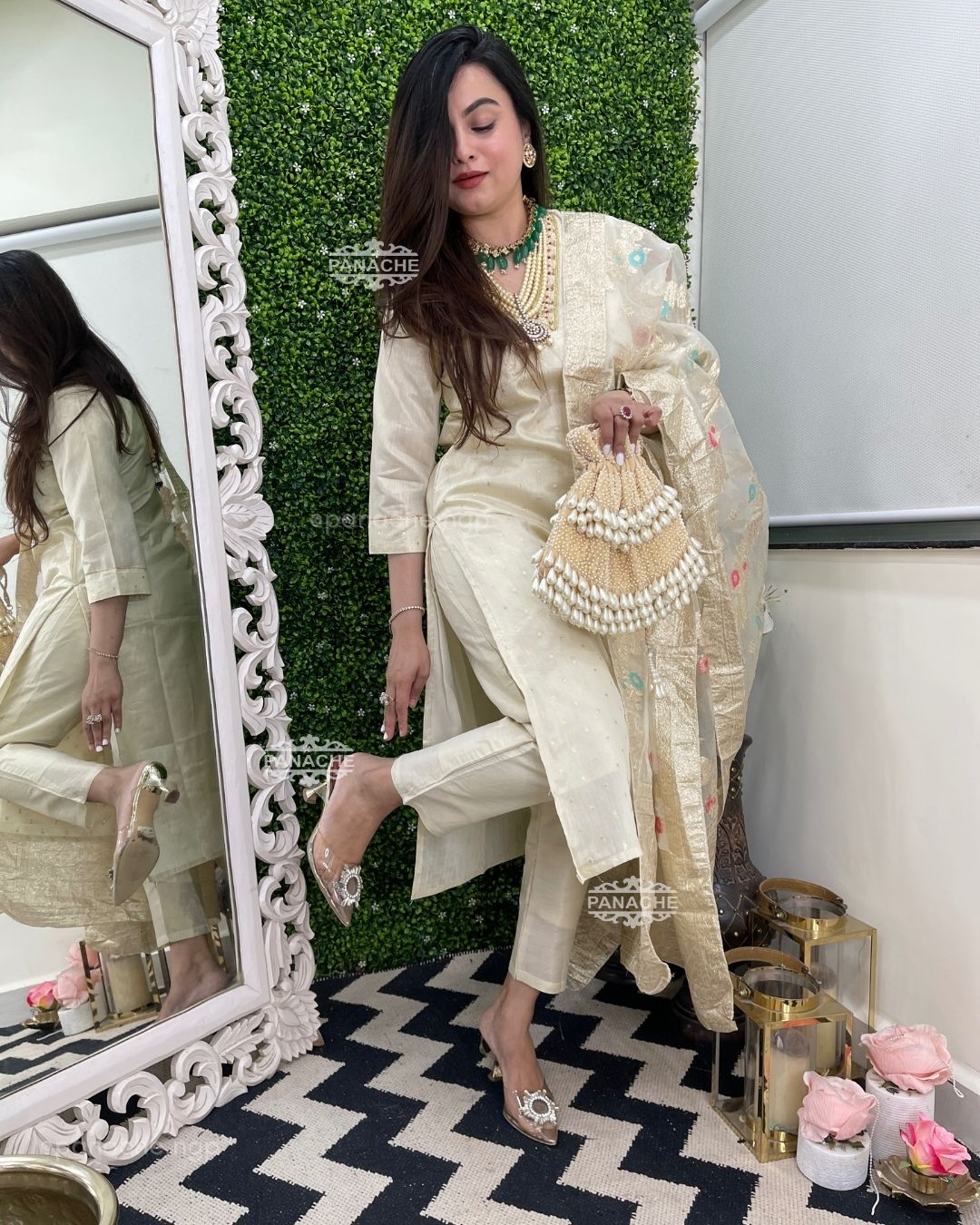 🟣 Self butti tissue kurta with pants and a heavy tissue dupatta with coloured buttas giving December feels