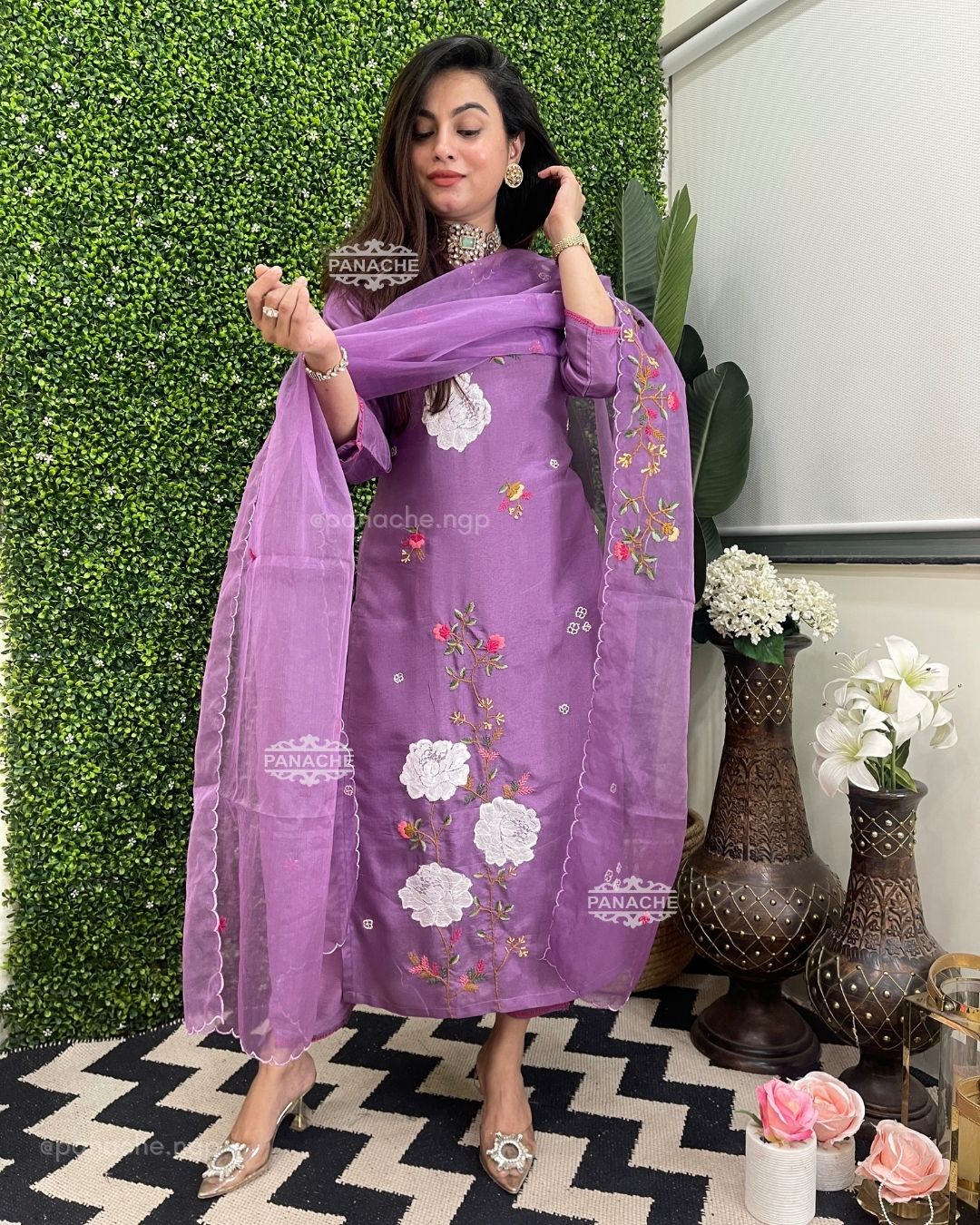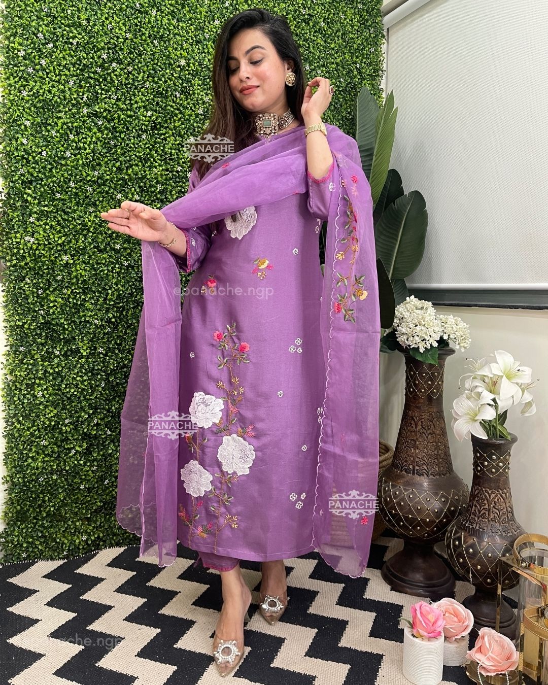 🟣 French knot details with appliqué and contemporary embroidery on kurta & dupatta, bright and cute buttis all over dupatta