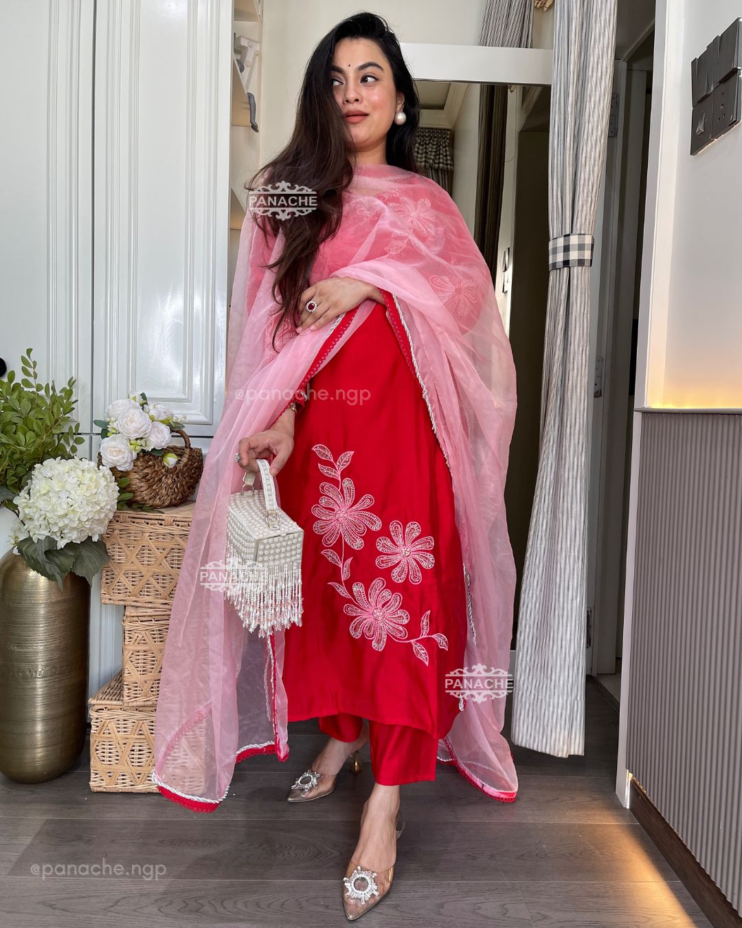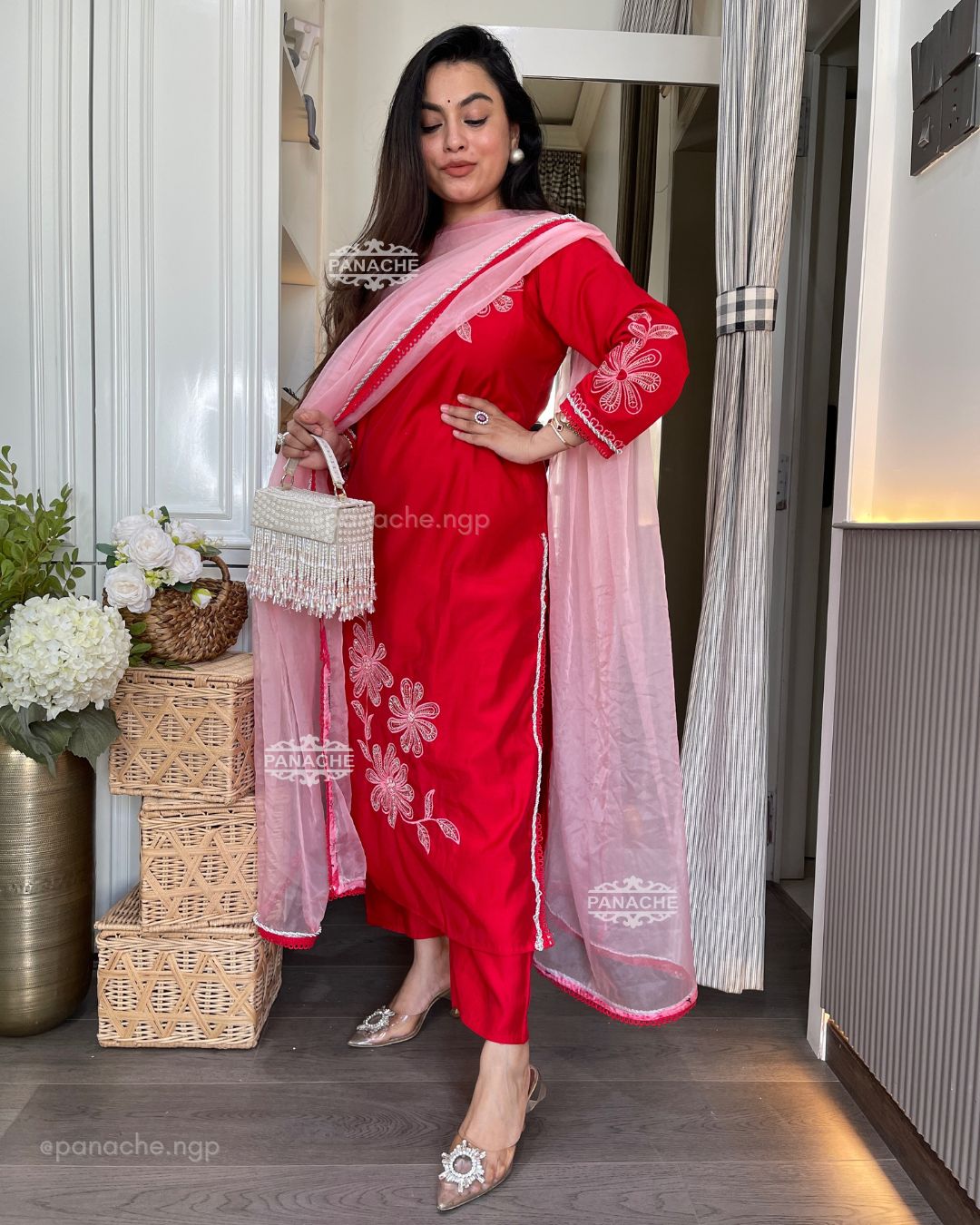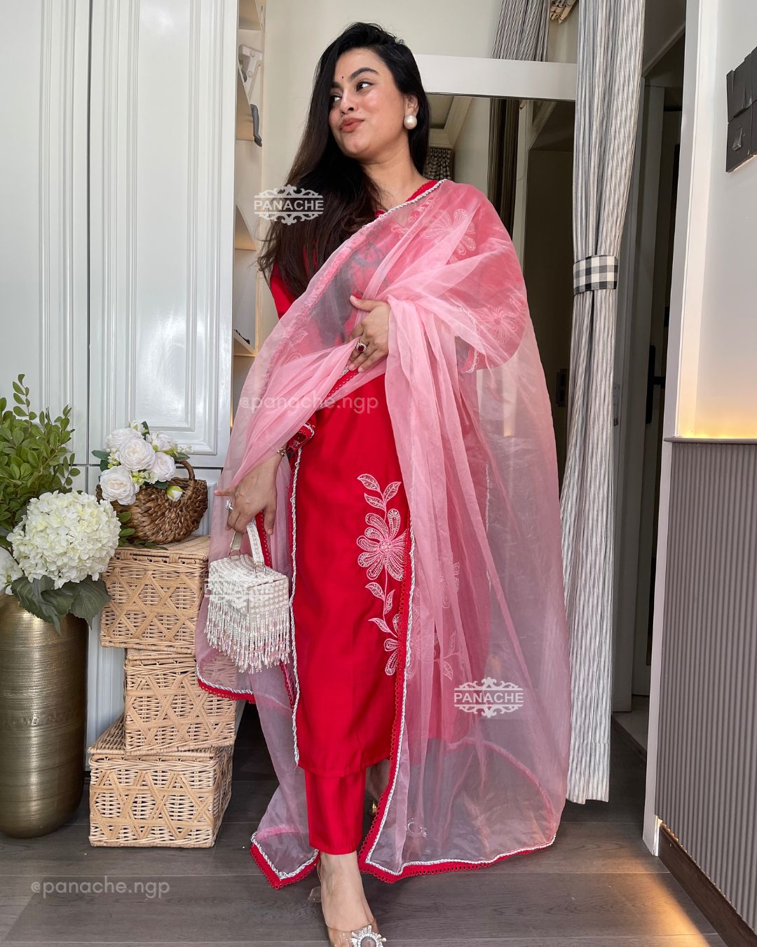 🟣 Embroidered kurta with loop lace and pearl lace details on sleeves & side slits, heavy dupatta