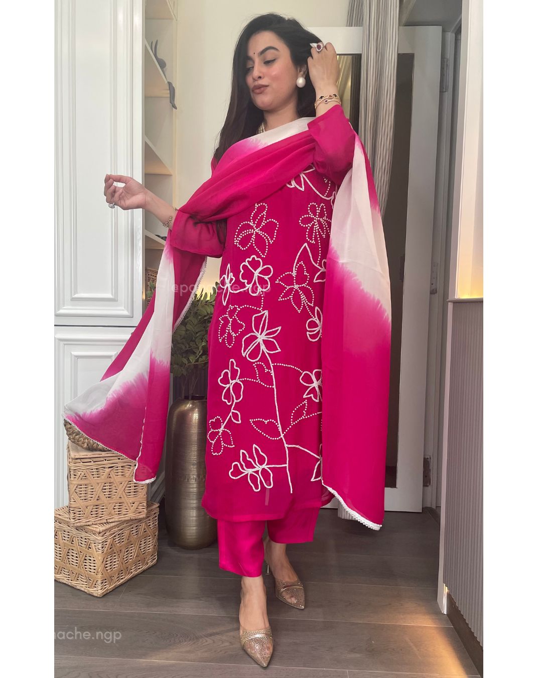 🟣 A fresh bout of fuschia pink with intricate handwork and something for all moods and occasions! A shaded dupatta with delicate pearl lace to match