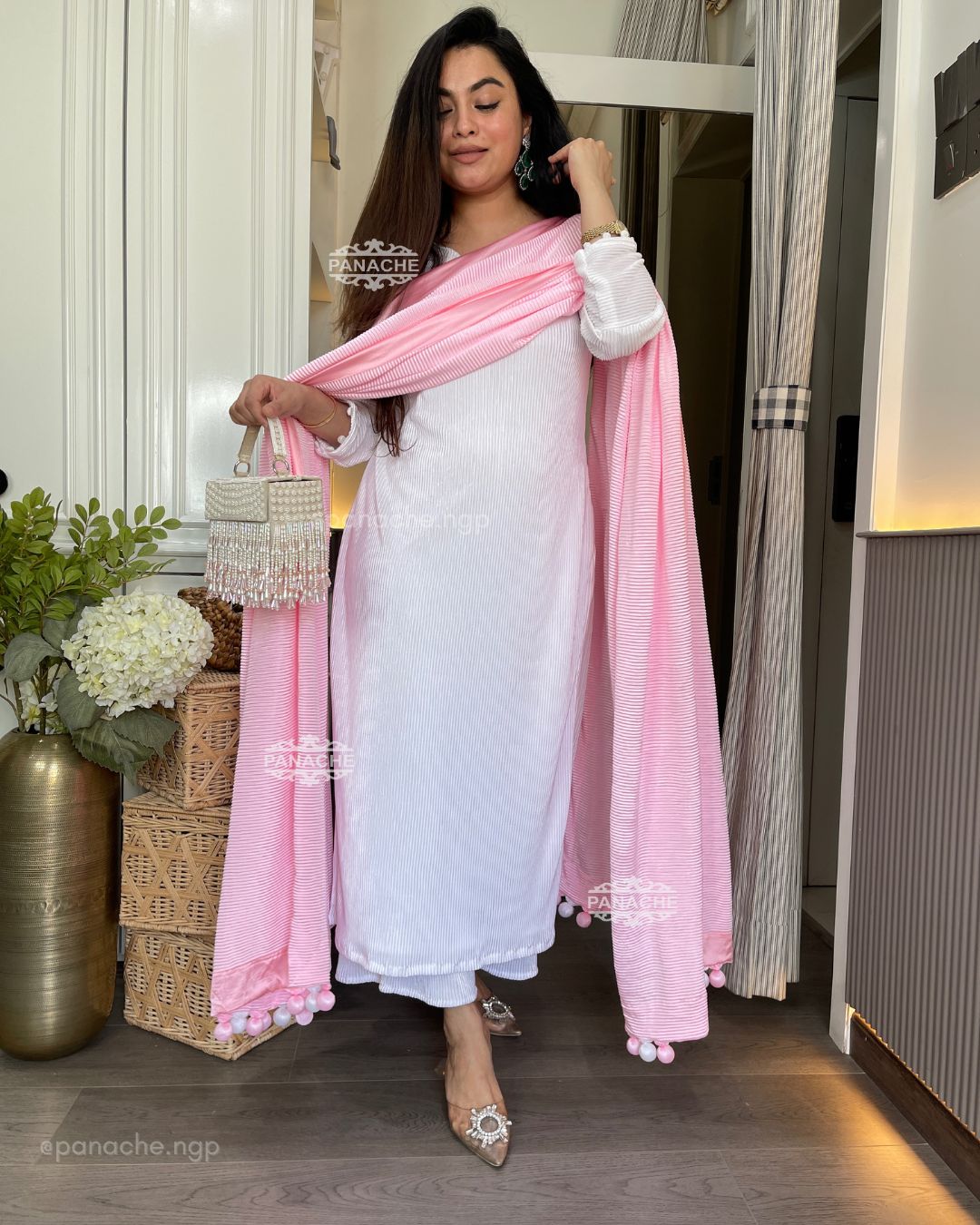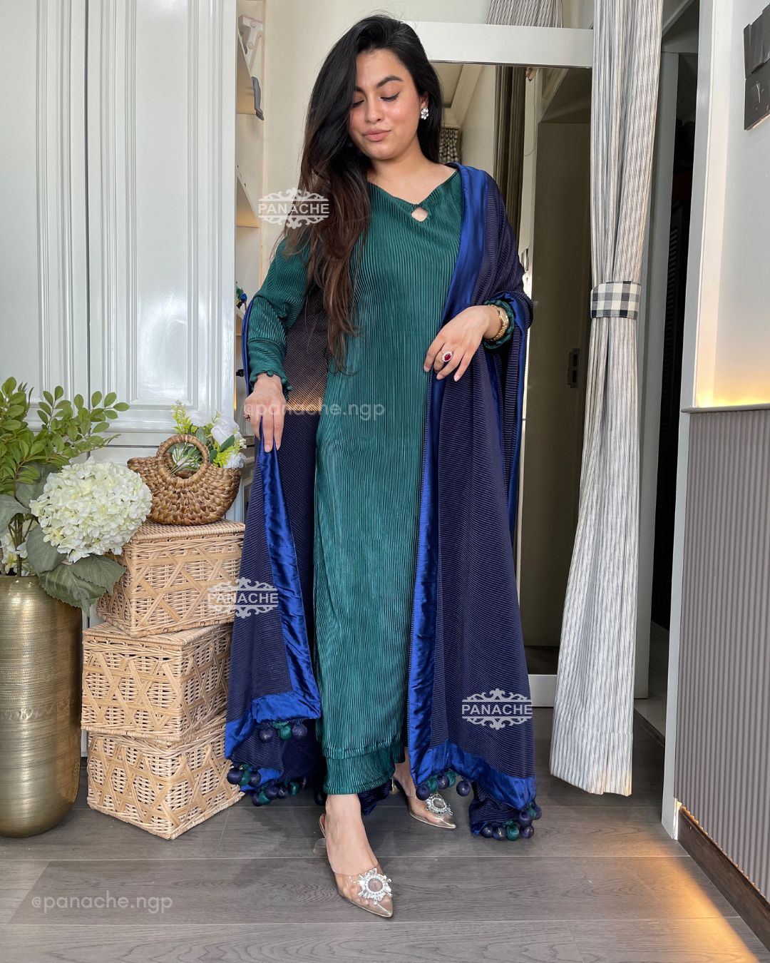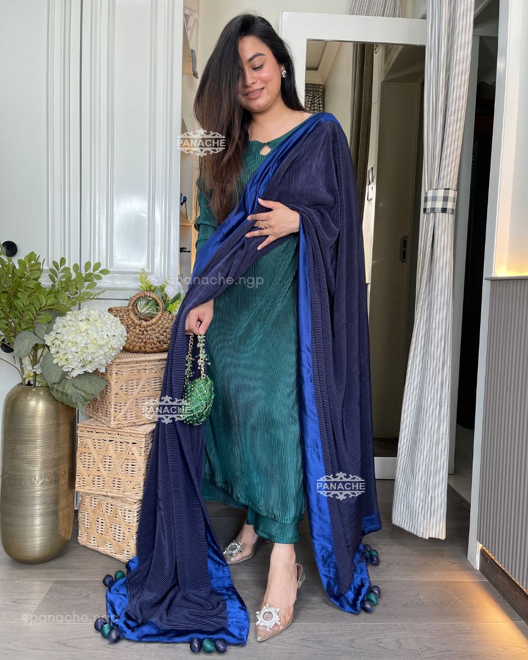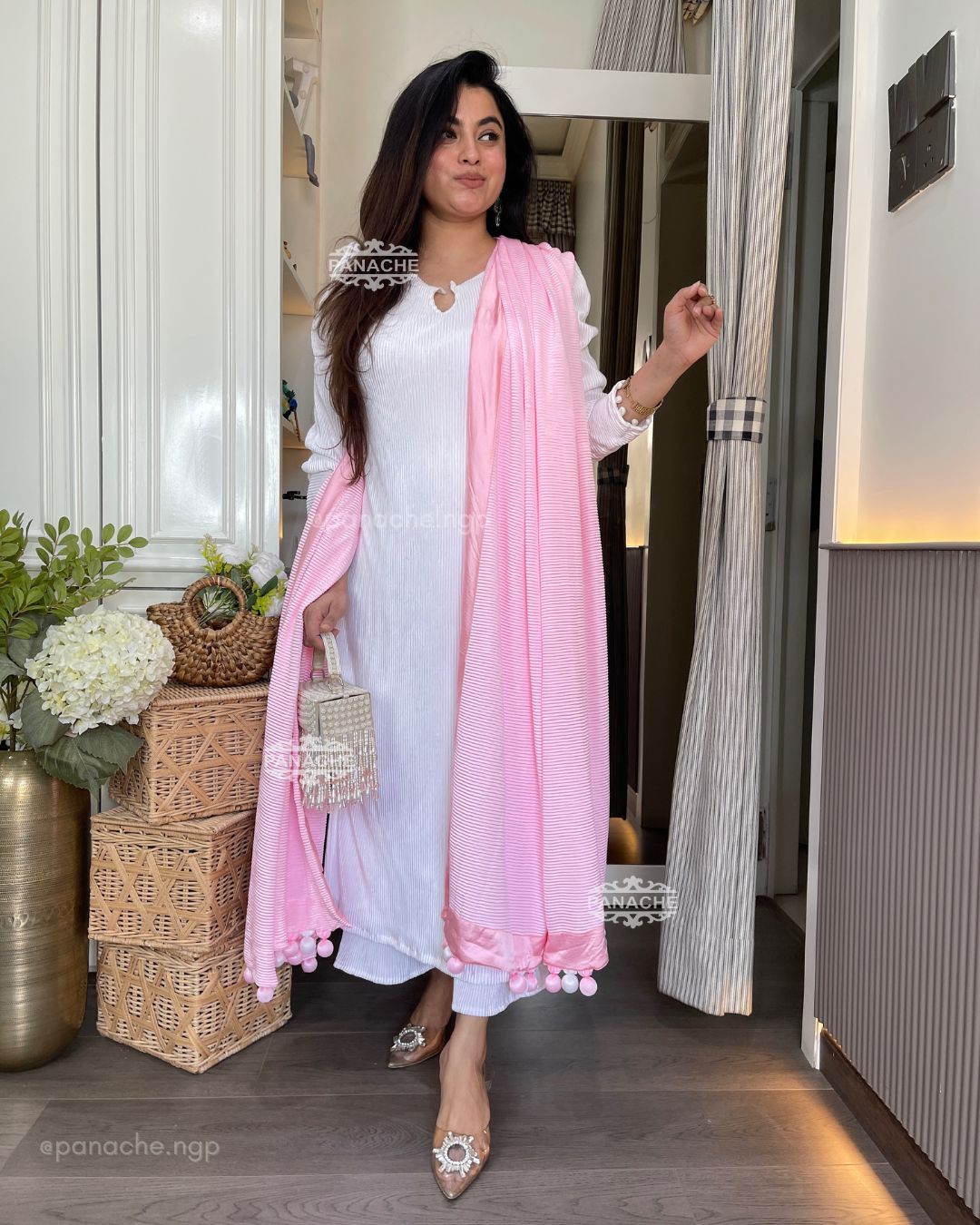 🟣 Cute classy trendy all put together for a design that’s an all entire wear! Puff sleeves with detail and Potli on sleeves, pleated dupatta with potlis on dupatta