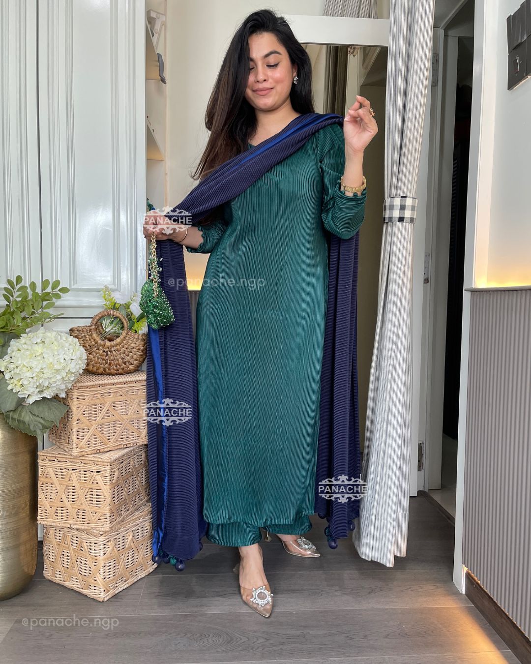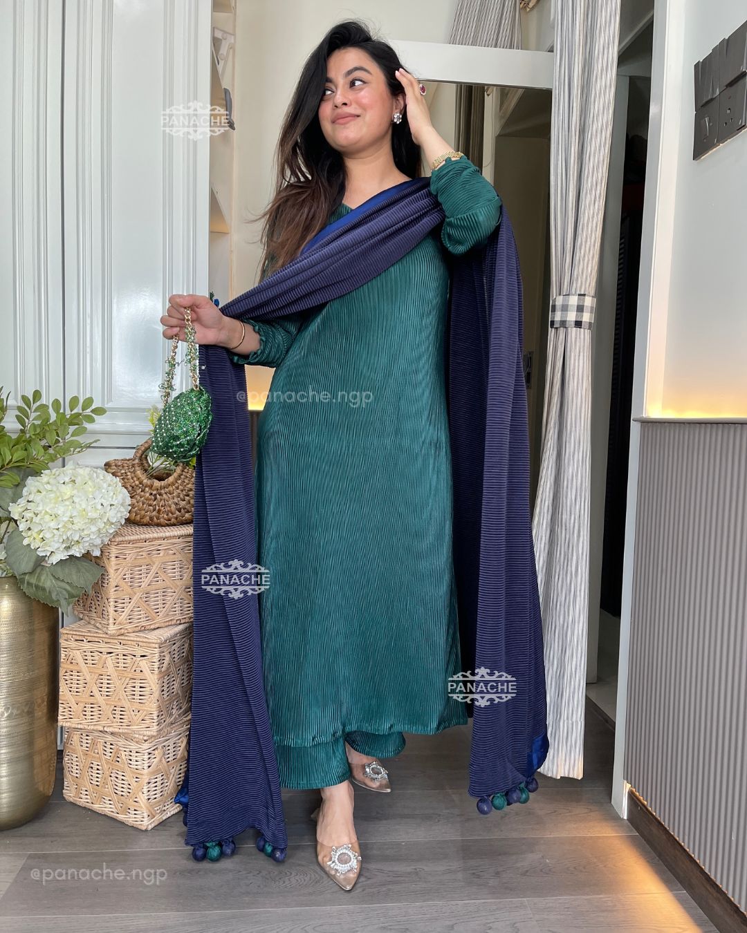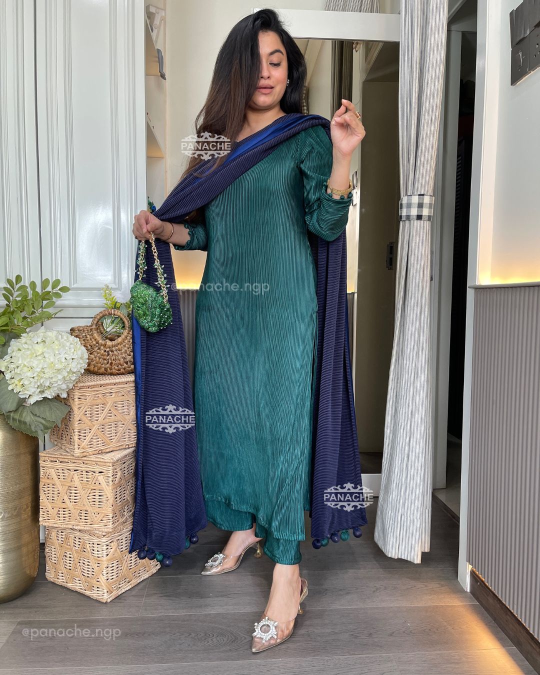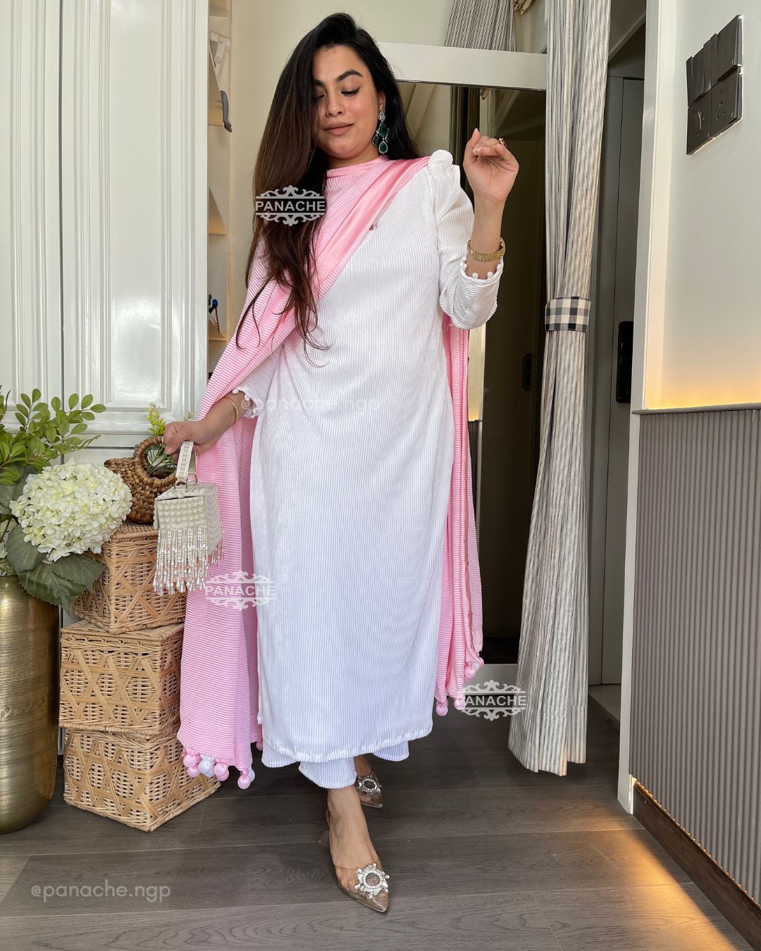 🟣 Cute classy trendy all put together for a design that’s an all entire wear! Puff sleeves with detail and Potli on sleeves, pleated dupatta with potlis on dupatta