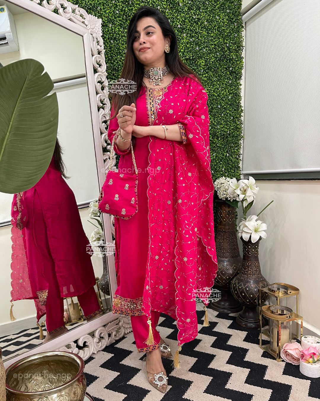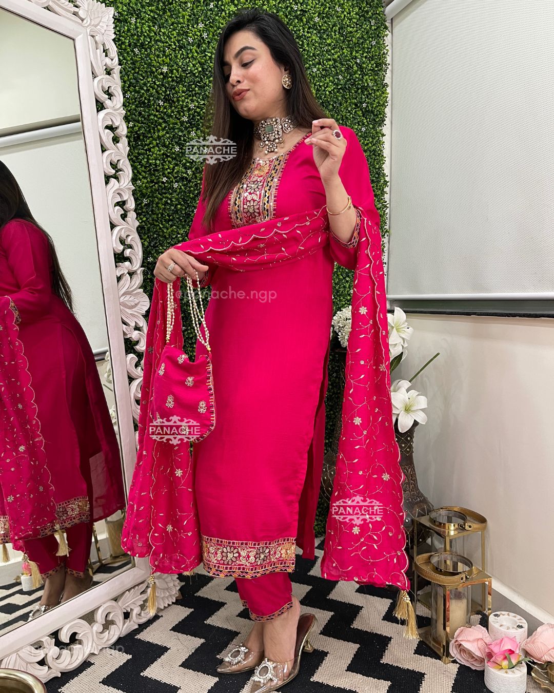🟣 Contrast neckline with heavy daman and embroidered dupatta and a matching potli bag!