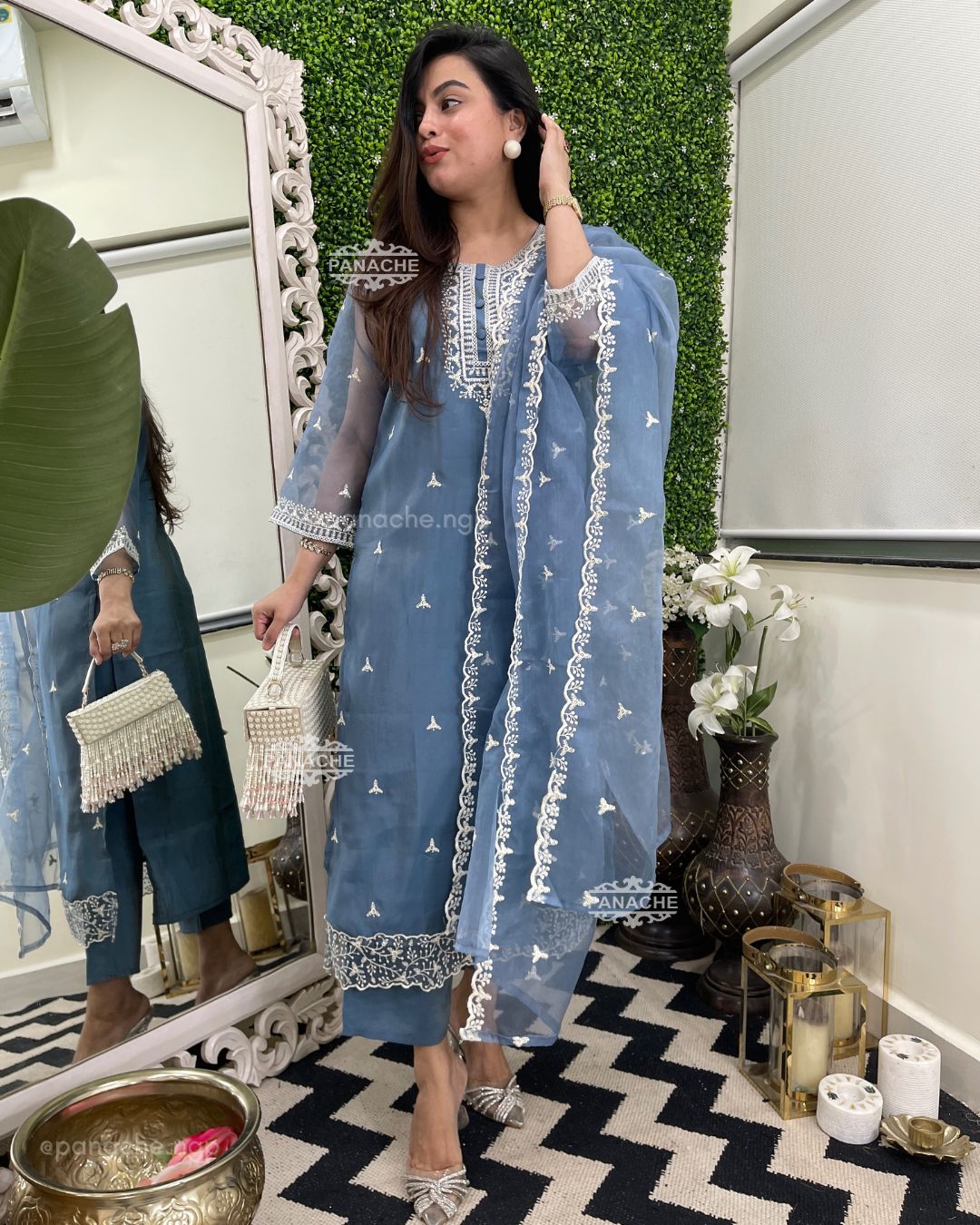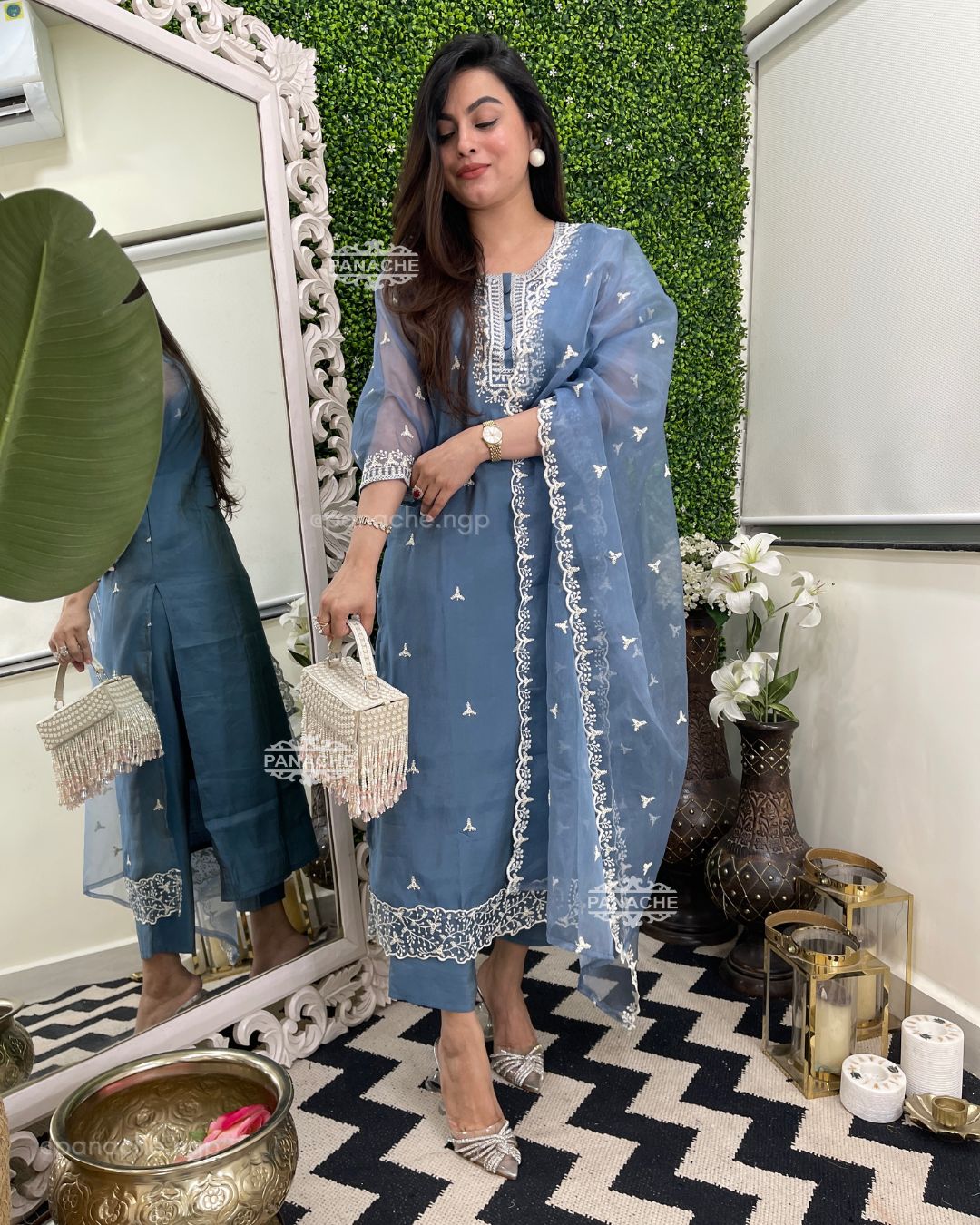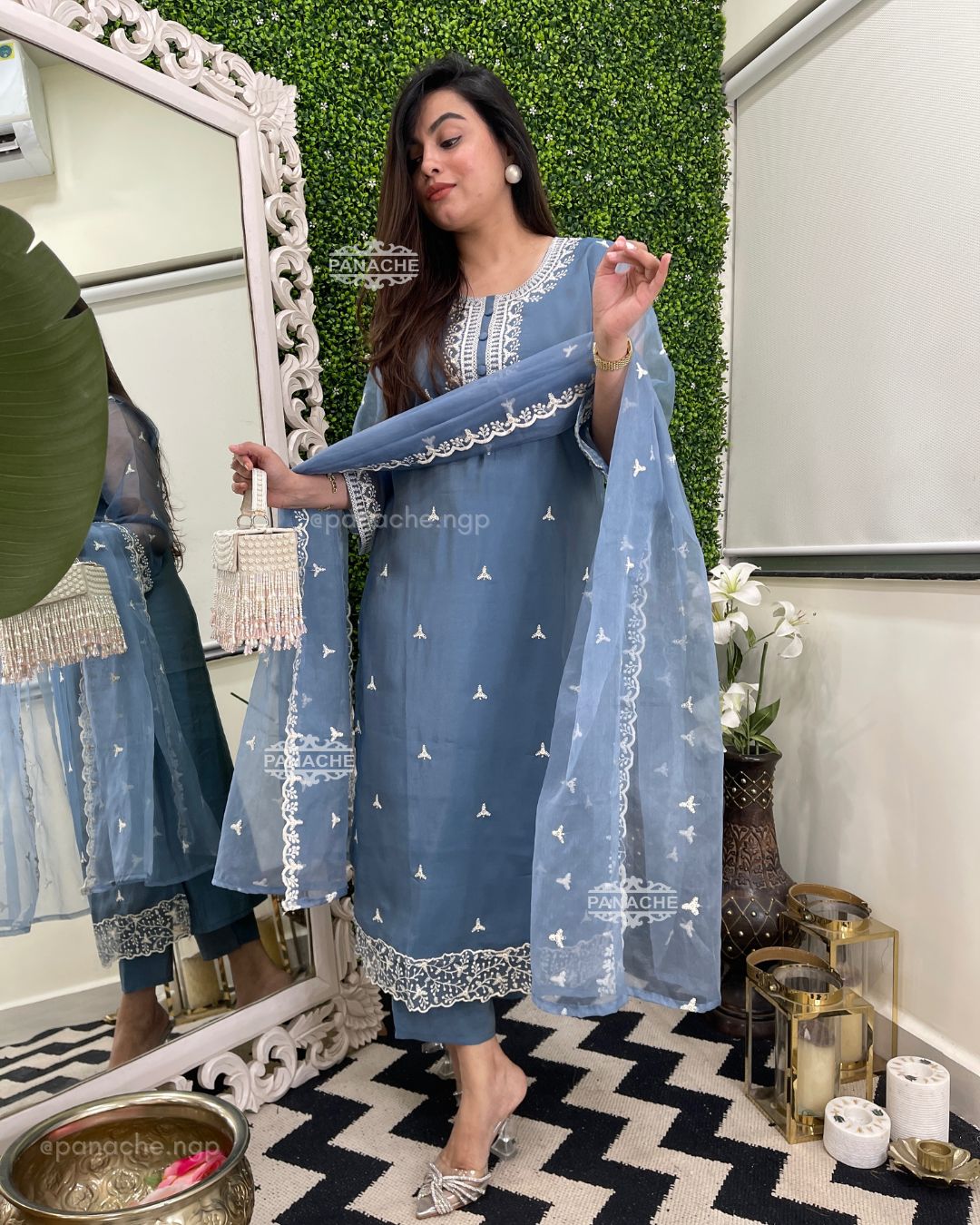🟣 Wear purpose, sequin highlights with white embroidery all over kurta dupatta and buttis