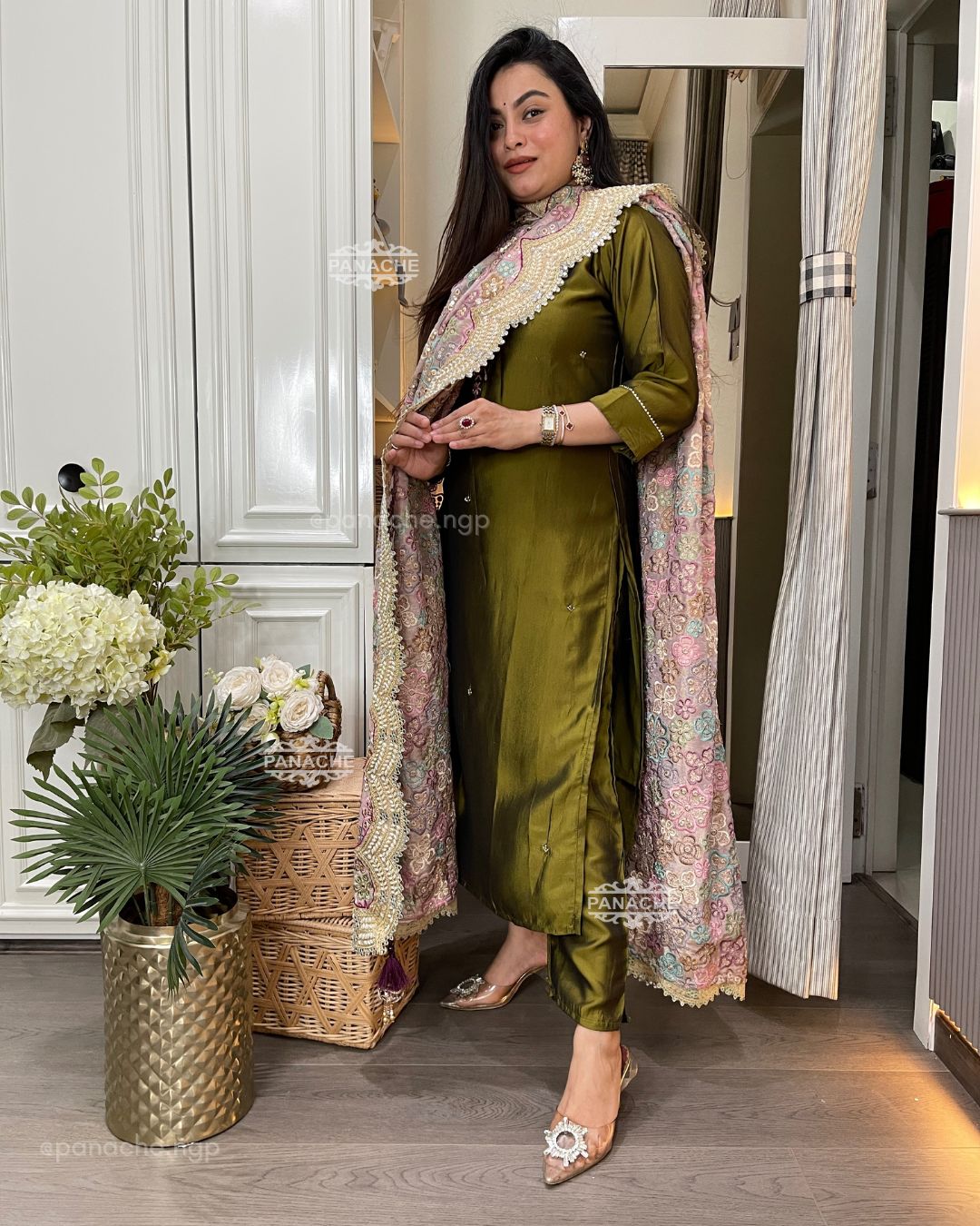 🟣 Real mirror work neckline in a 2 two tone kurta with a heavy jaal dupatta scalloped with pearls & real mirrors and hand made tassels
